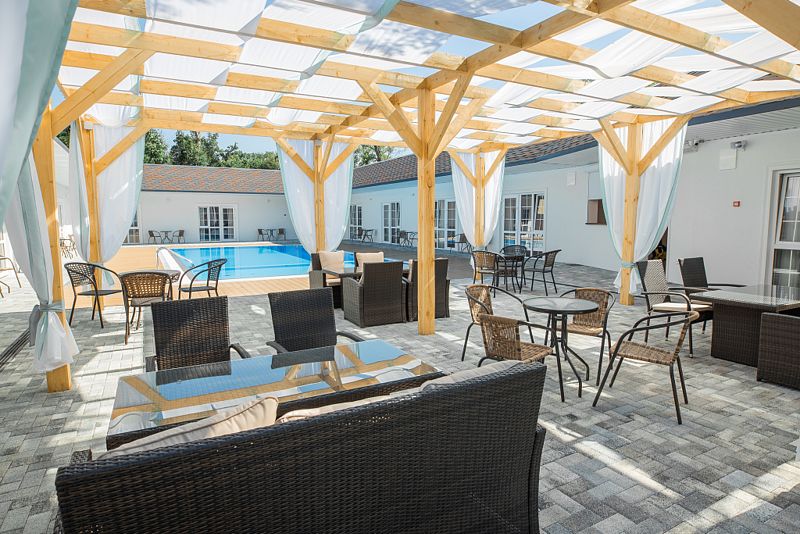 База отдыха подходит для семейного размещения. На территории имеются взрослый и детский бассейн, игровая зона, бар, зона отдыха. Завтраки входят в проживание.