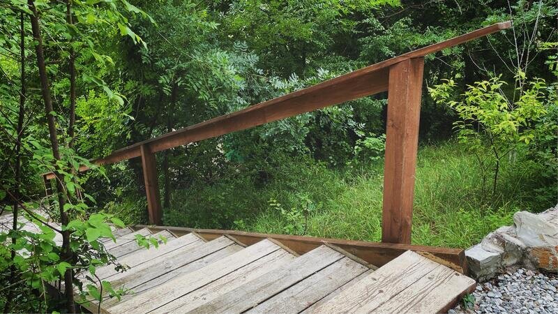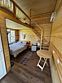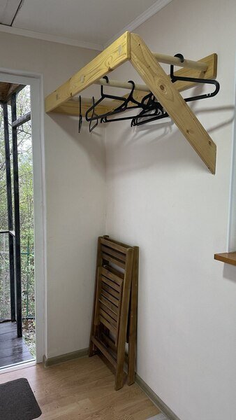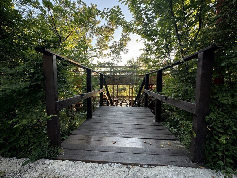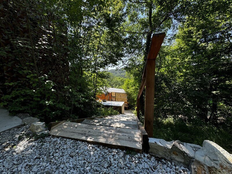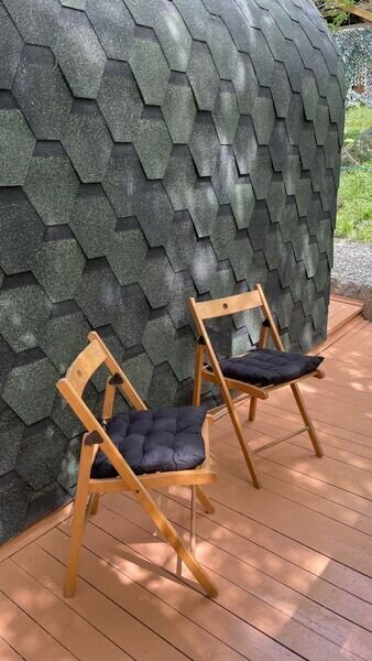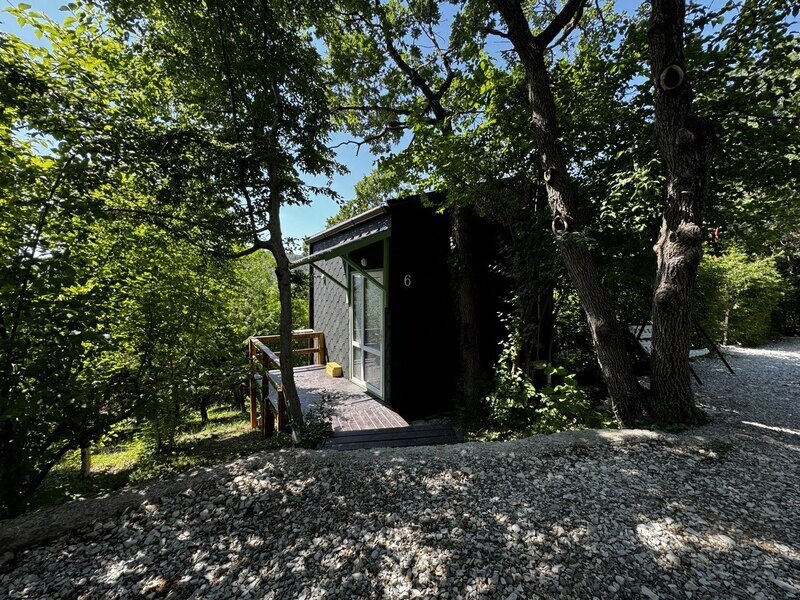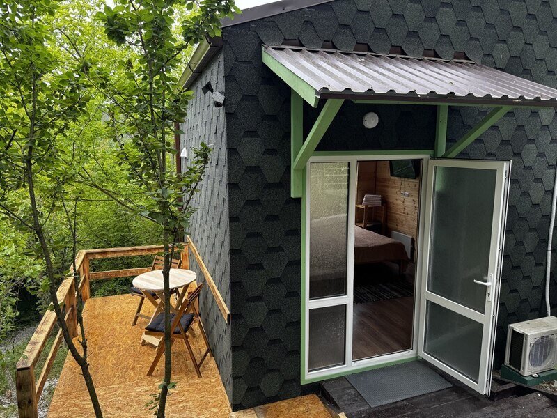 Этот уютный домик выполнен с использованием натуральных материалов и деревянных конструкций. Небольшая терраса — отличное место для утреннего кофе или вечерних посиделок на свежем воздухе.
