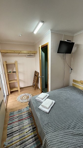 Двуспальная кровать, стеллаж для вещей, столик со стульями, качественное постельное белье и полотенца создают комфортные условия для отдыха. Наличие кондиционера, холодильника и телевизора добавляет удобства, а электрочайник позволяет наслаждаться горячими напитками в любое время.