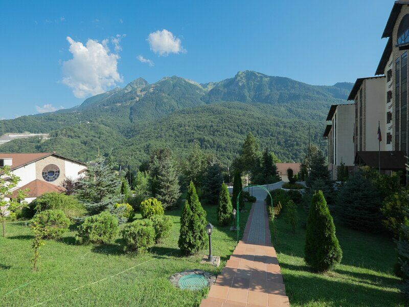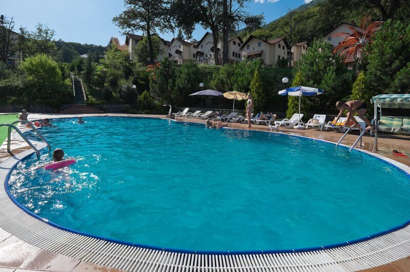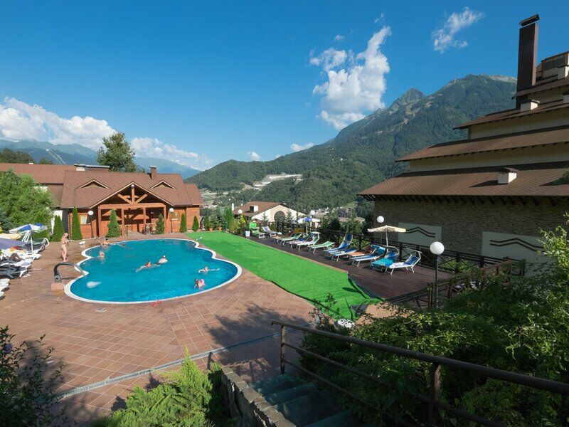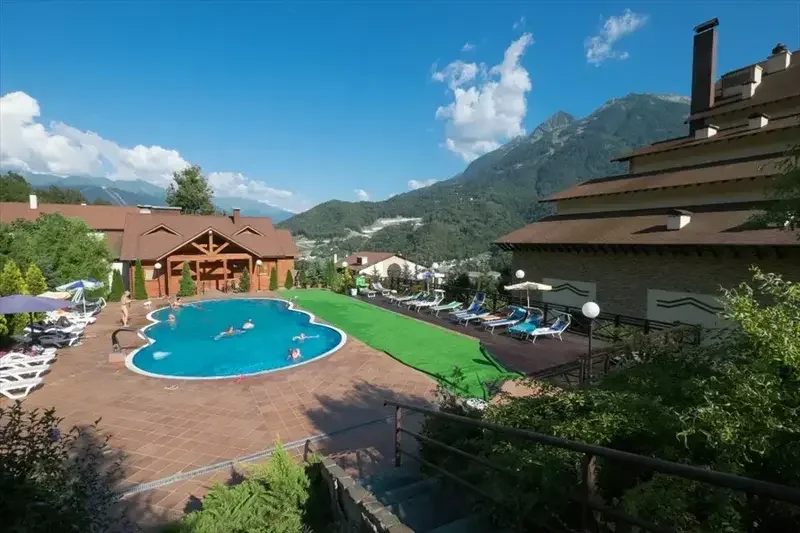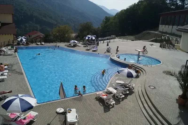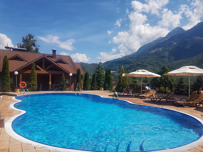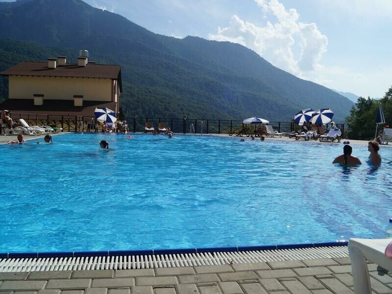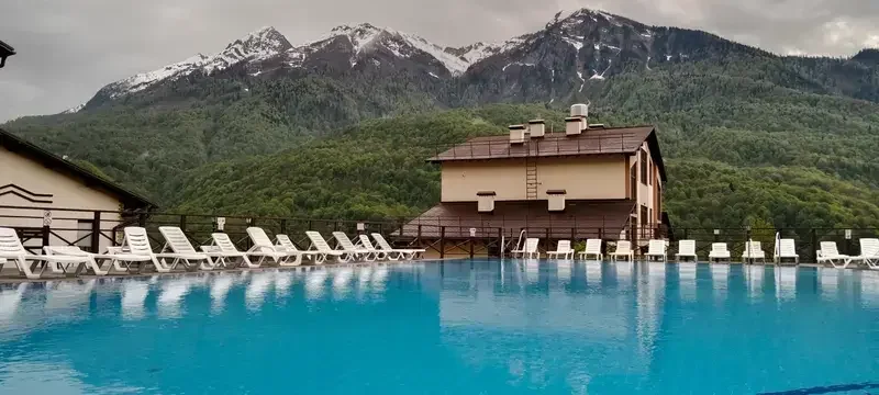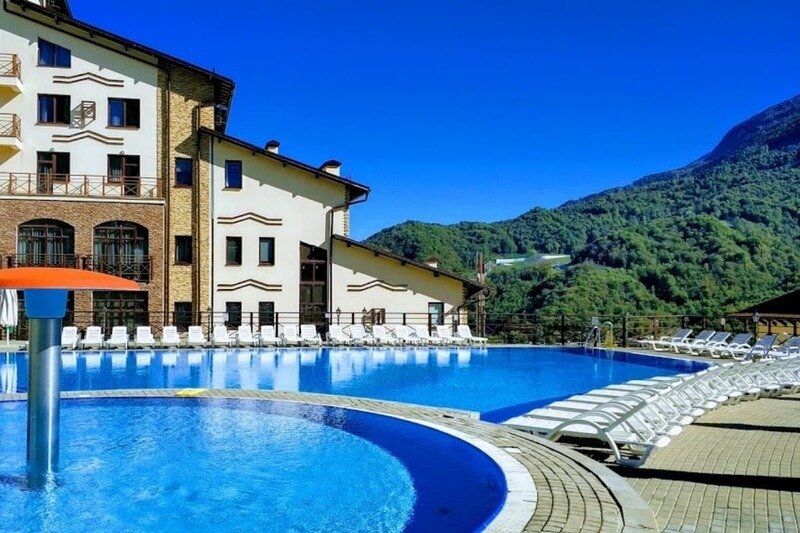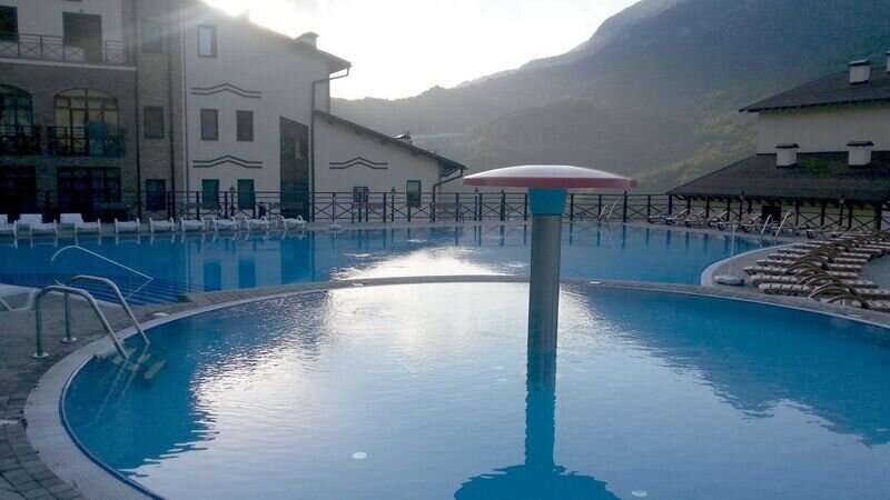 Из плюсов: Большая ухоженная красивая и зелёная территория, два бассейна для взрослых и один бассейн для детей, все бассейны отапливаемые, чистые. Много лежаков у бассейна, хватало всем. Изумительный вид на горы!🏔