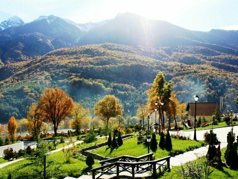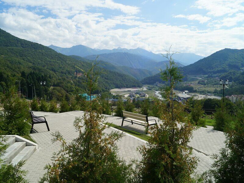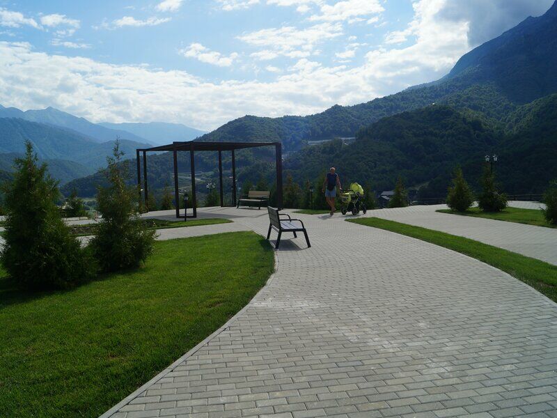 Рядом с отелем есть парк "Фруктовый сад" -посещение парка бесплатное для проживающих в комплексе. Есть смотровая площадка с видом на горы - отличная фотозона!
