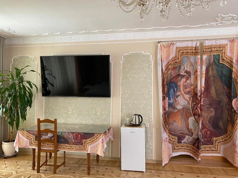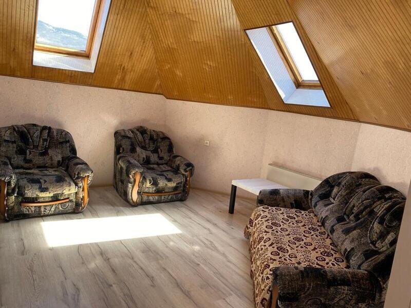 В апартаментах 2 комнаты, холл, кухня с прекрасным видом на горы, санузел. В каждой комнате (площадью 40м2): двуспальная кровать, и две односпальные кровати, ТВ, сплит, шкаф. В холле номера мягкая мебель.