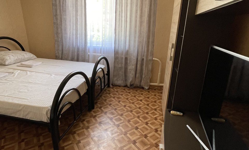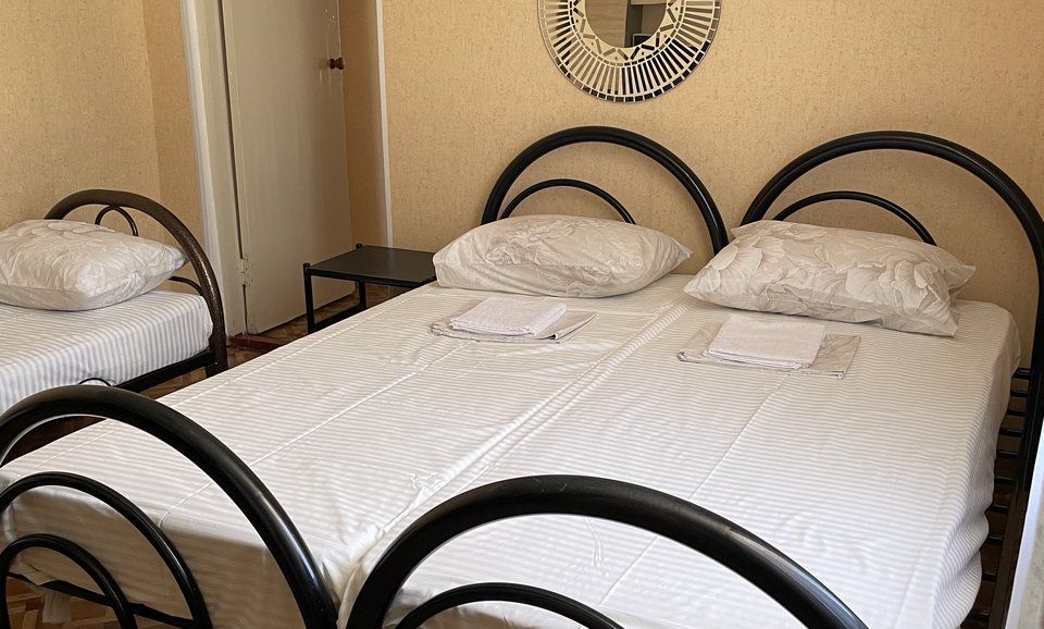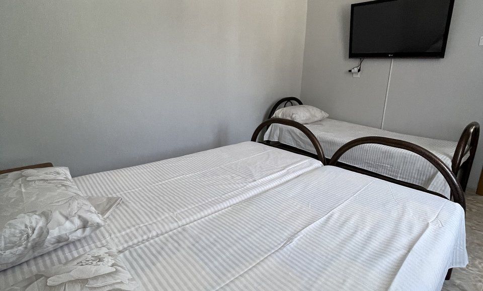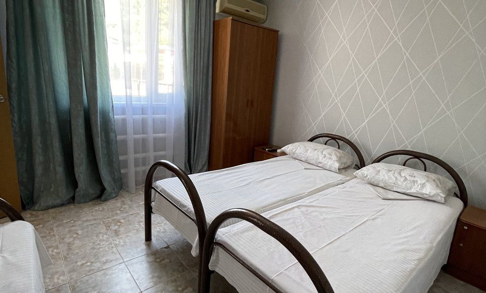 4-х местный номер эконом, две раздельные односпальные кровати и двуспальная кровать. Расположен на 3 этаже, оснащён ТВ. кондиционер. шкаф. тумбочки С/У общий, раздельный на этаже.