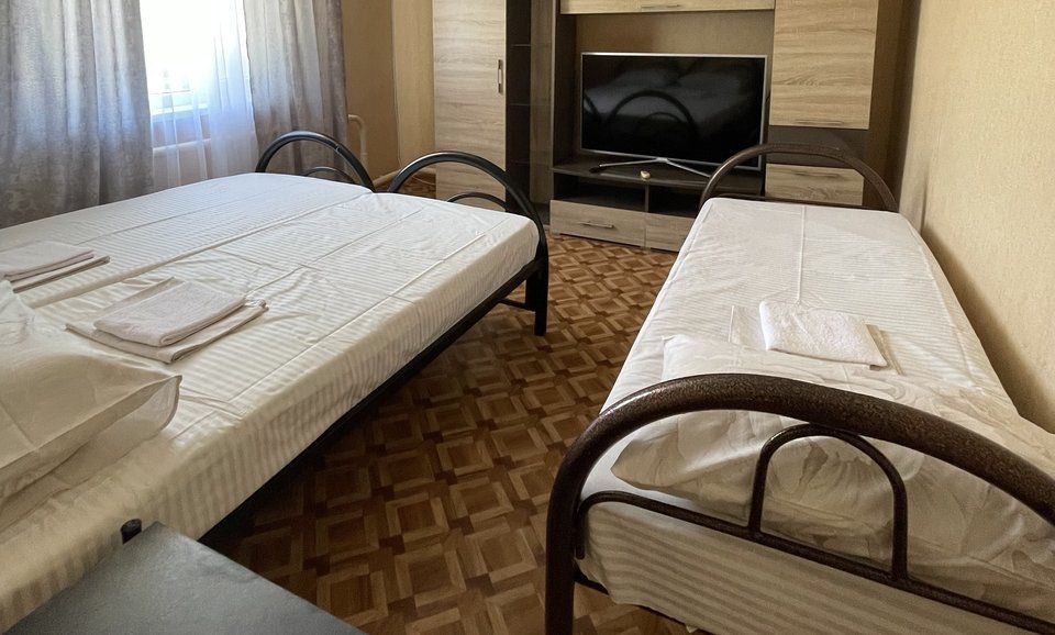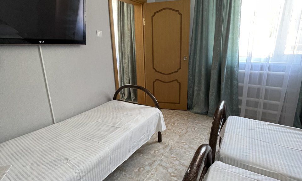 3-х местный номер эконом с двуспальной кроватью и односпальной кроватью. Оснащён: кондиционер. тв. шкаф. тумбочки. С/У общий, раздельный, на этаже.