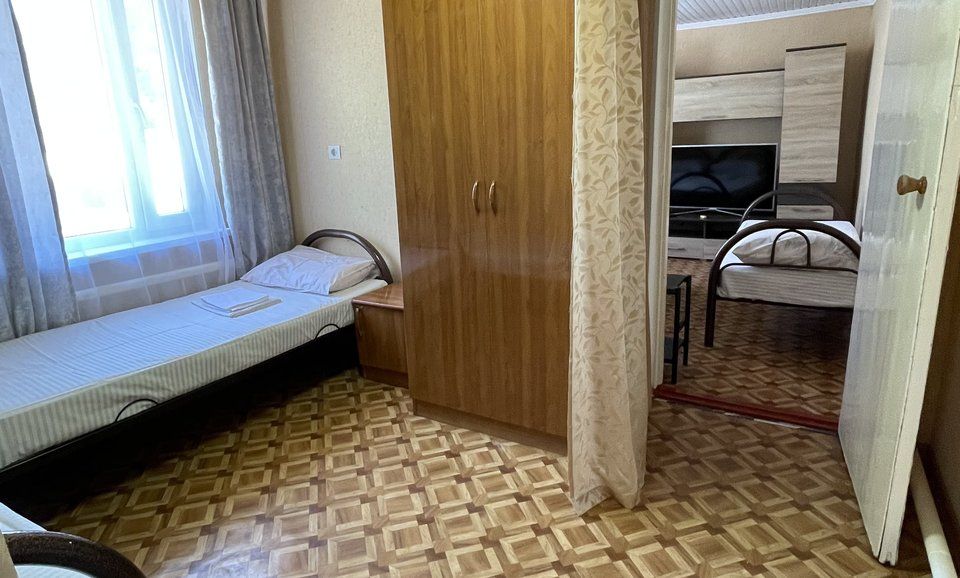 3-х комнатный семейный номер с удобствами, расположен на 1 этаже, отдельный вход с улицы. Оснащен двуспальной кроватью и односпальными, тв. кондиционер. шкаф. тумбочки. Холодильник, общий холл с гладильными принадлежностями.