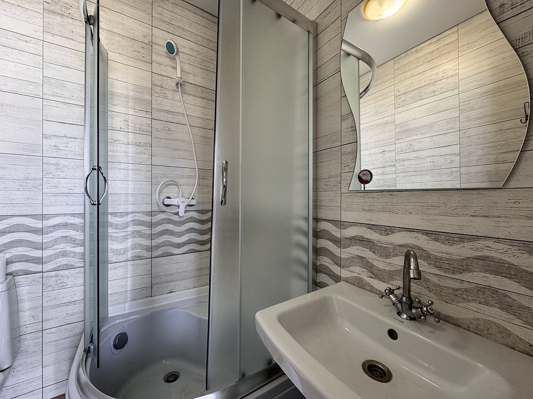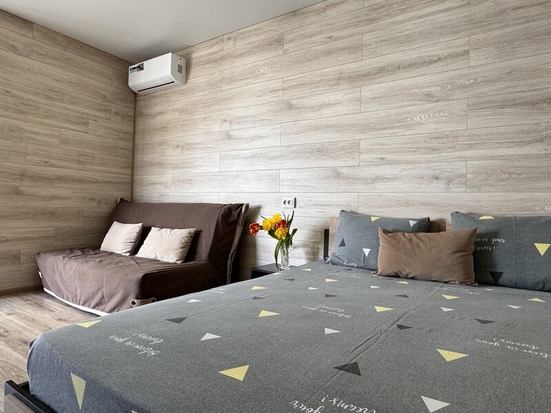 Номер оборудован: двуспальная кровать, диван-кровать, прикроватные тумбочки, зеркало, шкаф, журнальный столик, мини-холодильник, телевизор, кондиционер. Ванная комната: душ, зеркало, раковина и туалет.