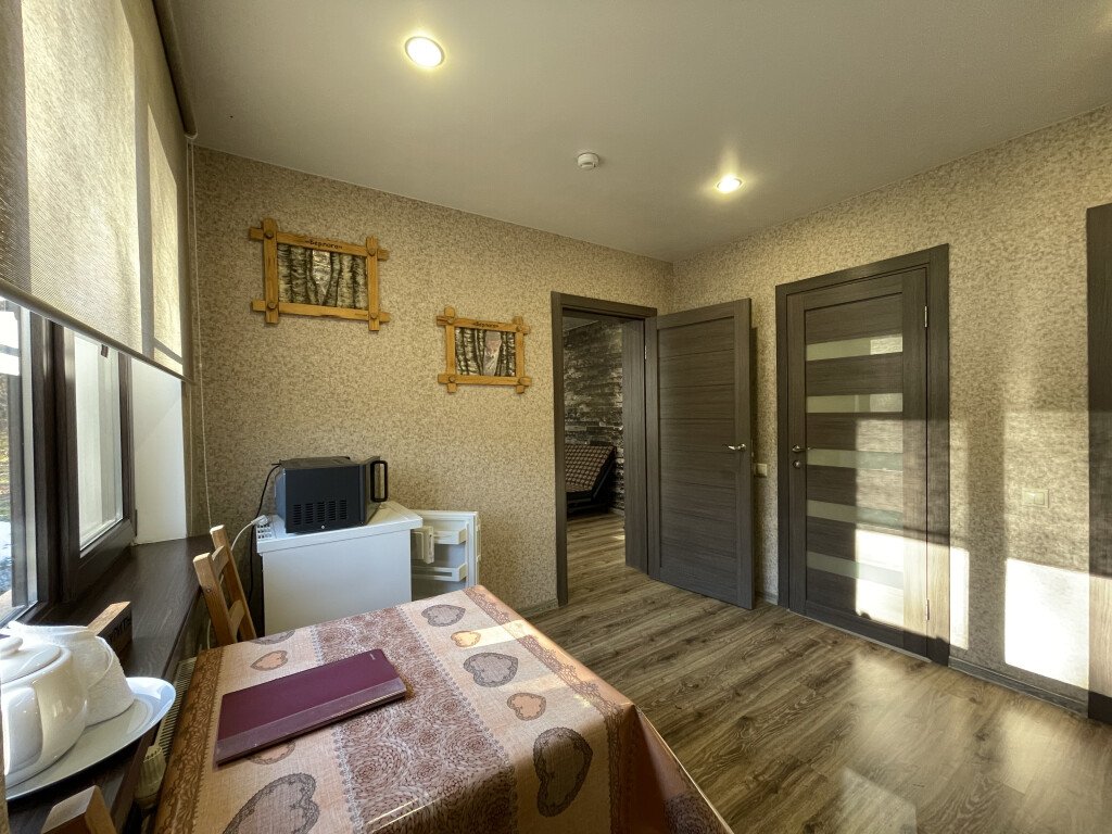 Номер для троих с двумя комнатами - спальней в которой находится большая двуспальная кровать и одним полуторным раскладным диваном, и кухней, в которой расположены холодильник, обеденная зона, кухонный гарнитур с электрическими конфорками и всей необходимой посудой. В номере своя ванная комната с душевой и сан.узлом. Полотенца, гели для душа, шампуни, мыло предоставляются по количеству проживающих. У номера своя открытая терраса со столиком и лавочками.
