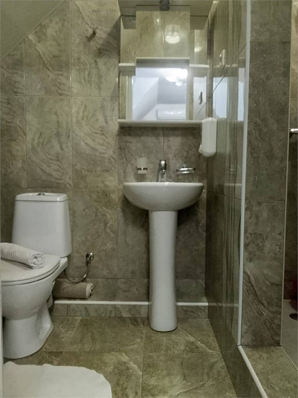 фен, банные принадлежности, банные полотенца, гигиенические средства, косметические средства, унитаз, раковина, душ, туалетные средства, туалет, сплит-система, телевизор с плоским экраном, мини-холодильник, мылоВ гостиничном номере