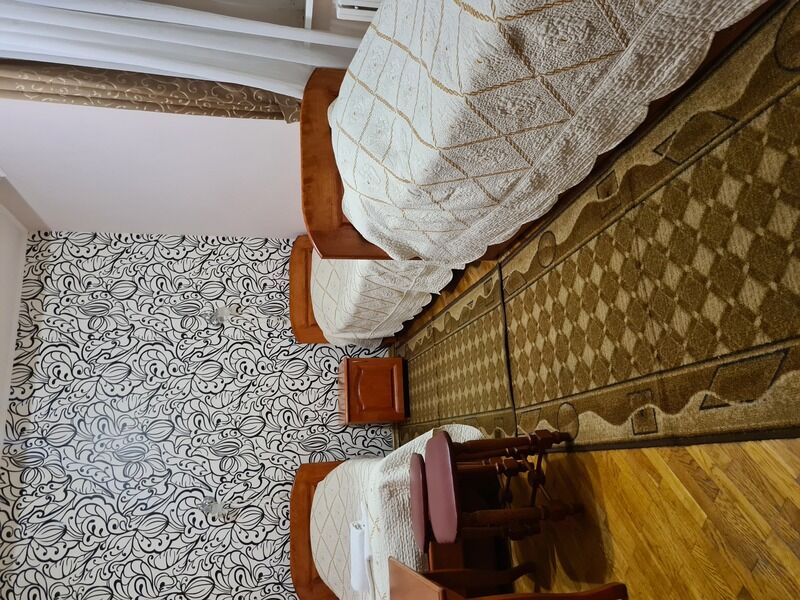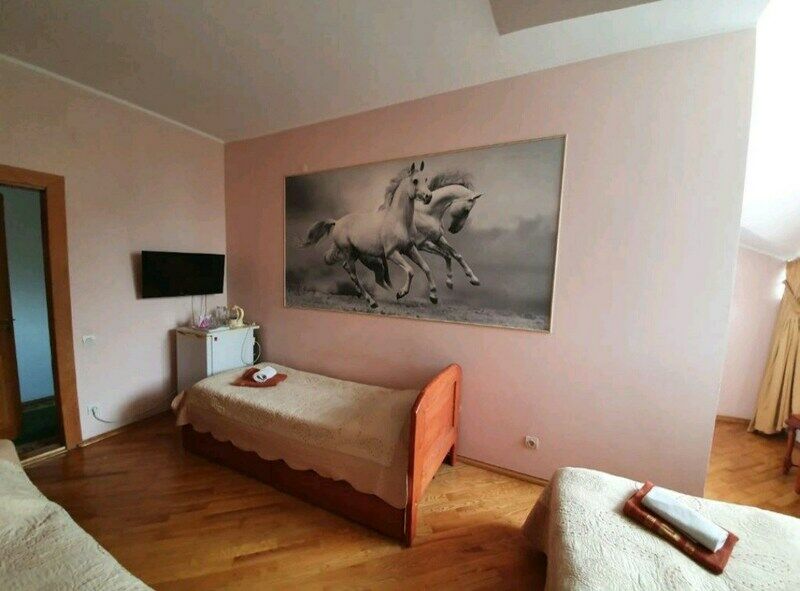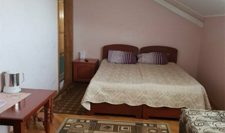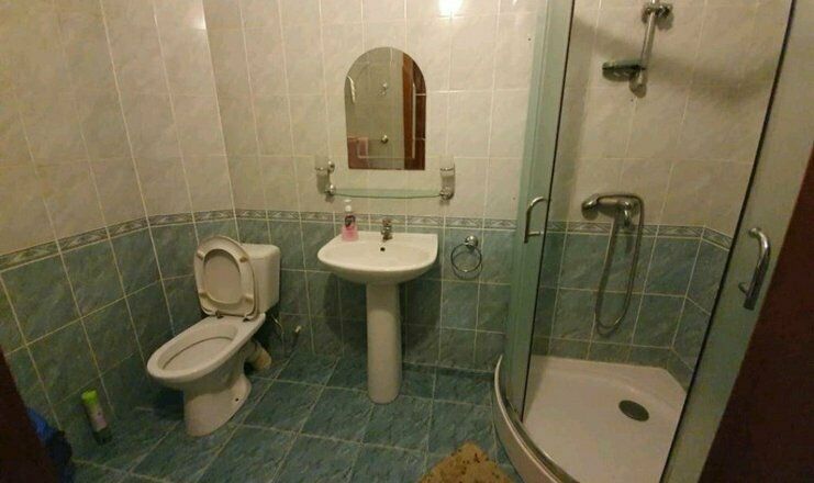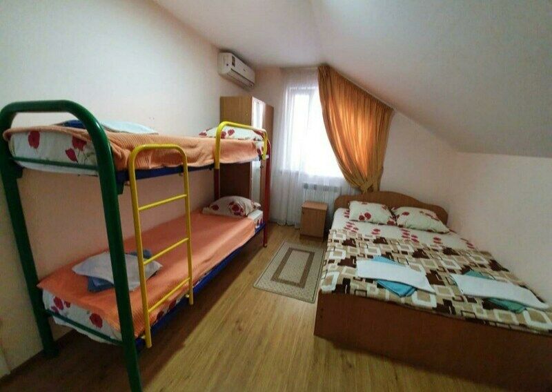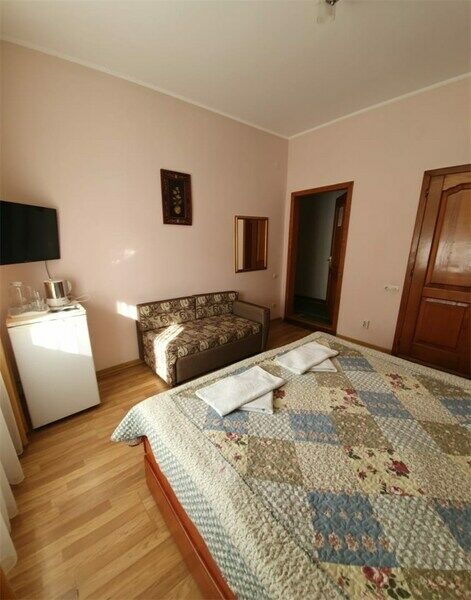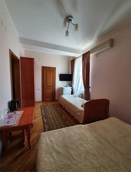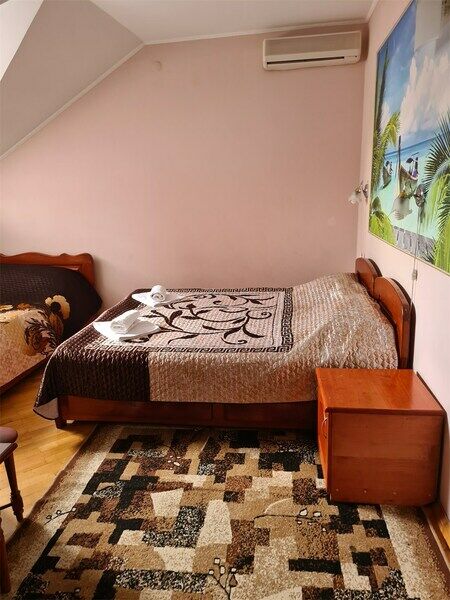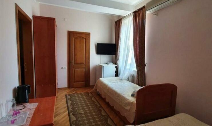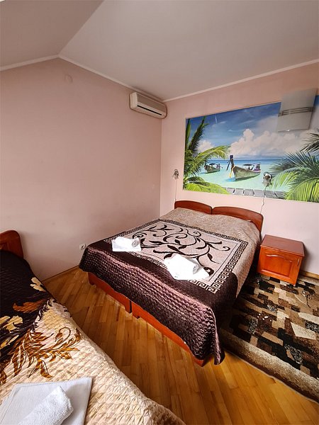 Кровать двуспальная, две кровати односпальные, тумбочки прикроватные, шкаф, журнальный стол, холодильник, кондиционер, телевизор, чайник, санузел (душ+туалет)
