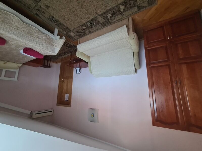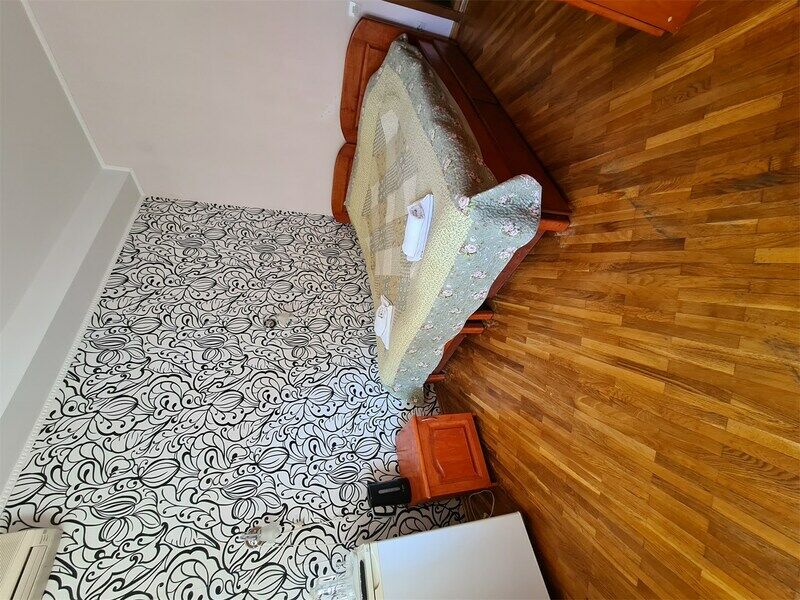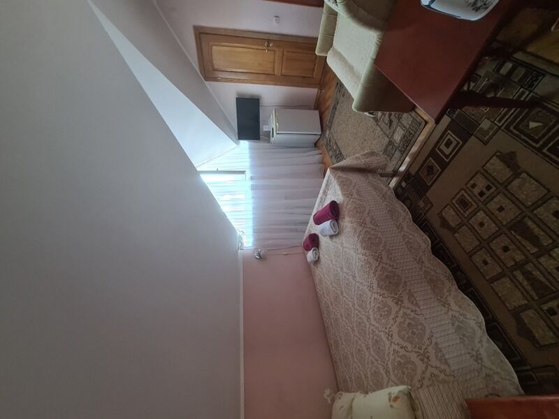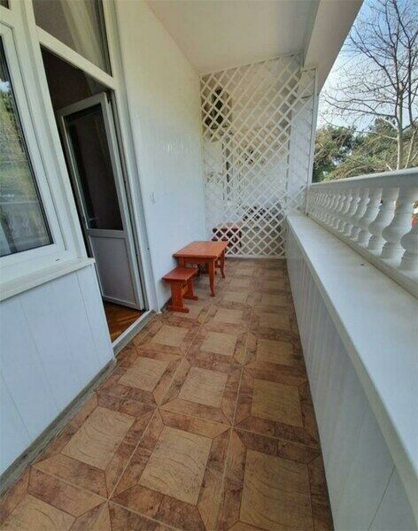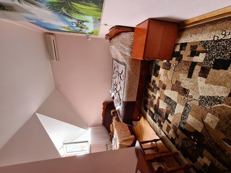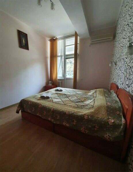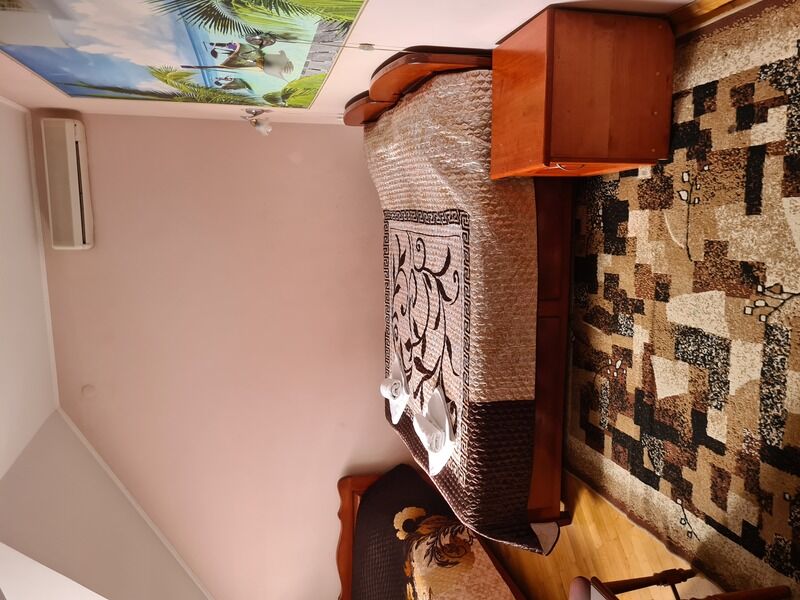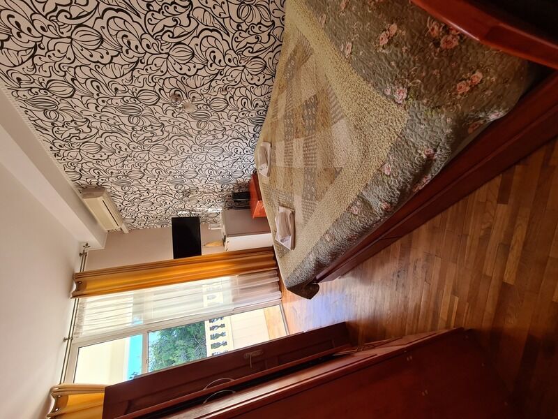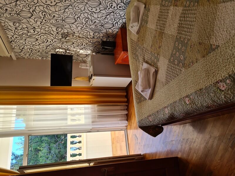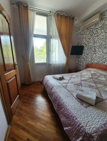 Кровать двуспальная большая, диван-кровать, тумбочки прикроватные, шкаф, журнальный стол, холодильник, кондиционер, телевизор, чайник, санузел (душ+туалет), балкон