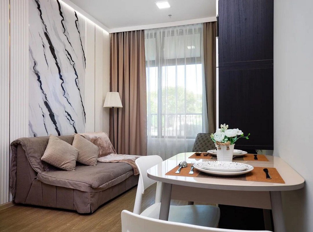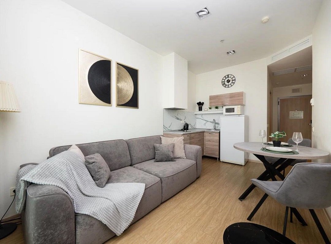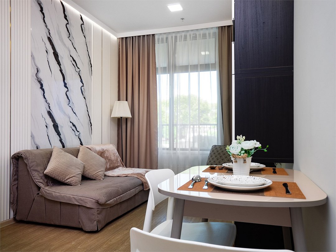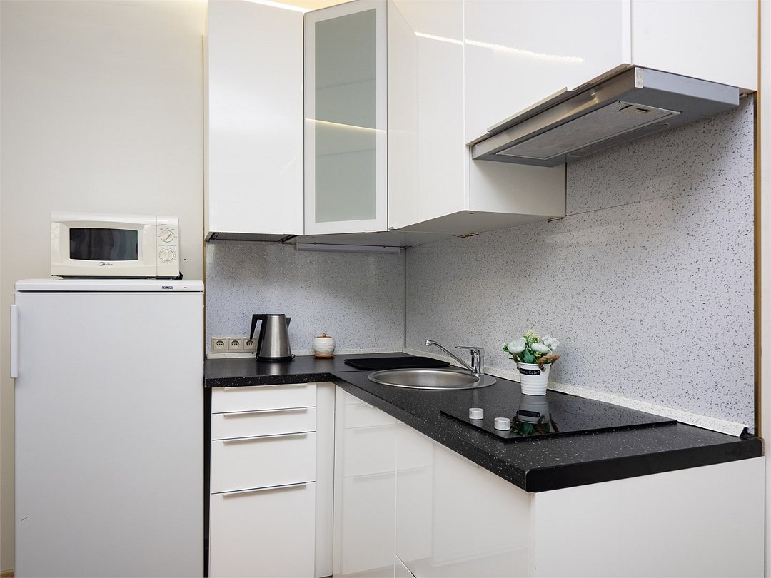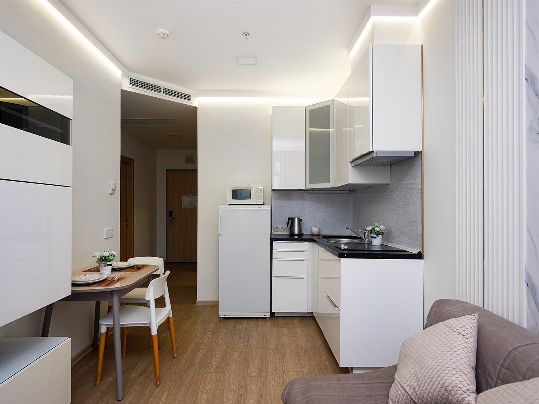 - Комфортное размещение в апартаментах разной площади (от 50 кв м) с кухнями, оборудованными бытовой техникой