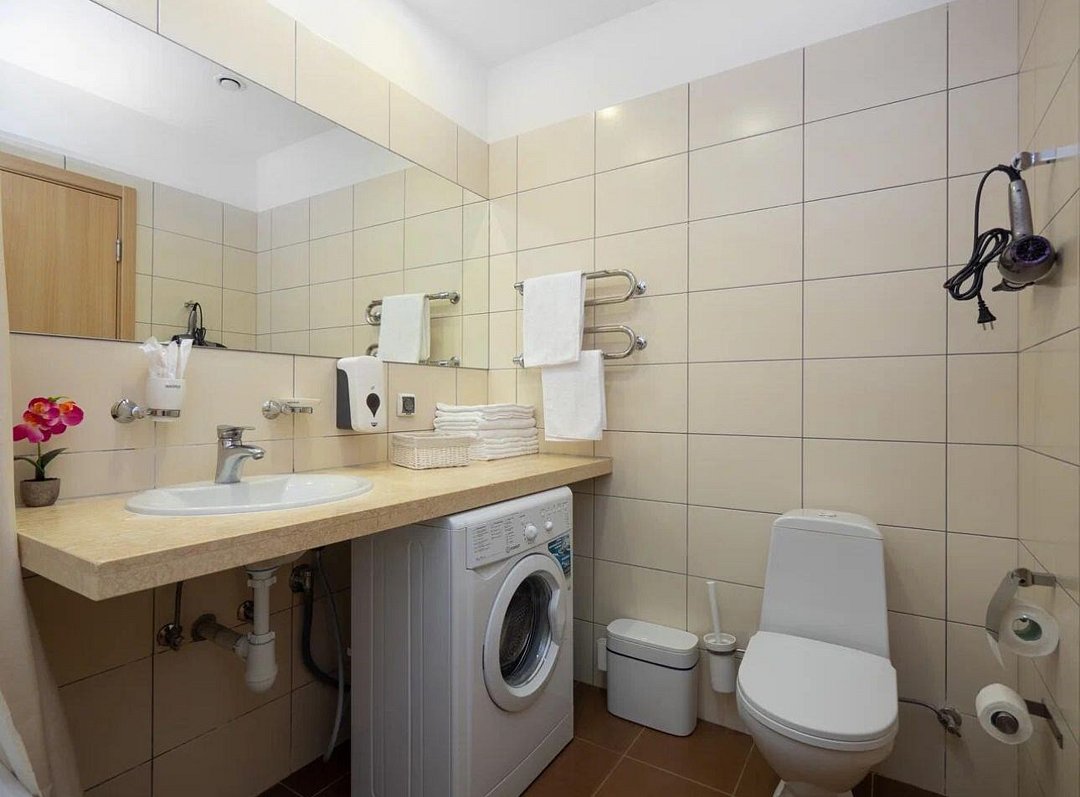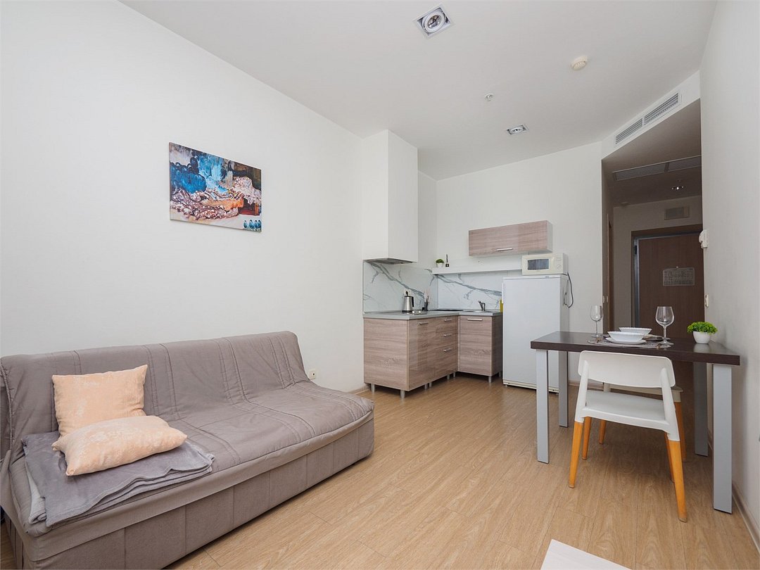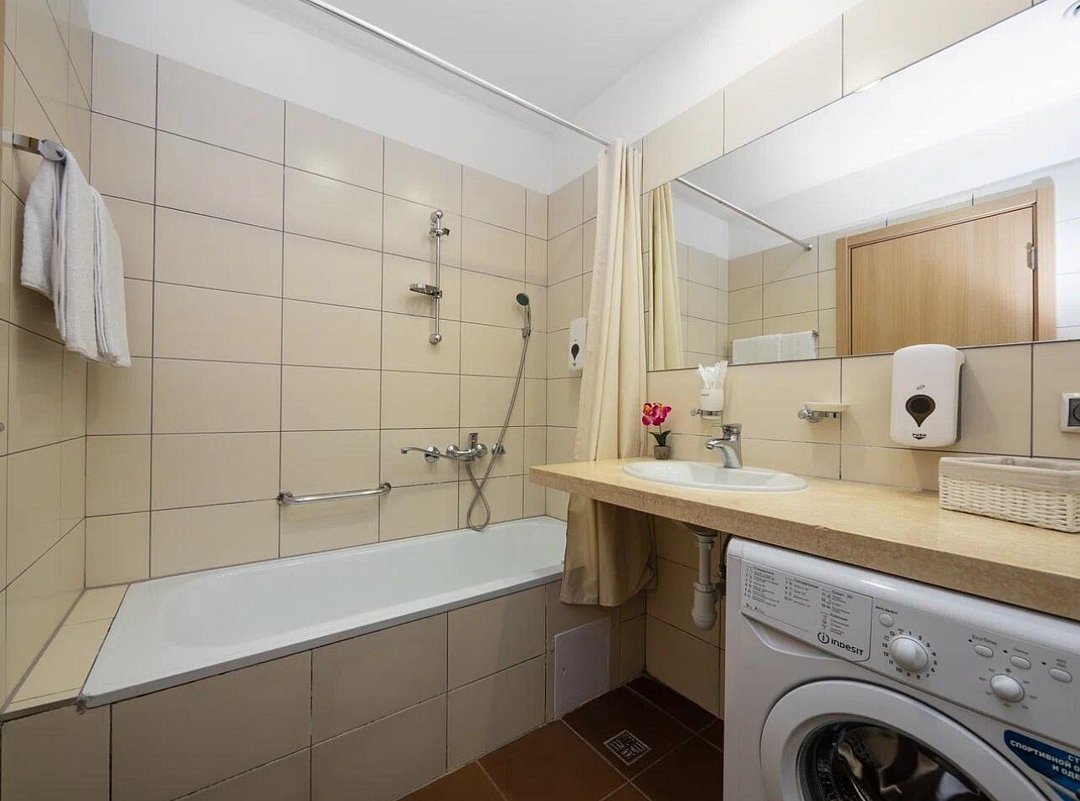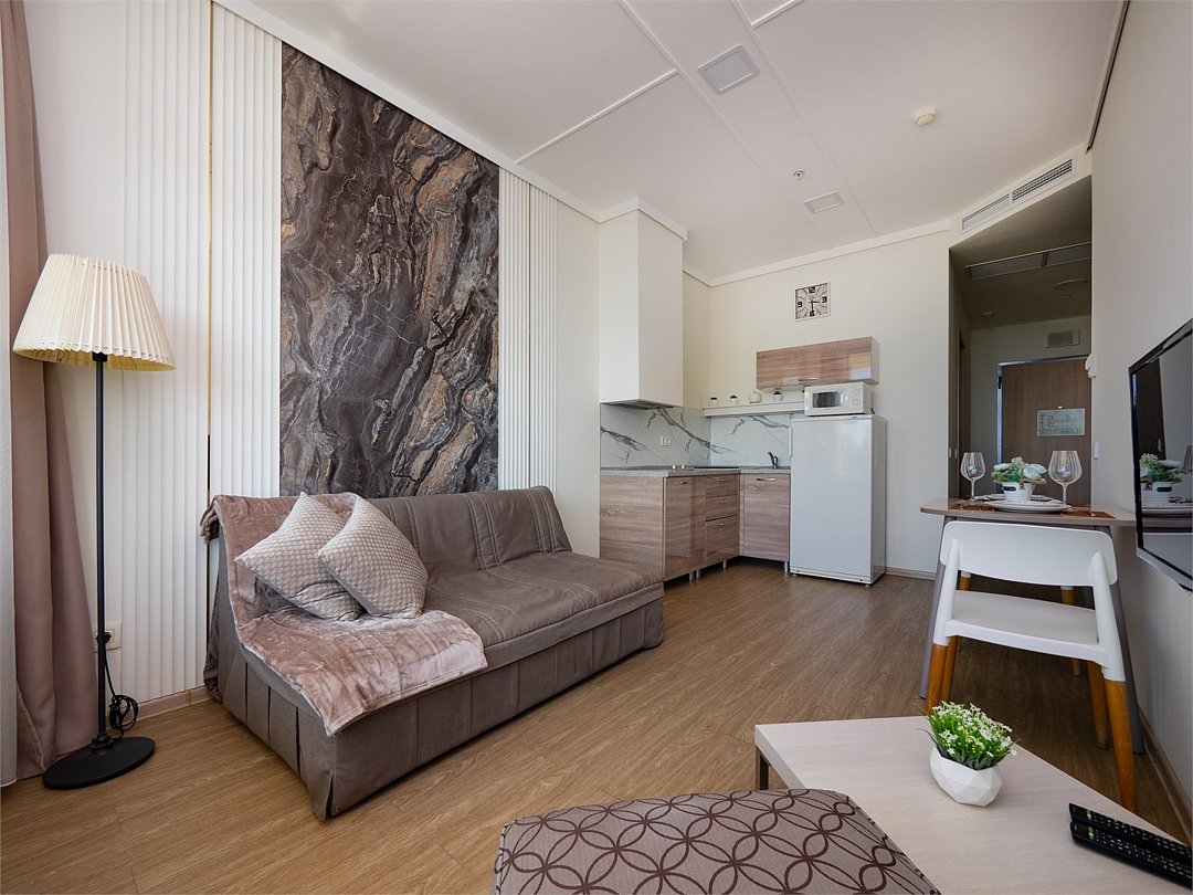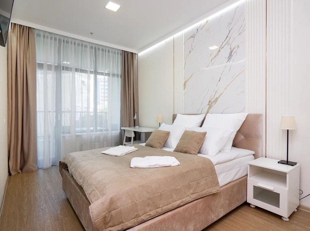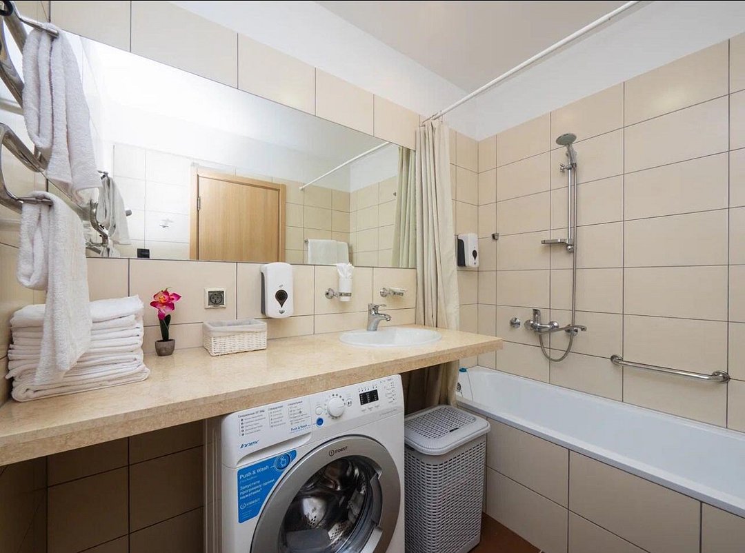 * Апартамент с полным оснащением: кондиционер, ТВ, Wi-Fi, электроплита, микроволновая печь, чайник, холодильник, мультиварка, посуда, стиральная машина, фен и другие удобства.