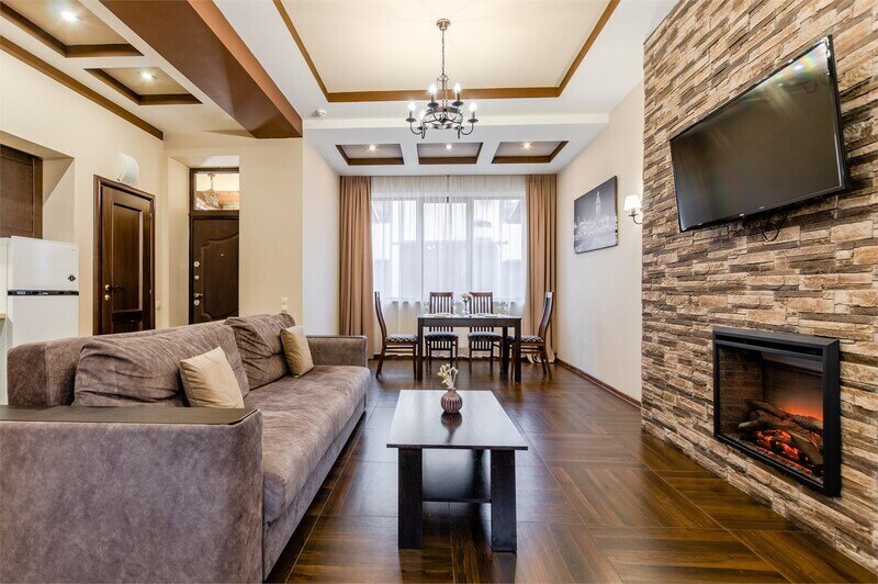 Путешествие с семьейЖить хорошо! А хорошо жить - ещё лучше!Доброго дня, всем! Как театр начинается с вешалки, так любая гостиница начинается с рецепции. Сразу, в начале рассказа, хочу отметить и поблагодарить девушек с рецепции, которые вас встречают и провожают, решают возникающие вопросы и стараются сделать ваш отдых максимально комфортным! Это как раз то место, где именно так и происходит! Ни одна просьба не осталась незамеченной, за что большое спасибо! Так.. Выходим с рецепции и идём в номер, который здесь представлен двухэтажным блоком в таунхаусе.. И здорово представлен, хочу вам сказать! Внутри есть всё, что может понадобиться: тапочки, косметика для ванны, несколько телевизоров и прекрасная терраса с мангалом! Несколько ванных и уборных комнат и конечно просторная гостиная! В общем проживание очень комфортно, в независимости от времени года! Из минусов могу отметить только отсутсвие собственного кафе или столовой (хотя кому то это плюс)); небольшую нерасторопность уборщицы (уборка средняя, но только уборка, так как полотенца и белье абсолютно чистые) и цена (стоимость проживание не гуманная)! Но.. В нашей стране любят драть деньги не за что, так что обычно приходится мирится с этим, если хочешь жить и отдыхать по красоте! В итоге: однозначно рекомендую к проживанию!