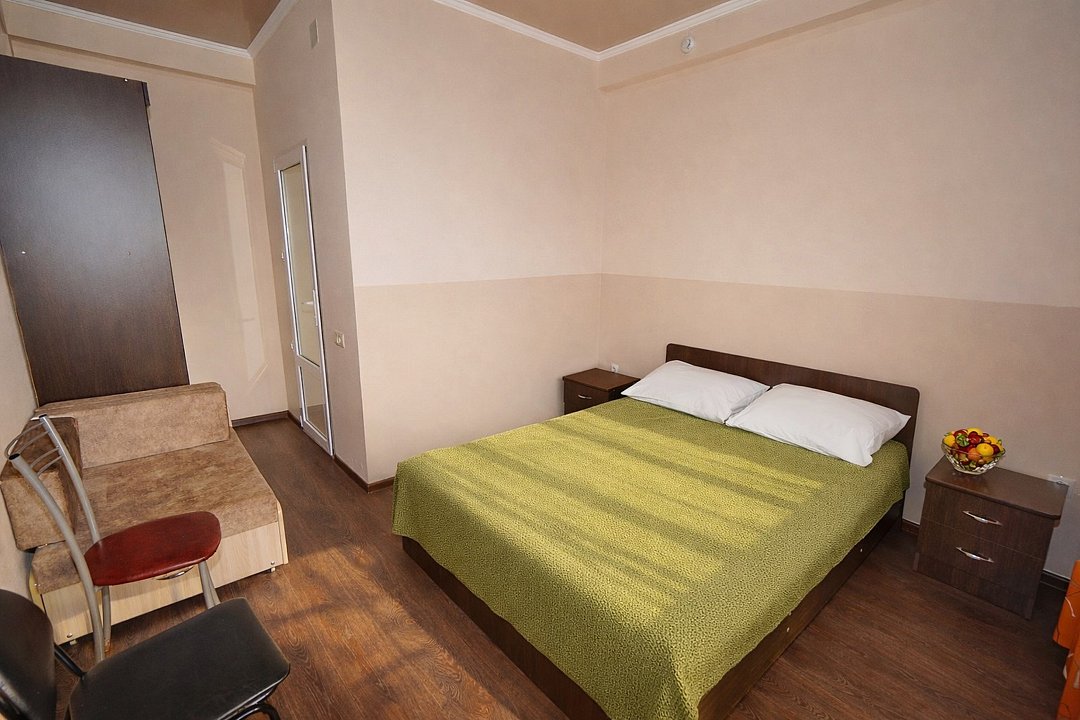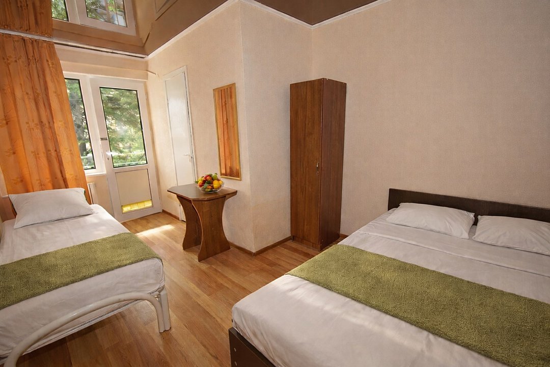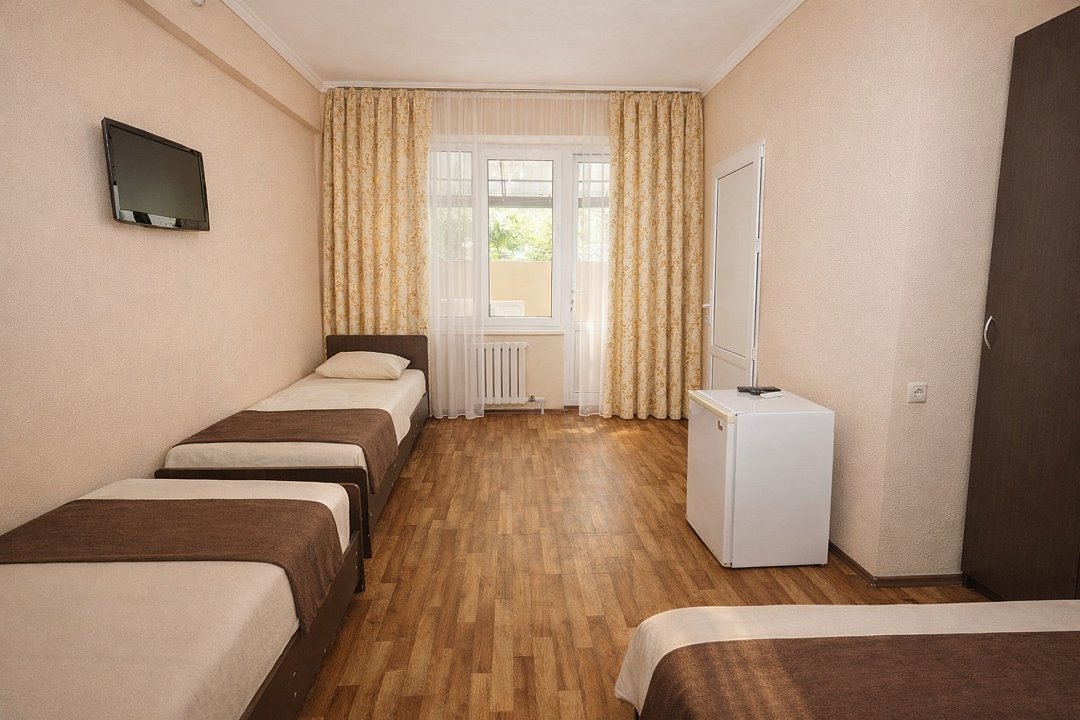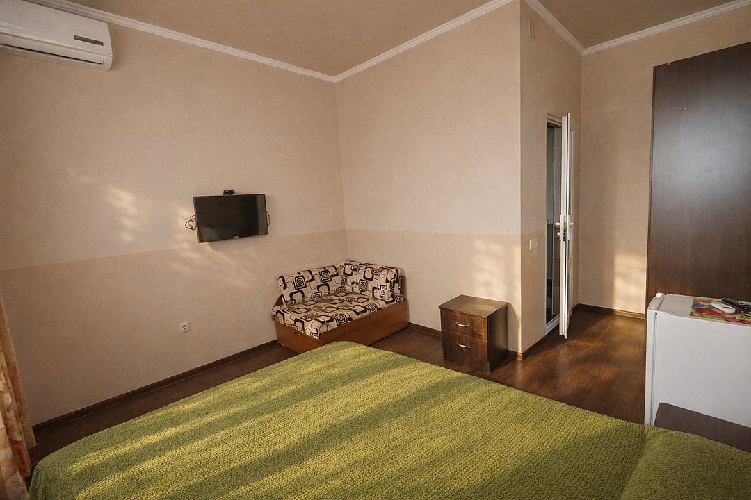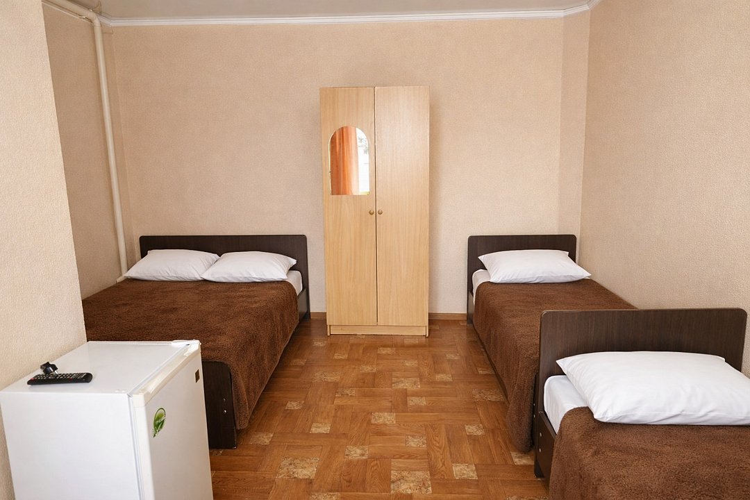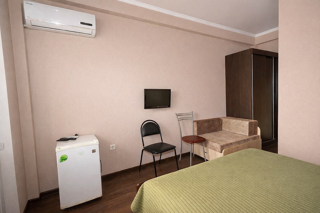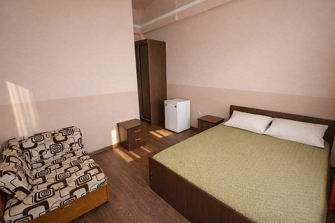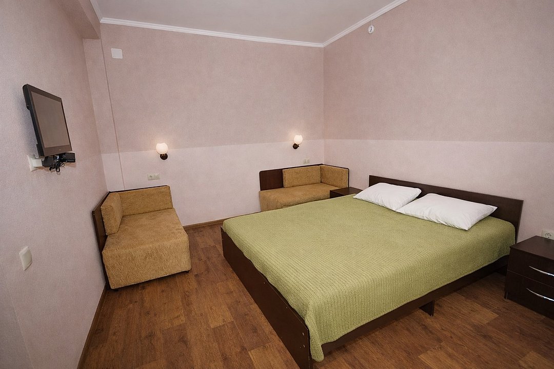 Трехместный номер "Стандарт" со всем необходимым для комфортного проживания: душ и туалет, кондиционер, телевизор, холодильник. Мебель: Двухспальная кровать, диван-кровать или односпальная кровать, комод, шкаф, прикроватные тумбы, зеркало, стул и стулья.Услуги и удобства