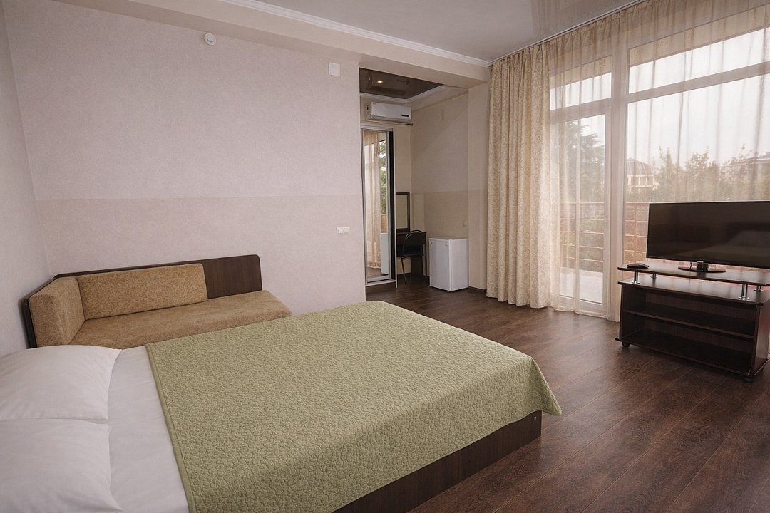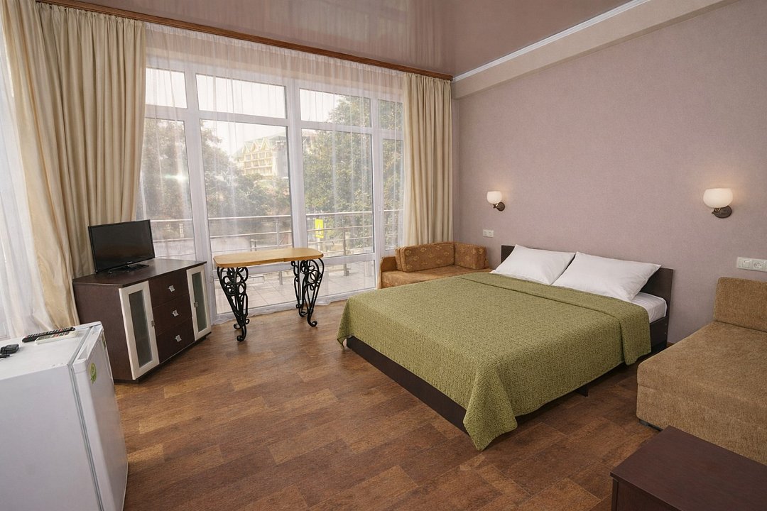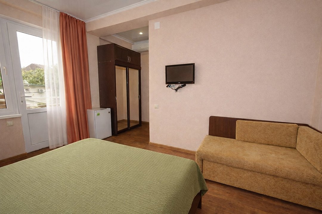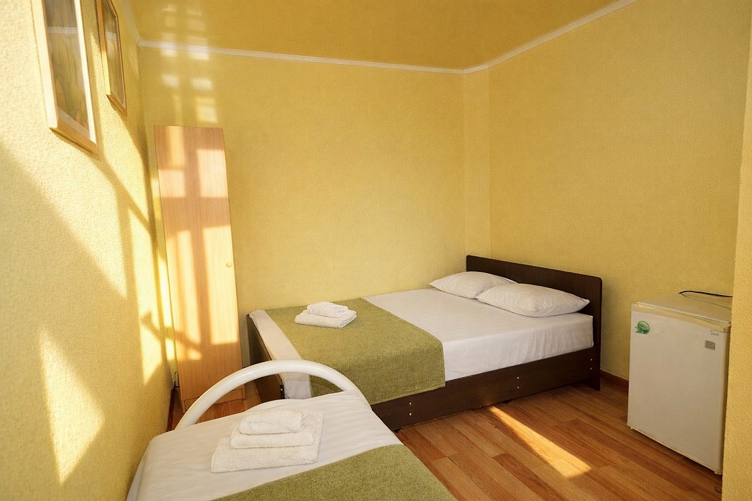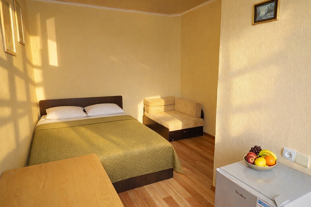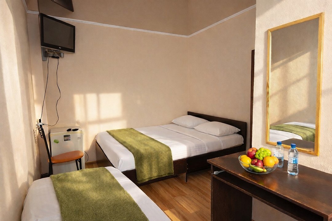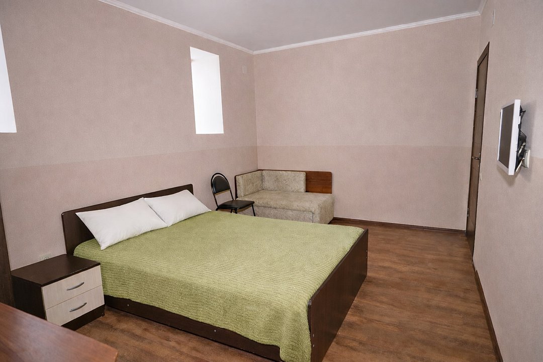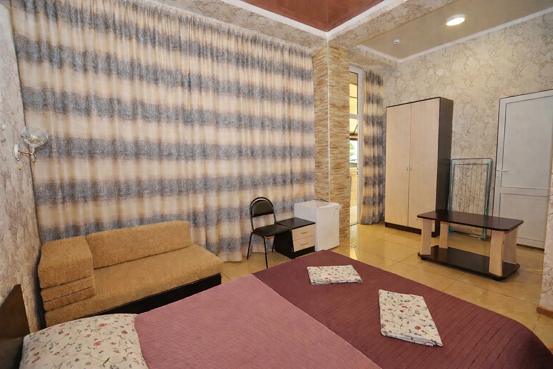 Трехместный номер "Стандарт" со всем необходимым для комфортного проживания: душ и туалет, кондиционер, телевизор, холодильник. Мебель: Двухспальная кровать, диван-кровать или односпальная кровать, комод, шкаф, прикроватные тумбы, зеркало, стул и стулья.Услуги и удобства