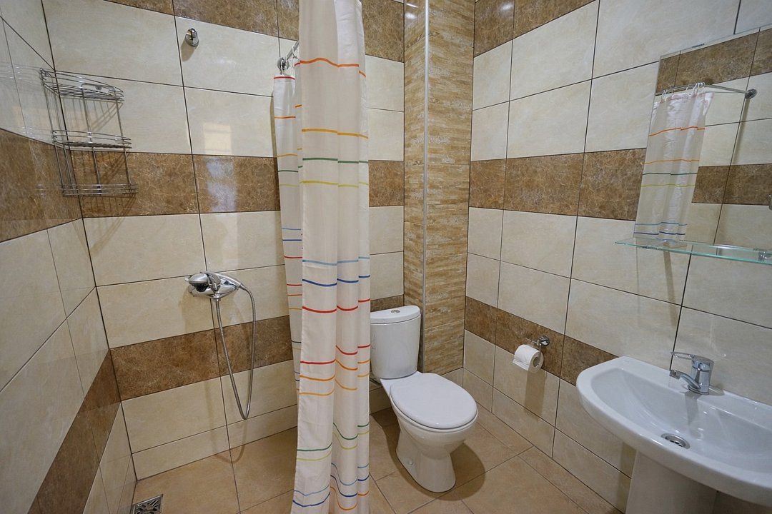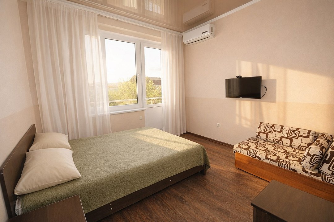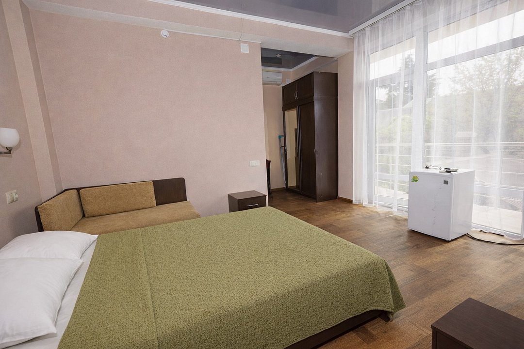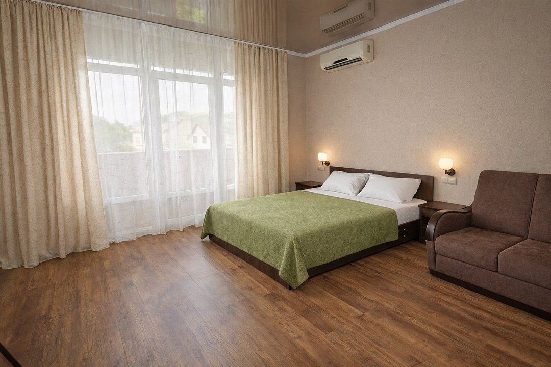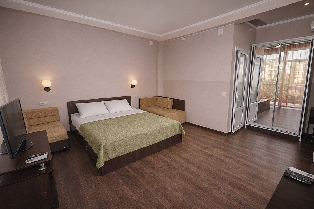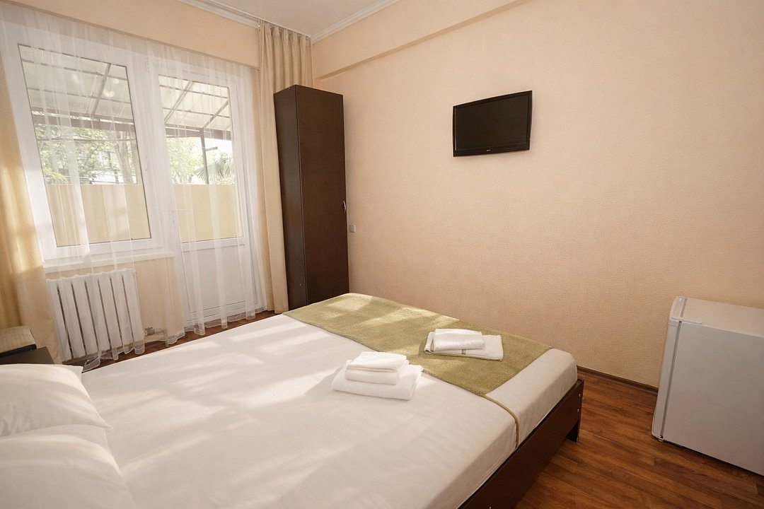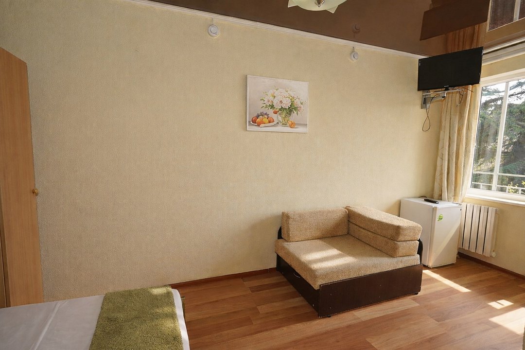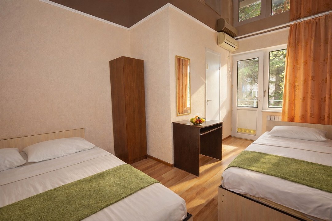 Трехместный номер "Стандарт" со всем необходимым для комфортного проживания: душ и туалет, кондиционер, телевизор, холодильник. Мебель: Двухспальная кровать, диван-кровать или односпальная кровать, комод, шкаф, прикроватные тумбы, зеркало, стул и стулья.Услуги и удобства
