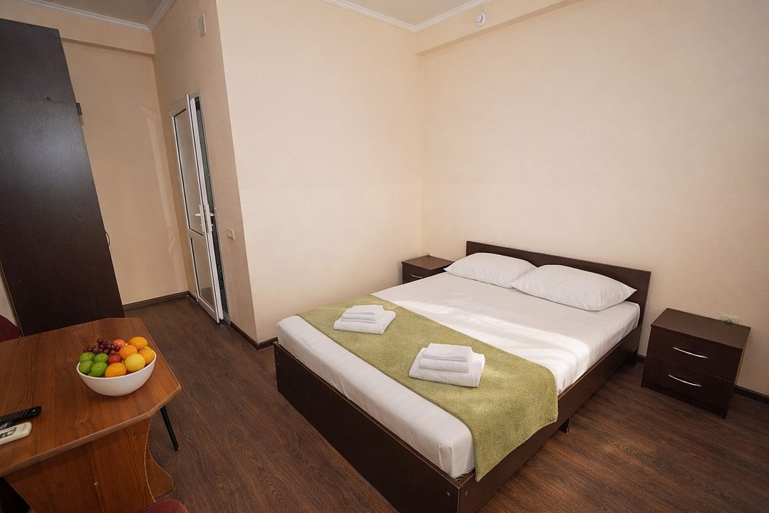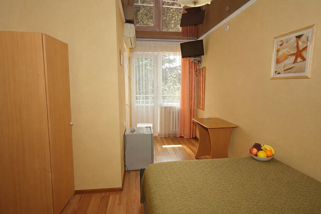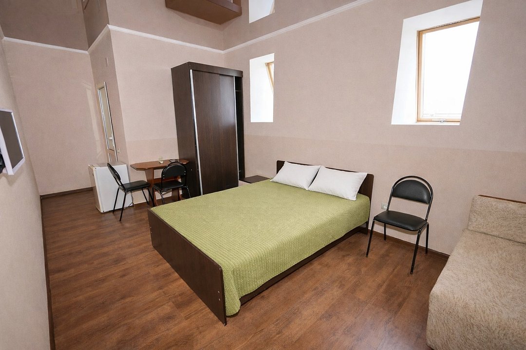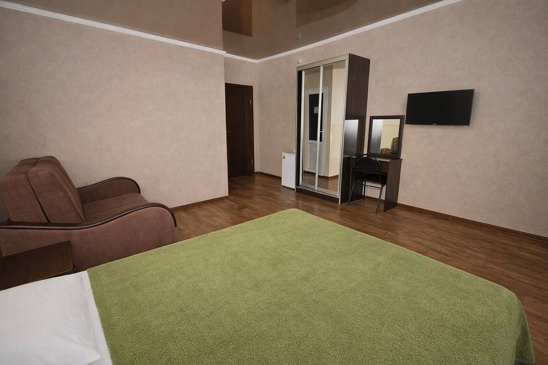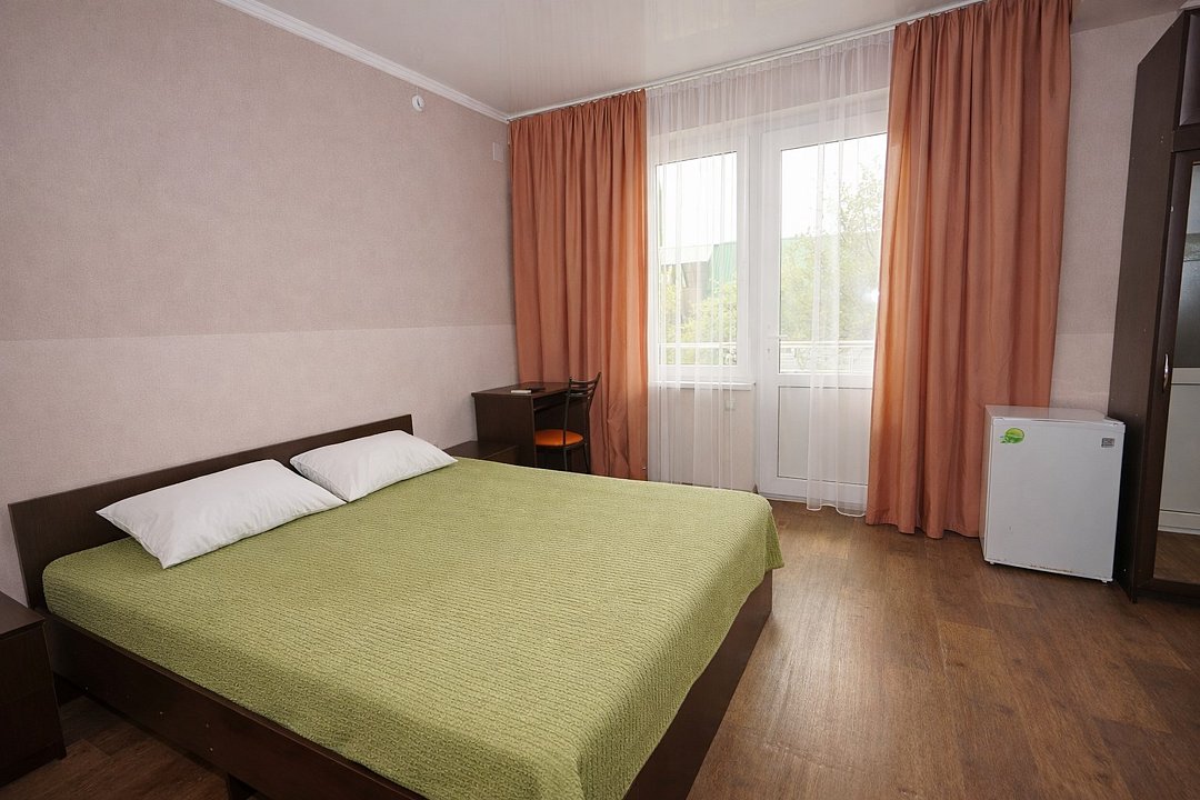Четырехместный "Стандарт" со всем необходимым для комфортного проживания: душ и туалет, кондиционер, телевизор, холодильник. Мебель: Двухспальная кровать, два раздельных спальных места, комод, шкаф, прикроватные тумбы, зеркало, стул и стулья.Услуги и удобства