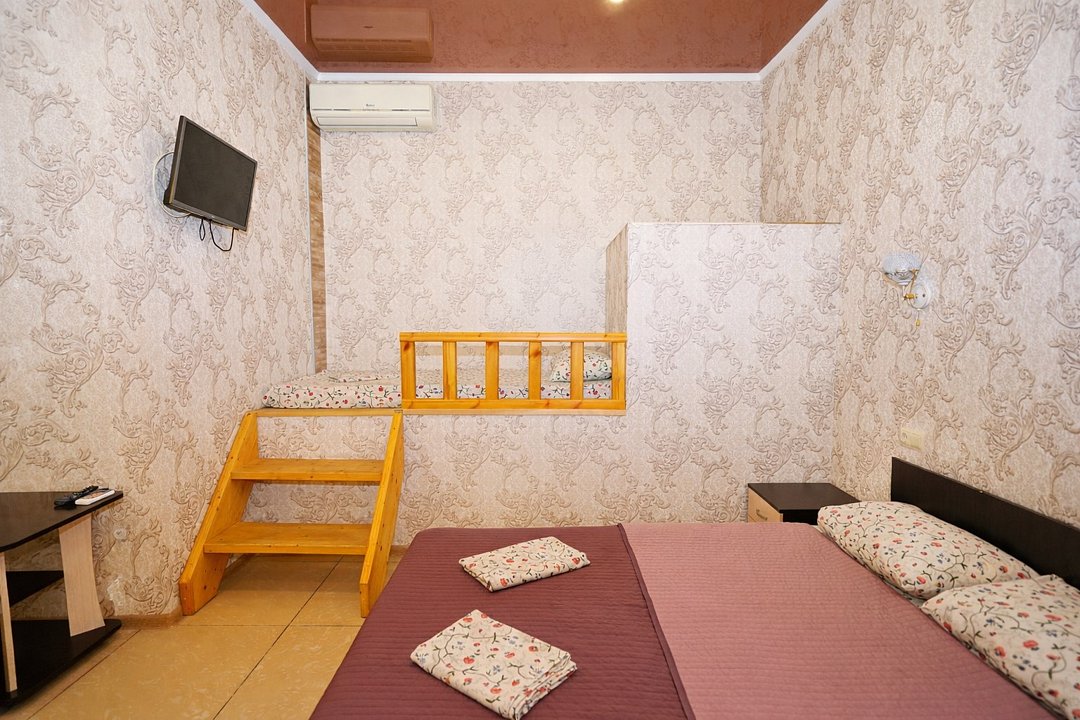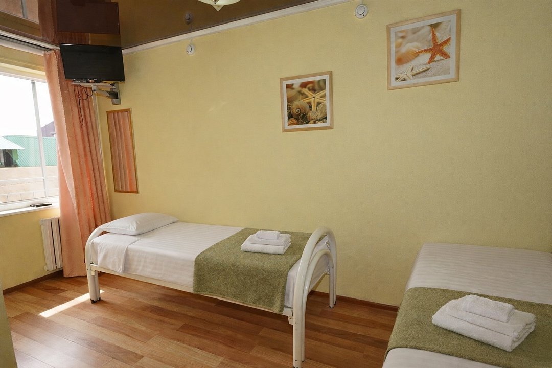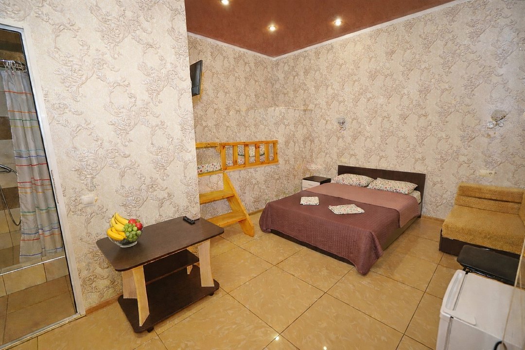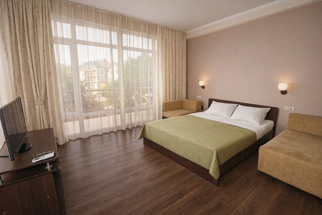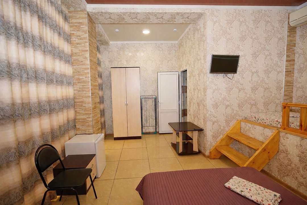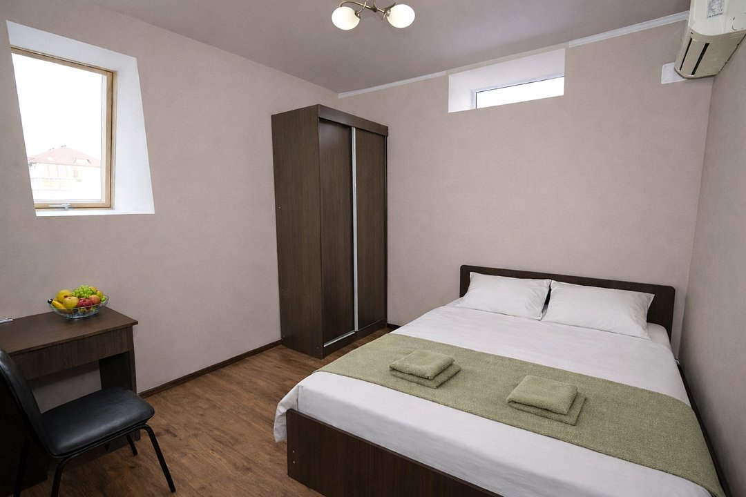 Четырехместный "Стандарт" со всем необходимым для комфортного проживания: душ и туалет, кондиционер, телевизор, холодильник. Мебель: Двухспальная кровать, два раздельных спальных места, комод, шкаф, прикроватные тумбы, зеркало, стул и стулья.Услуги и удобства