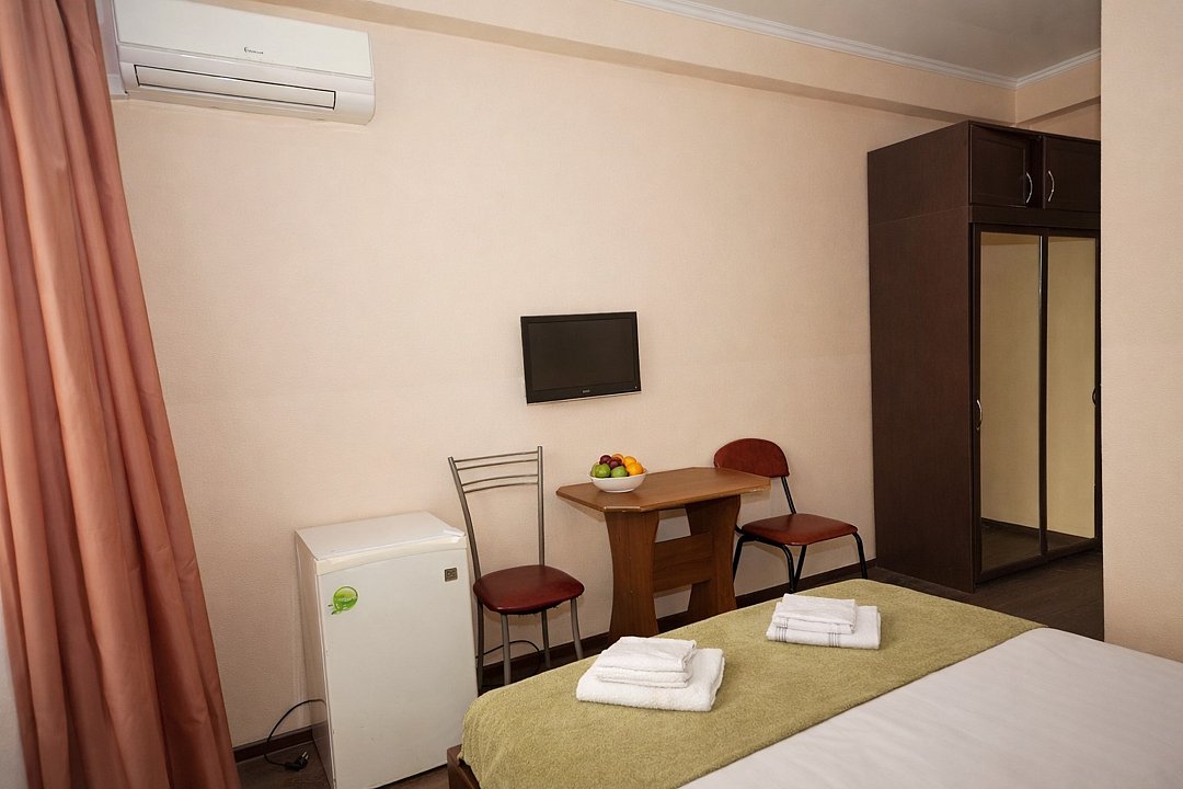 Двухместный номер "Стандарт" со всем необходимым для комфортного проживания: душ и туалет, кондиционер, телевизор, холодильник. Мебель: Двухспальная кровать, кровать, комод, шкаф, прикроватные тумбы, зеркало, стул и стулья.Услуги и удобства