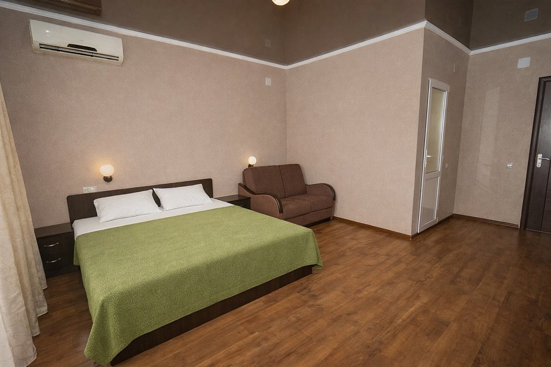 Трехместный номер "Комфорт" со всем необходимым для комфортного проживания: душ и туалет, кондиционер, телевизор, холодильник. Мебель: Двухспальная кровать, кресло-кровать, комод, шкаф, прикроватные тумбы, зеркало, стул и стулья.Услуги и удобства