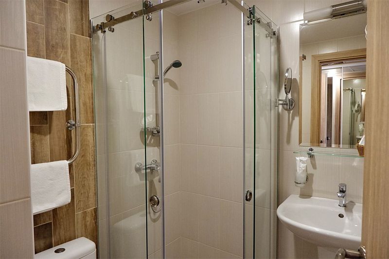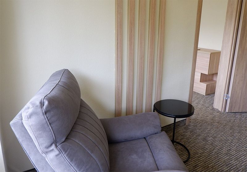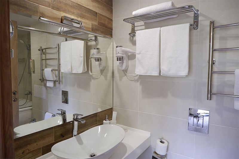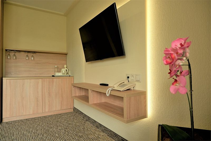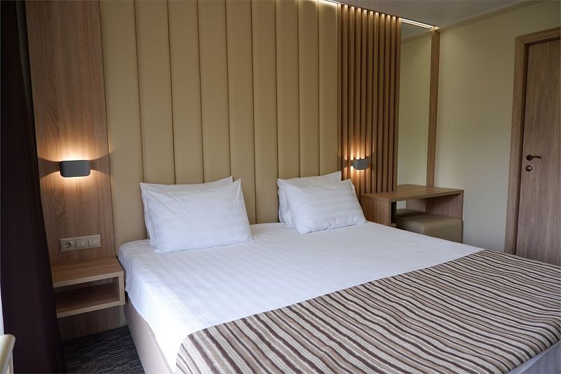 В номере: две односпальные кровати (90х200) с возможностью соединения в одну двуспальную кровать (180х200), дополнительное место (раскладной диван), совмещенный санузел.