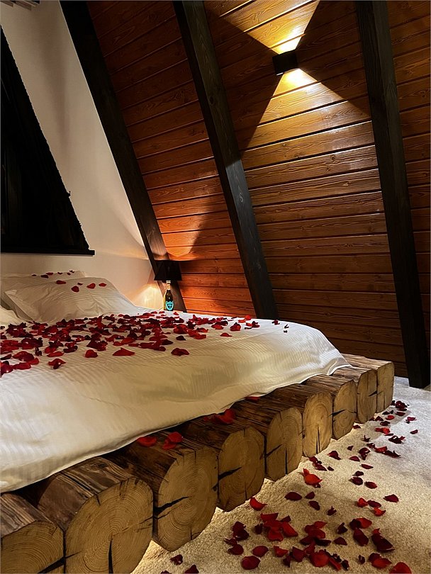 Кровать king size 2*2 может быть украшена лепестками роз по предварительному запросу — входит в стоимость.