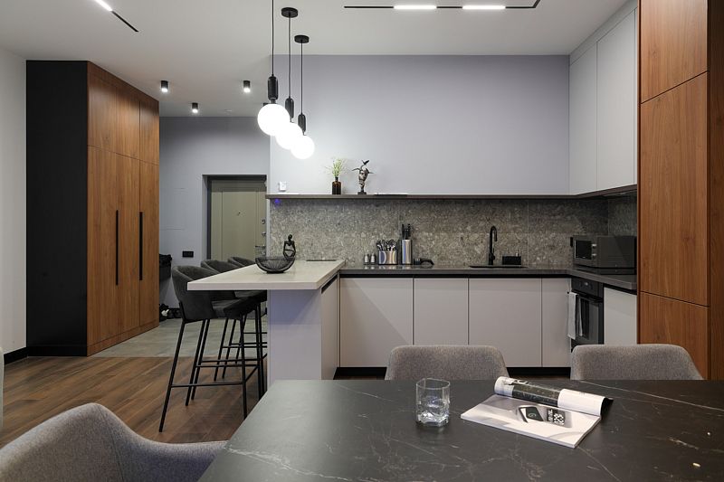 Кухня находится на первом этаже и имеет всё необходимое: холодильник, микроволновую печь, электрический чайник, посуду, обеденный стол.