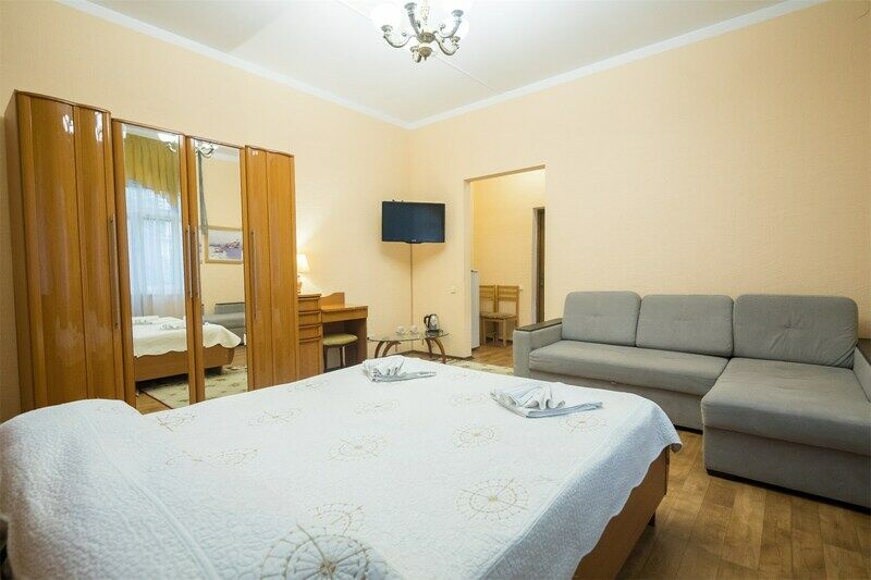Просторный двухкомнатный номер с большой двуспальной кроватью и раскладным диваном.