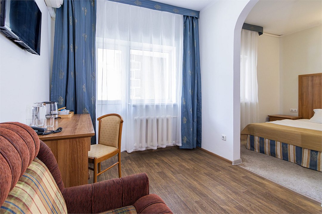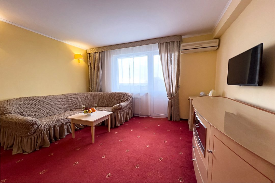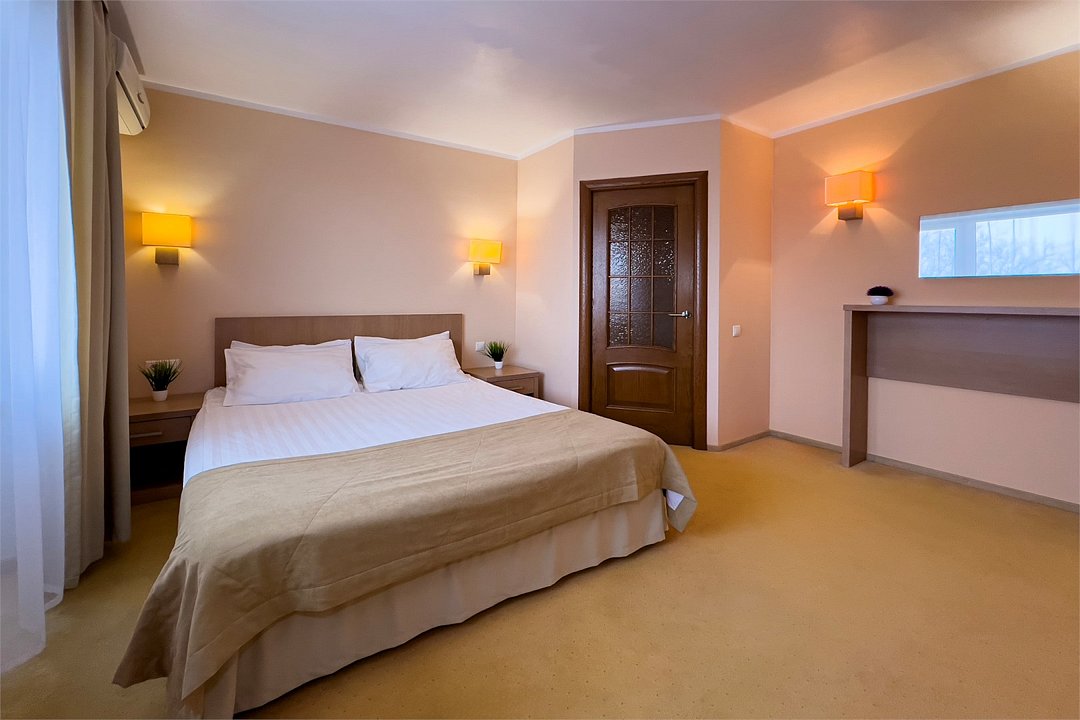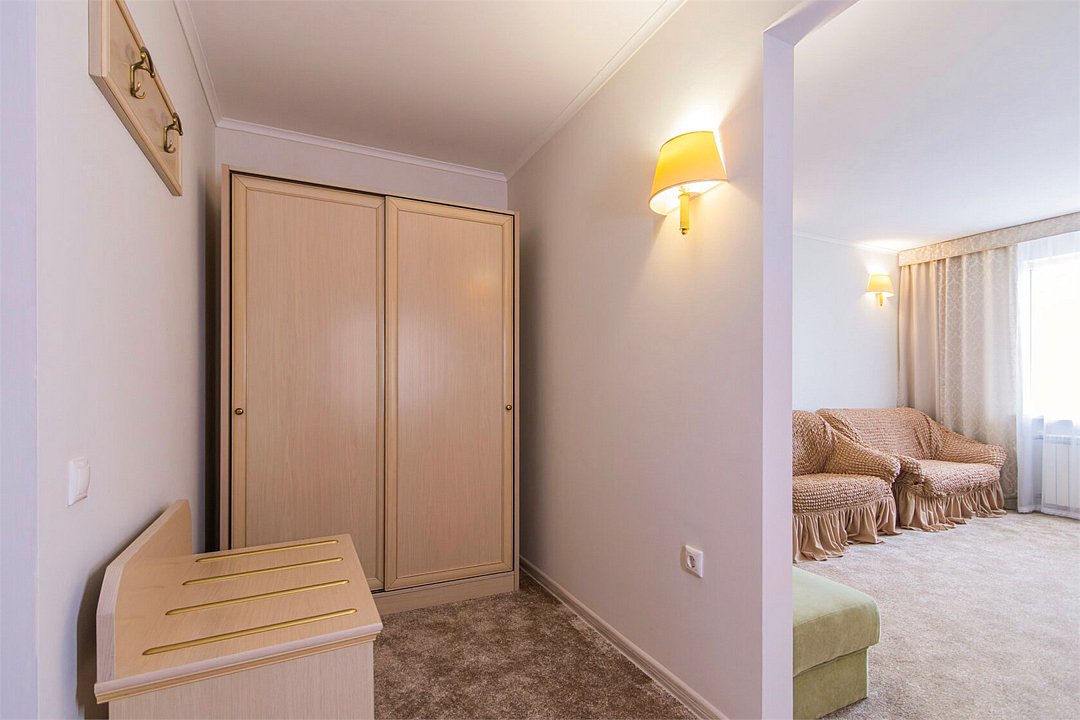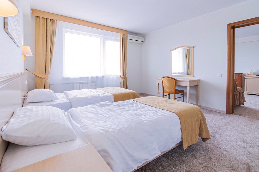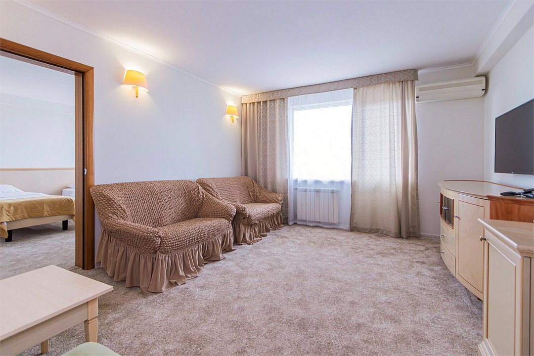 Двухкомнатный номер, площадью 38 м2. В одной комнате – двуспальная кровать, в другой – односпальная кровать и диван. Санузел номера оснащен ванной. В номере: кондиционер, LED телевизор, мини-холодильник, письменный стол и стулья, шкаф для одежды, тумба, багажная тумба, пуф, зеркало, телефон, фен, чайная станция. Идеально подходит семьям с детьми и дружеским компаниям.Услуги и удобства