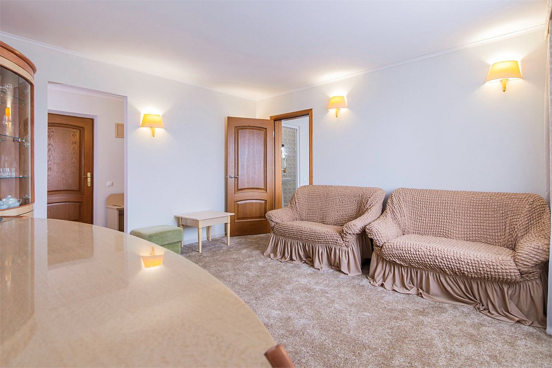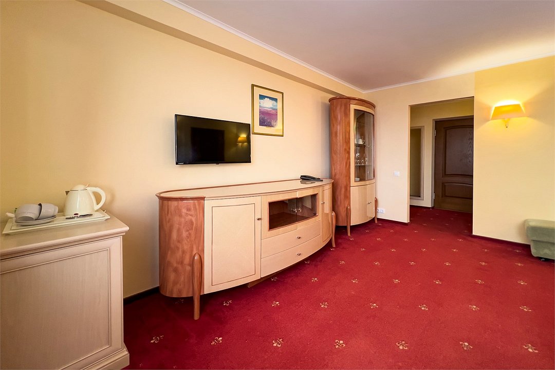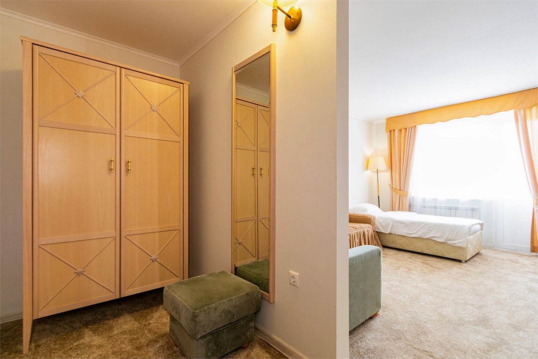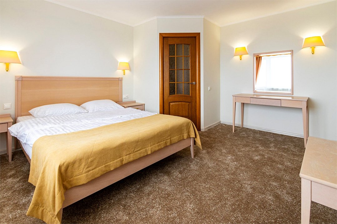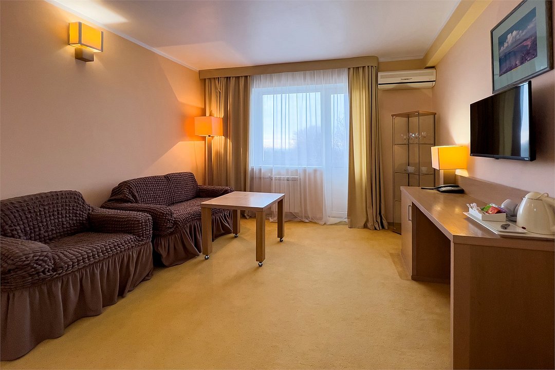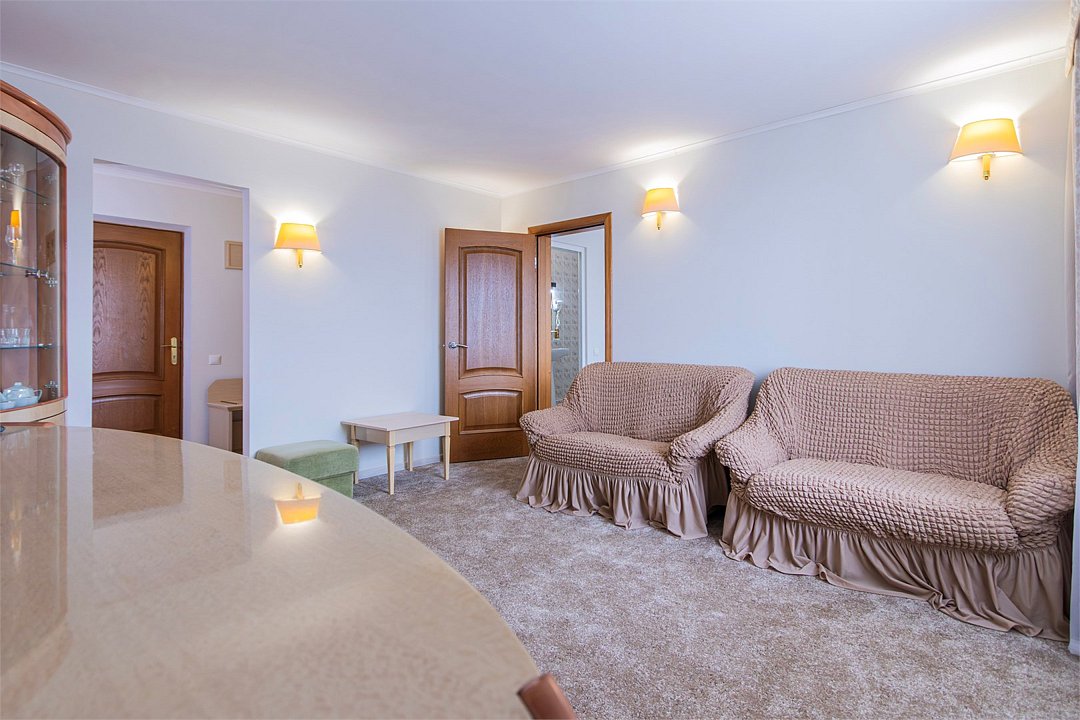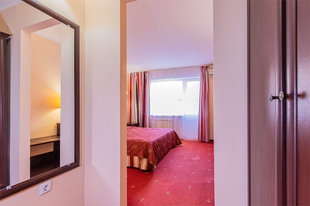 Двухкомнатный номер, площадью 38 м2. В одной комнате – двуспальная кровать, в другой – односпальная кровать и диван. Санузел номера оснащен ванной. В номере: кондиционер, LED телевизор, мини-холодильник, письменный стол и стулья, шкаф для одежды, тумба, багажная тумба, пуф, зеркало, телефон, фен, чайная станция. Идеально подходит семьям с детьми и дружеским компаниям.Услуги и удобства