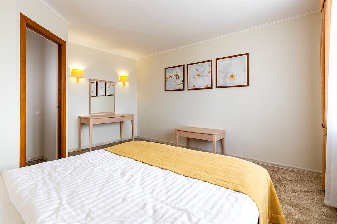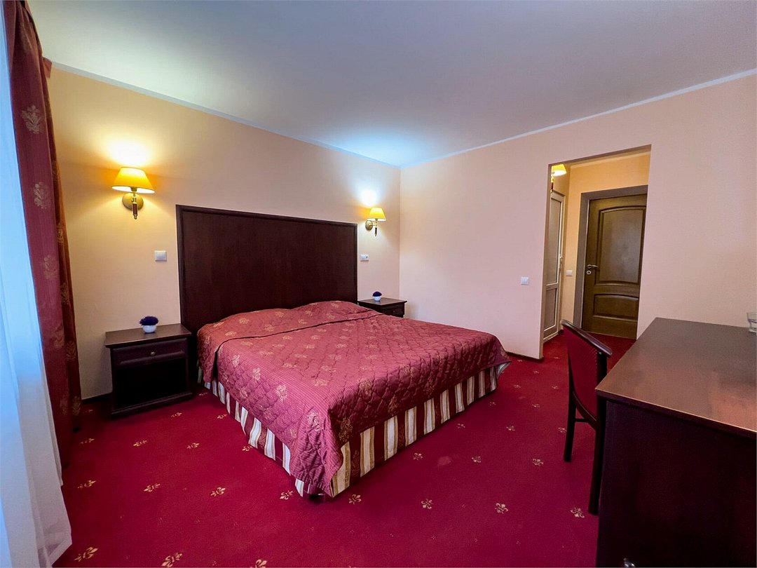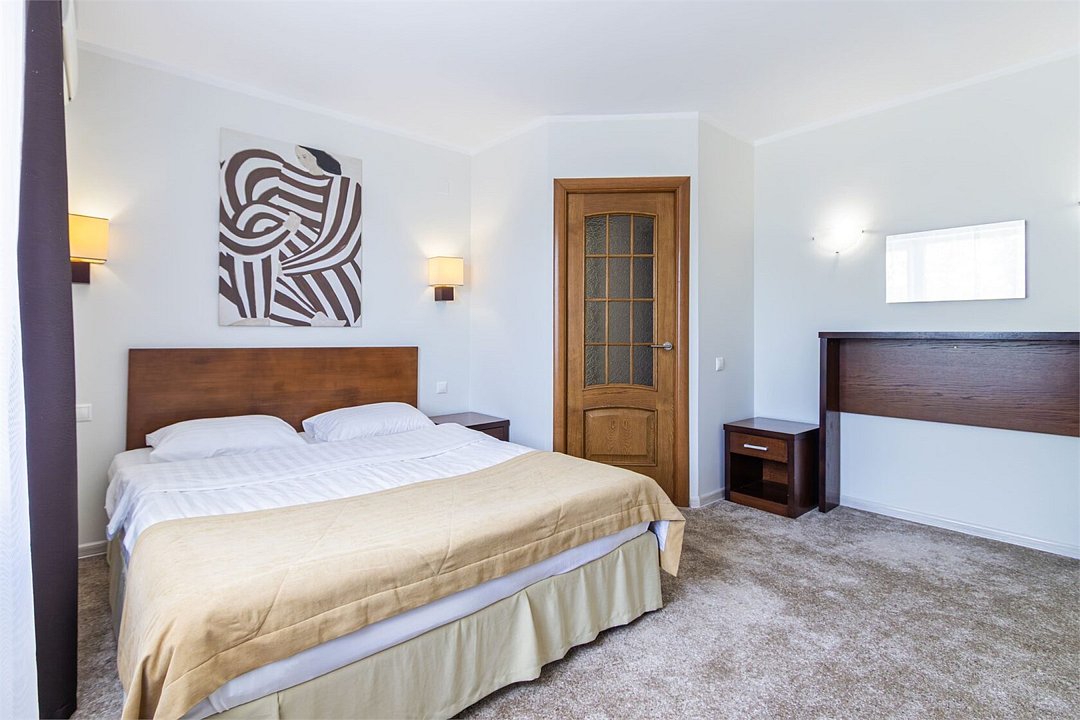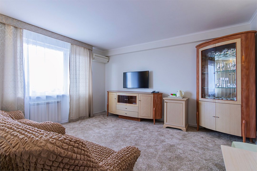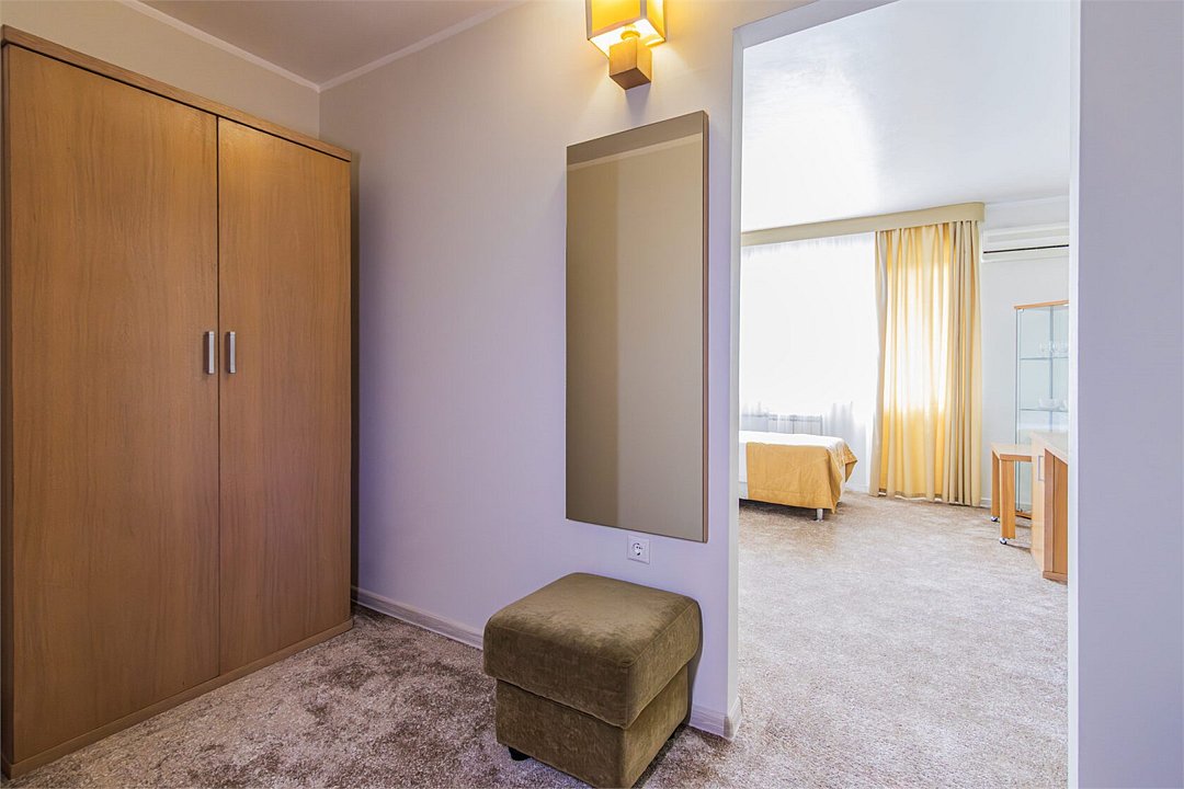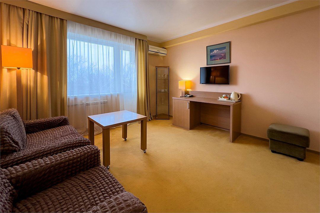 Двухкомнатный номер, площадью 38 м2. В одной комнате – двуспальная кровать, в другой – односпальная кровать и диван. Санузел номера оснащен ванной. В номере: кондиционер, LED телевизор, мини-холодильник, письменный стол и стулья, шкаф для одежды, тумба, багажная тумба, пуф, зеркало, телефон, фен, чайная станция. Идеально подходит семьям с детьми и дружеским компаниям.Услуги и удобства