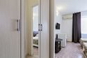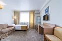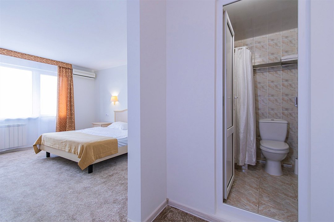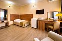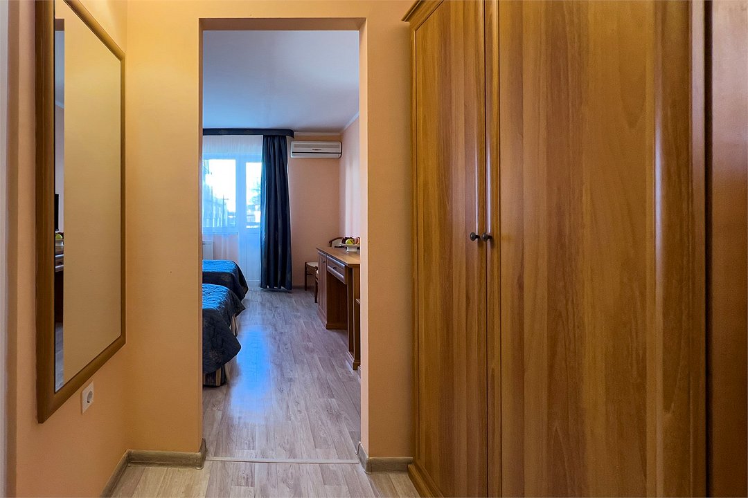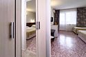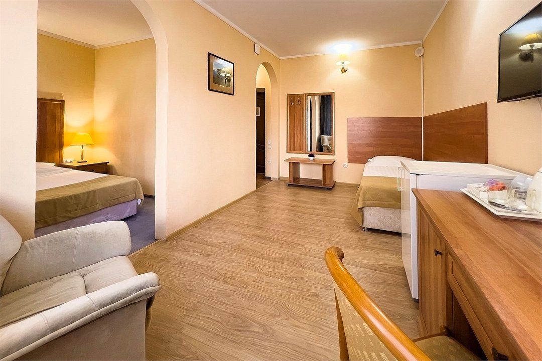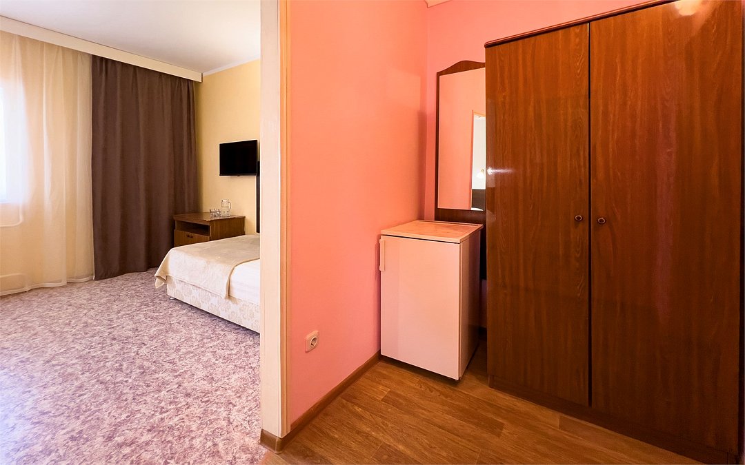 Двухкомнатный номер площадью 27 м2. В одной комнате – двуспальная кровать, в другой – односпальная кровать. Санузел номера оснащен душем. В номере: кондиционер, LED телевизор, мини-холодильник, шкаф для одежды, письменный стол и стулья, тумба, багажная тумба, зеркало, телефон, фен, чайная станция. Идеально подходит семьям с детьми.Услуги и удобства