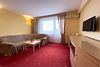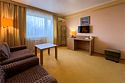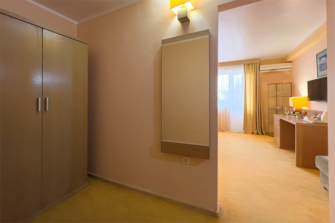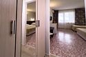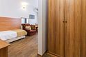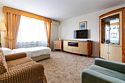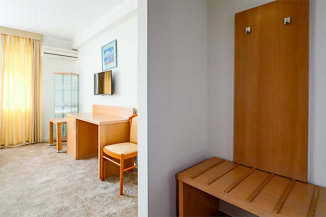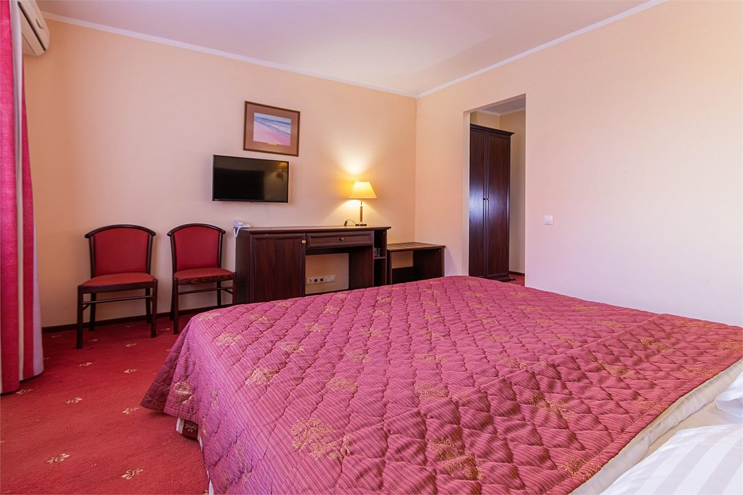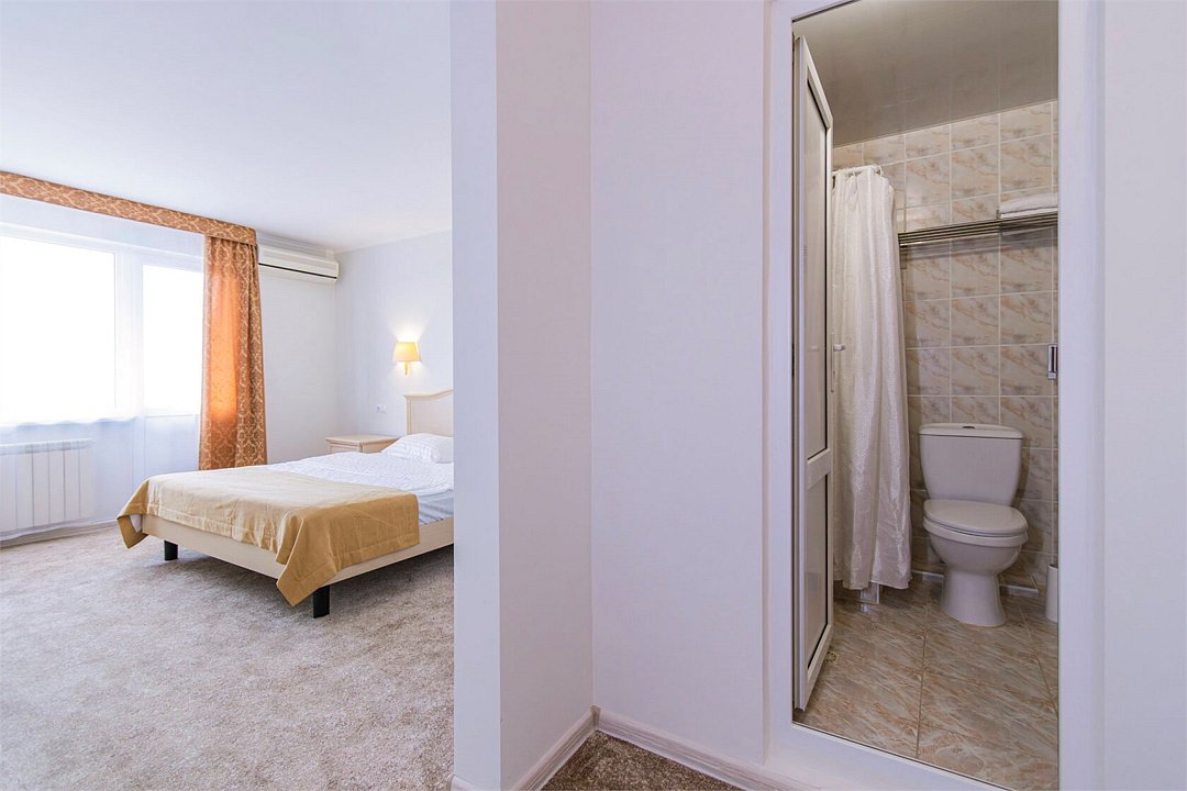 Двухкомнатный номер площадью 27 м2. В одной комнате – двуспальная кровать, в другой – односпальная кровать. Санузел номера оснащен душем. В номере: кондиционер, LED телевизор, мини-холодильник, шкаф для одежды, письменный стол и стулья, тумба, багажная тумба, зеркало, телефон, фен, чайная станция. Идеально подходит семьям с детьми.Услуги и удобства