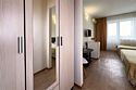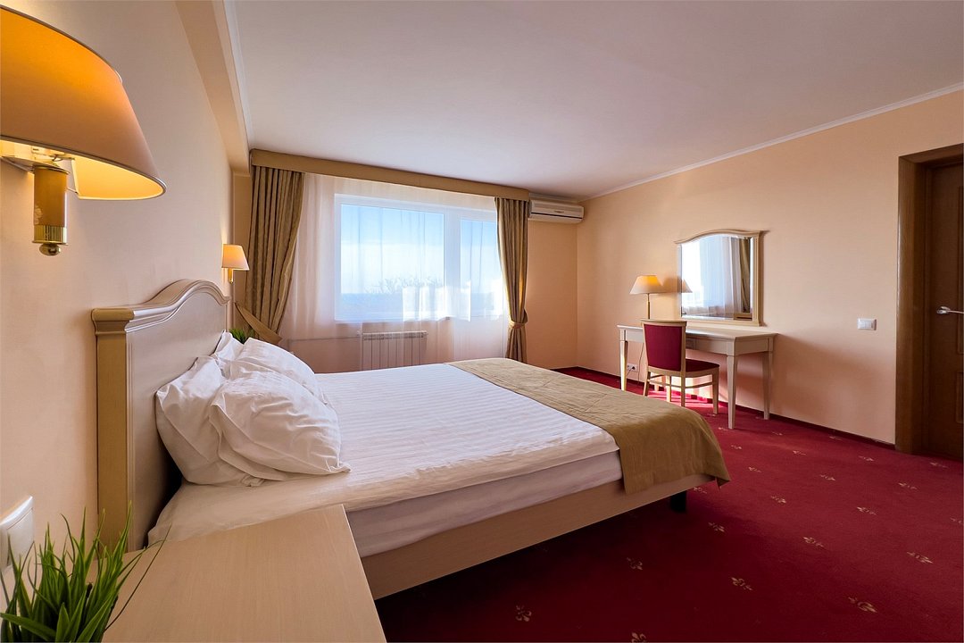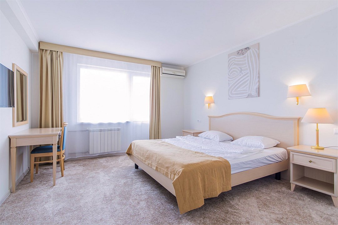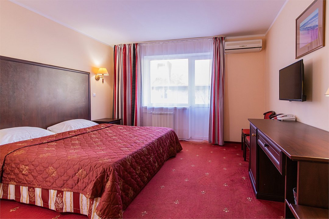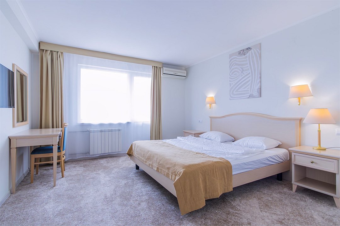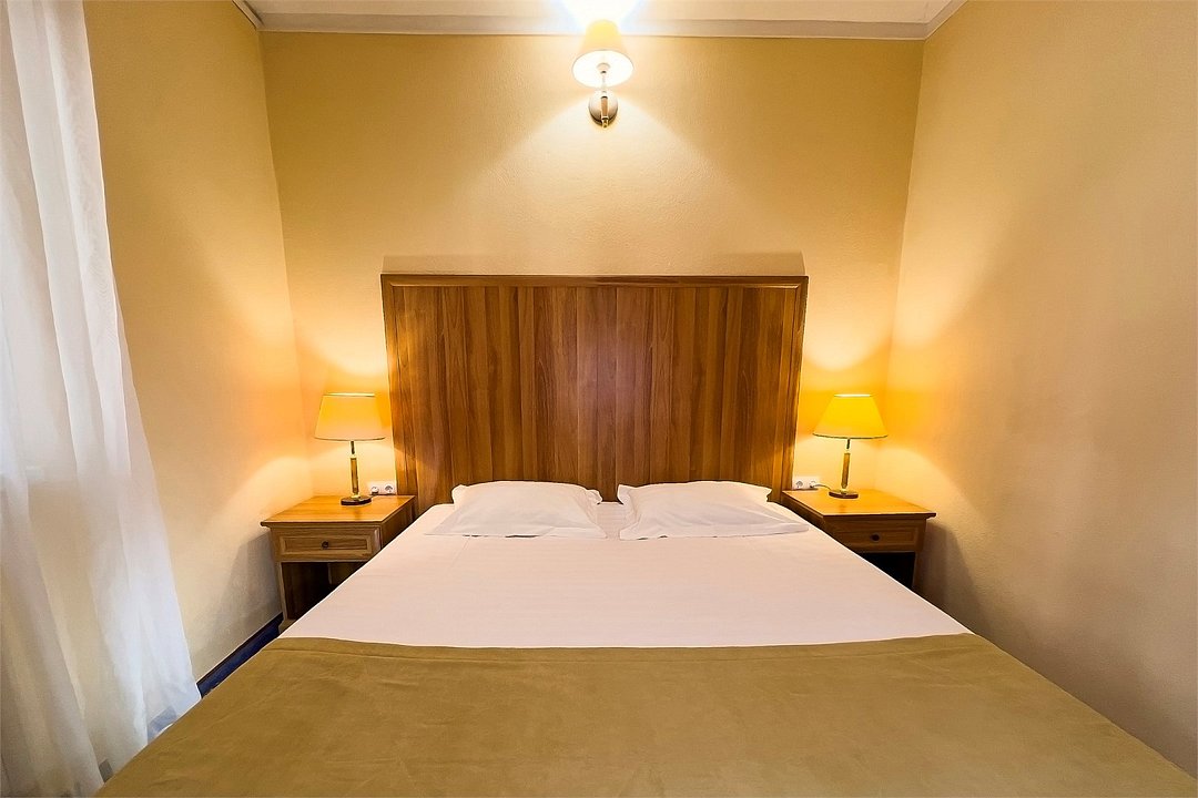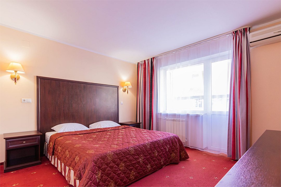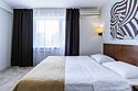Однокомнатный номер площадью 27 м2 с двуспальной кроватью. Санузел номера оснащен душем. В номере: кондиционер, LED телевизор, мини-холодильник, письменный стол и стулья, шкаф для одежды, тумба, багажная тумба, зеркало, телефон, фен. Идеально подходит парам и семьям без детей.Услуги и удобства