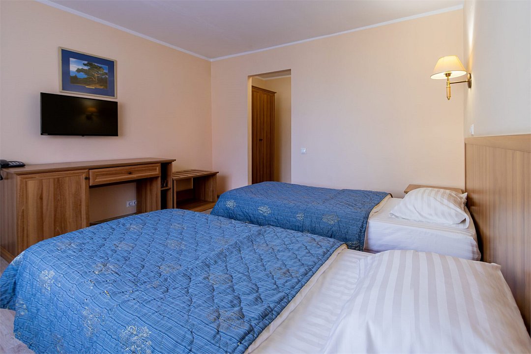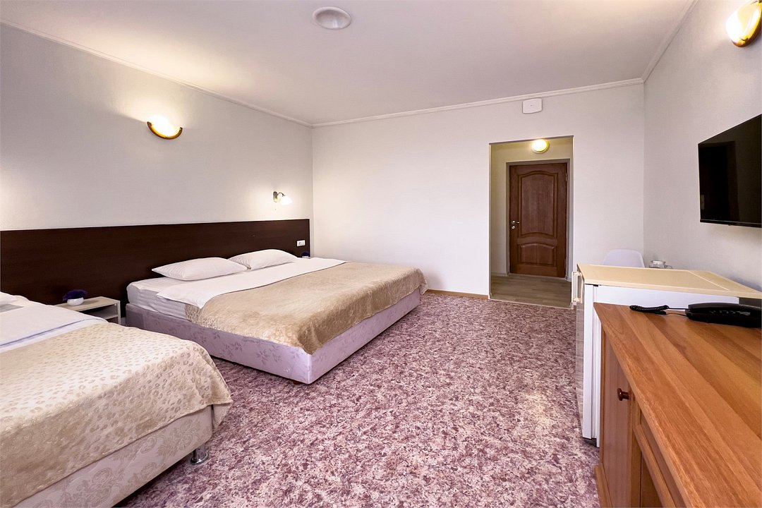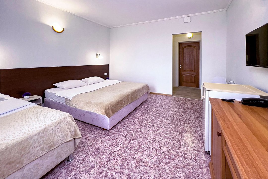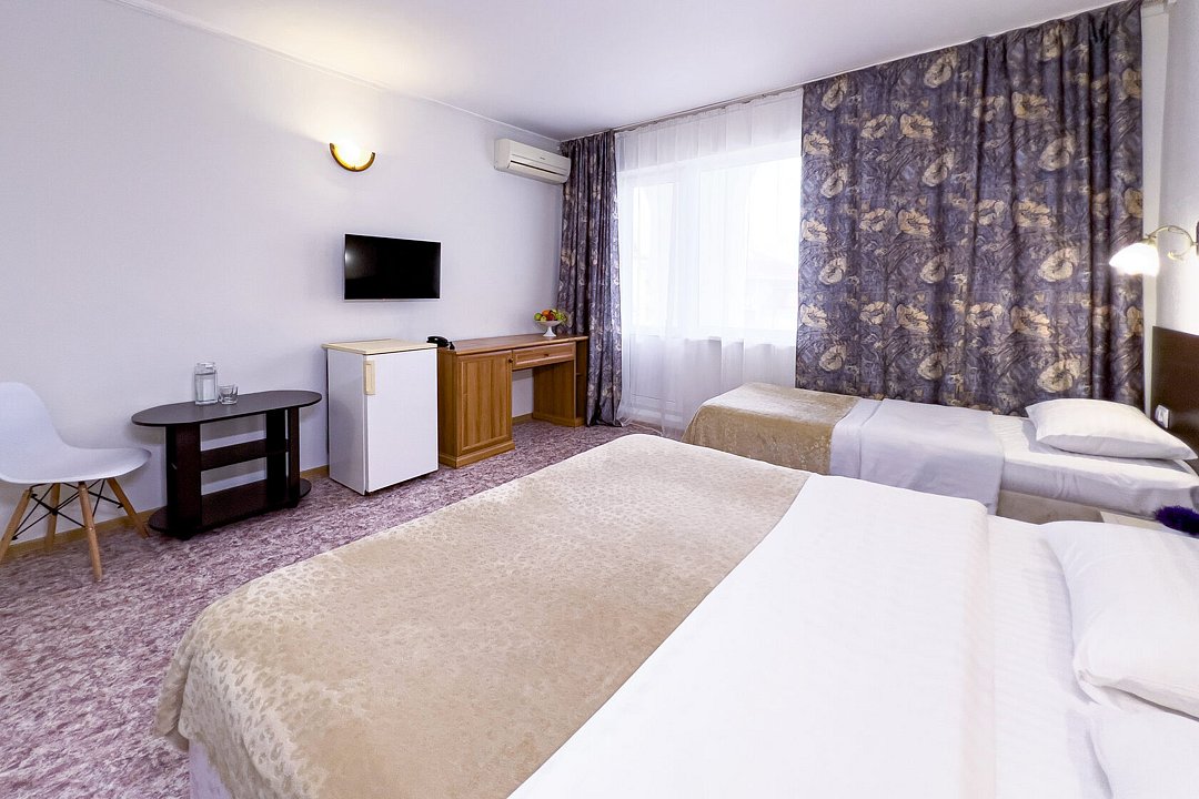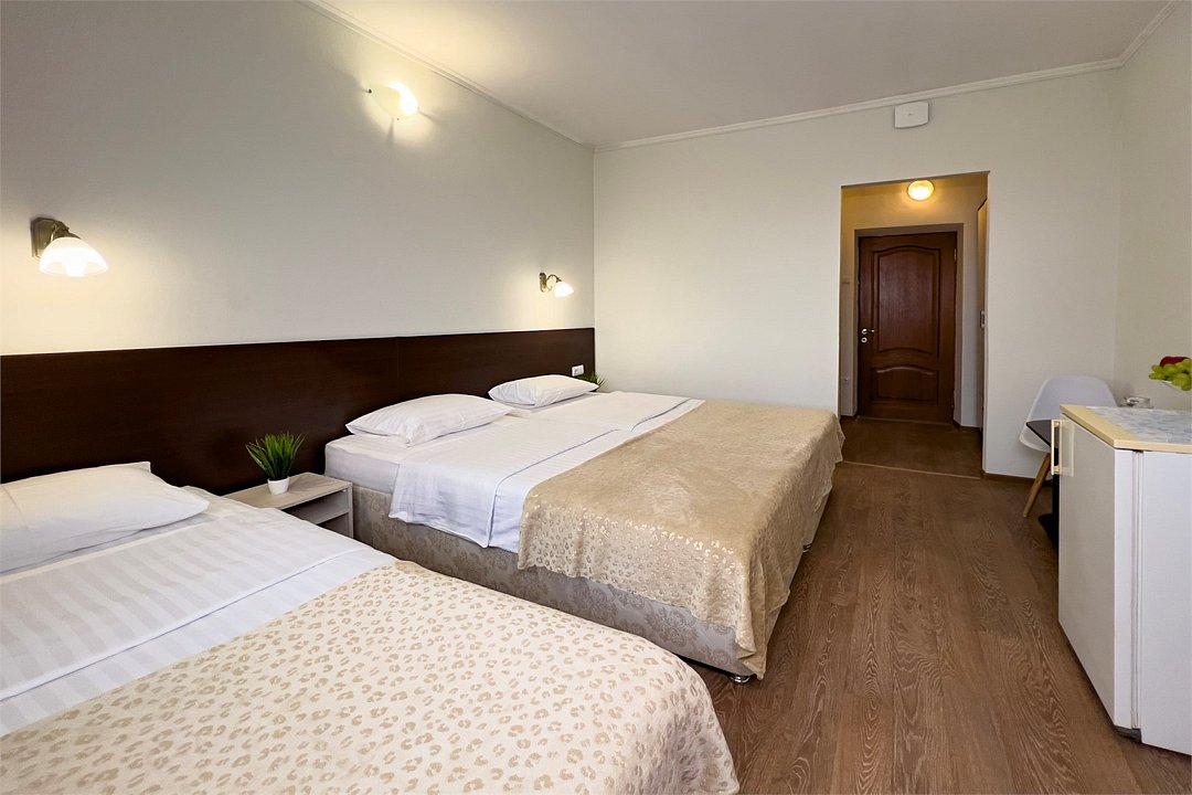 Однокомнатный номер площадью от 18,5 до 20 м2 с тремя односпальными кроватями. Санузел номера оснащен душем. В номере: кондиционер, LED телевизор, мини-холодильник, шкаф для одежды, тумба, стул, зеркало, телефон журнальный столик. Идеально подходит бизнес-туристам, семьям и друзьям.Услуги и удобства