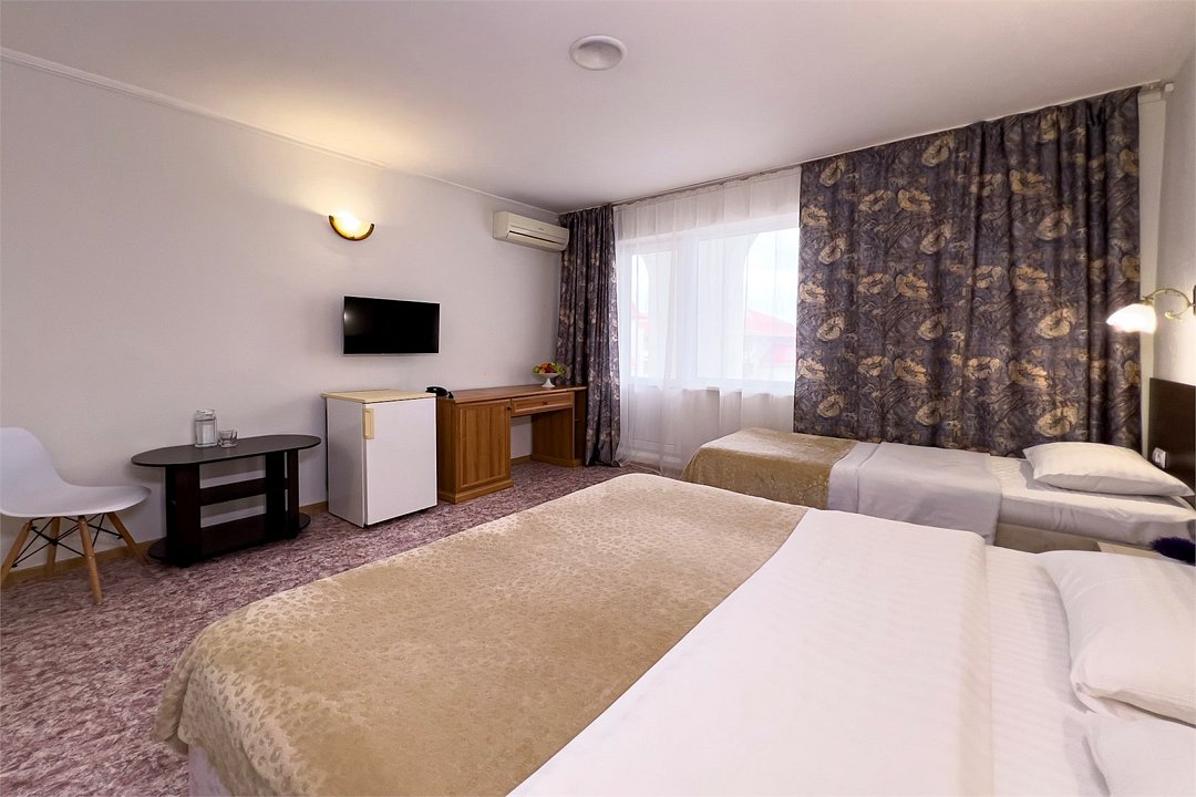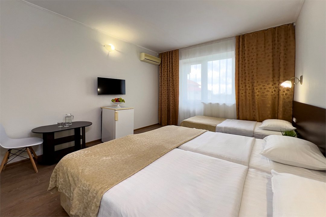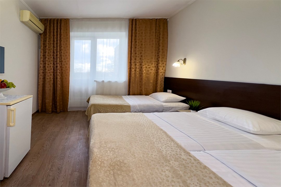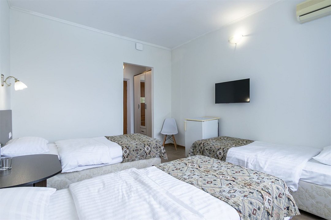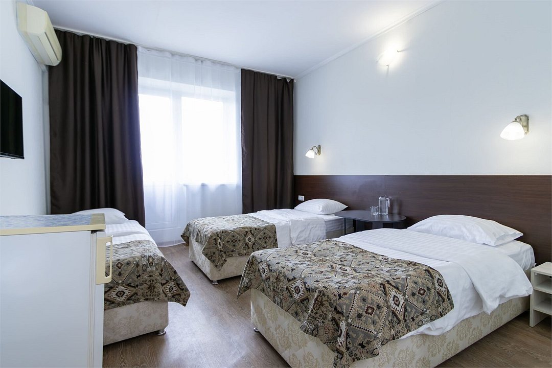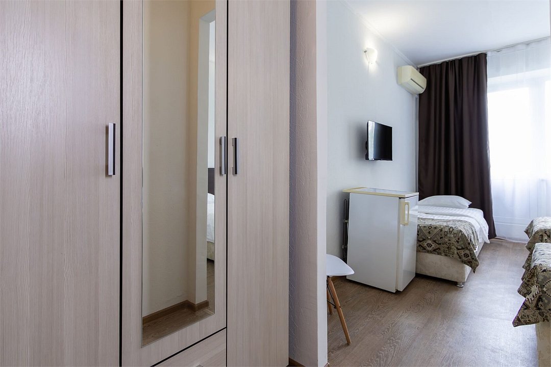 Однокомнатный номер площадью от 18,5 до 20 м2 с тремя односпальными кроватями. Санузел номера оснащен душем. В номере: кондиционер, LED телевизор, мини-холодильник, шкаф для одежды, тумба, стул, зеркало, телефон журнальный столик. Идеально подходит бизнес-туристам, семьям и друзьям.Услуги и удобства
