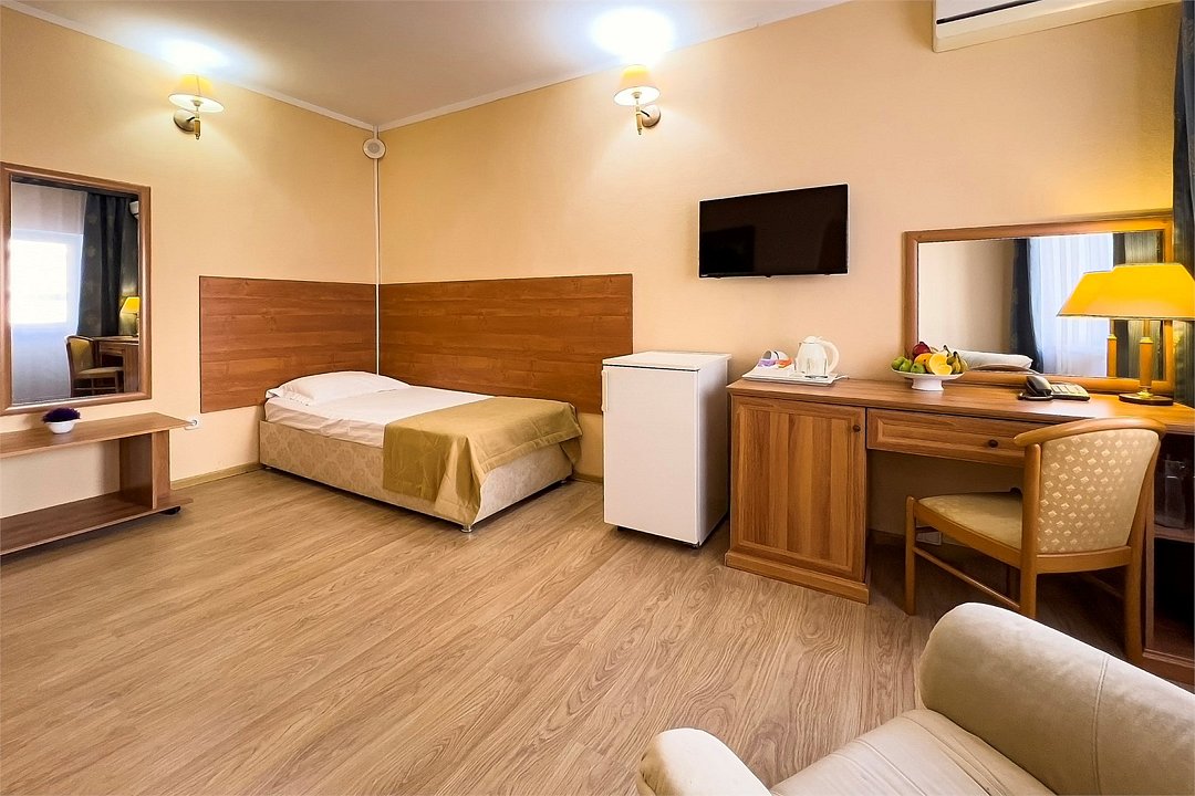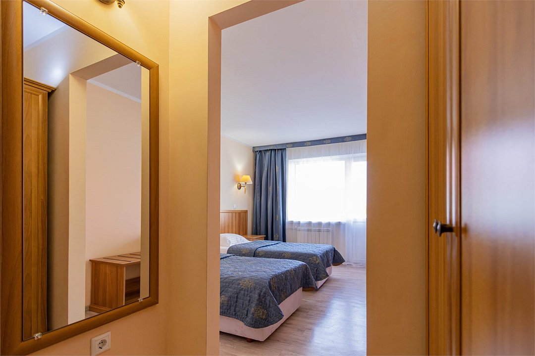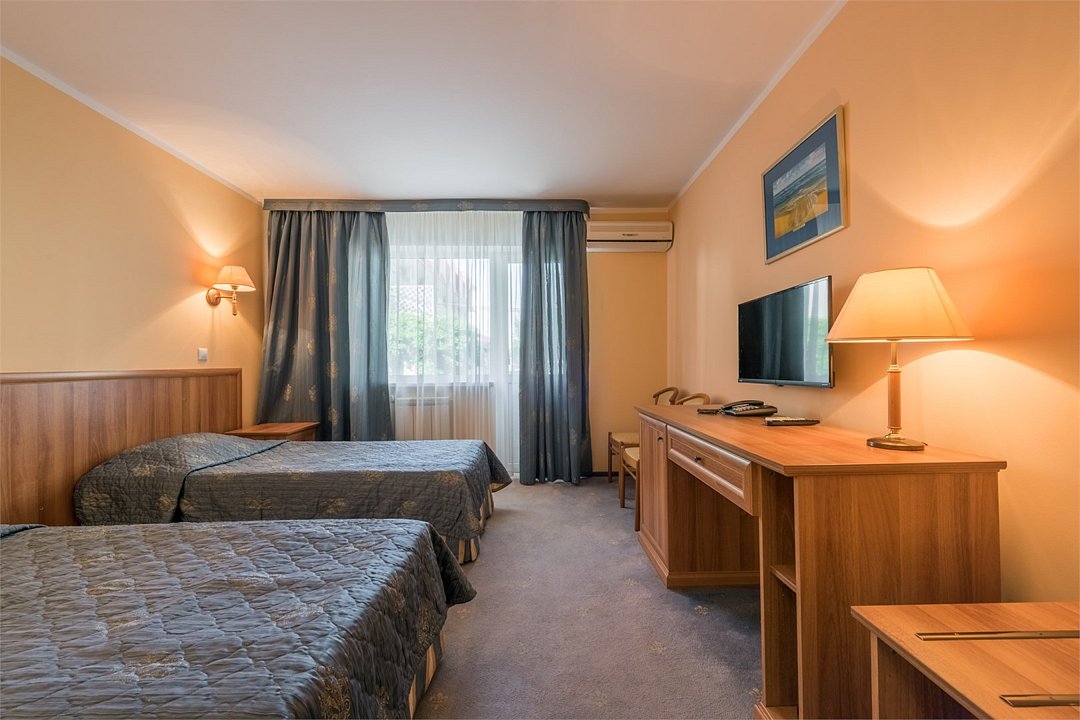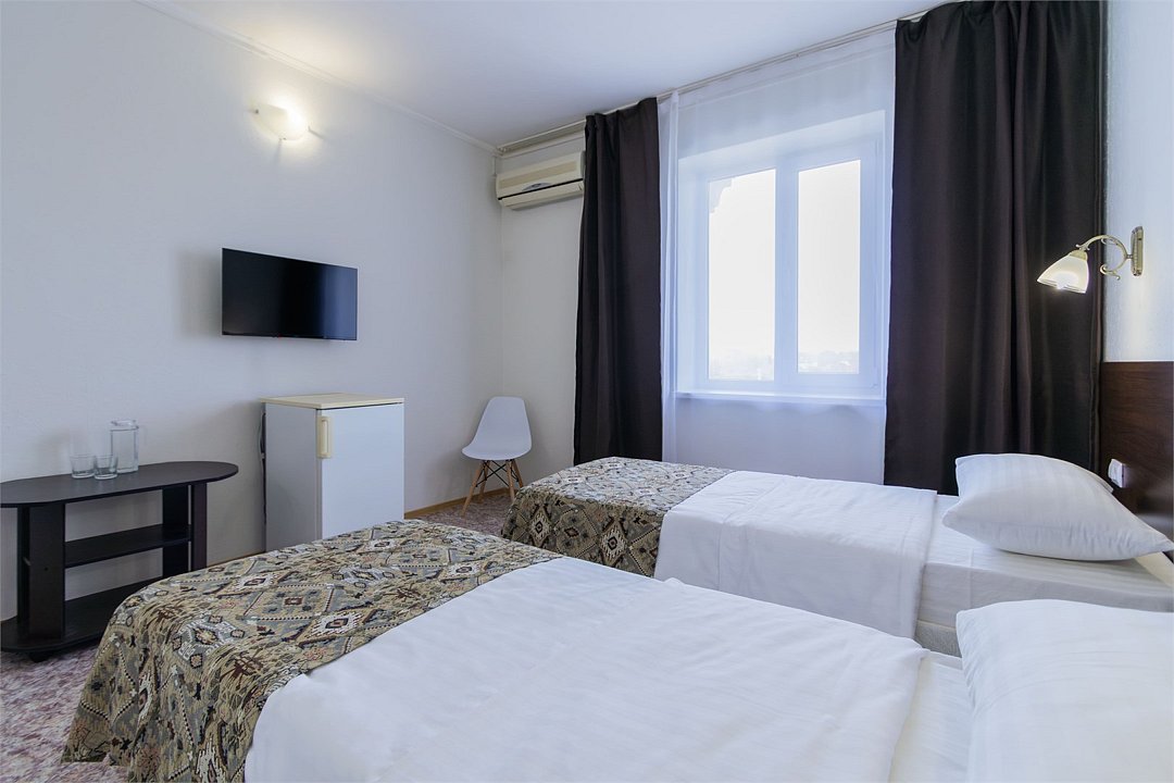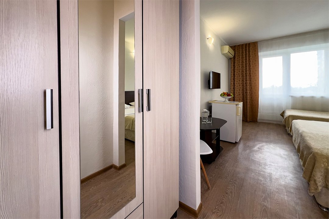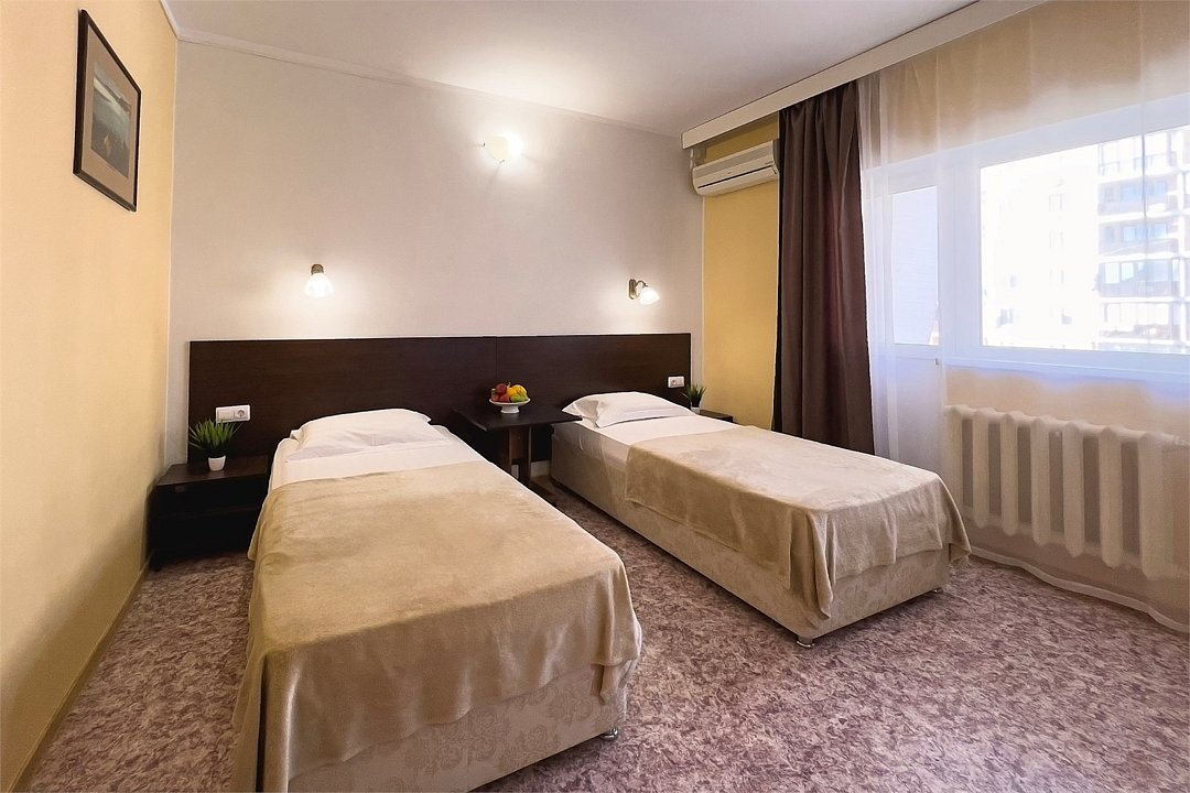 Однокомнатный номер площадью 25 м2 с двумя односпальными кроватями. Санузел номера оснащен душем. В номере: кондиционер, LED телевизор, мини-холодильник, письменный стол и стулья, шкаф для одежды, тумба, багажная тумба, зеркало, телефон, фен. Идеально подходит бизнес-туристам и друзьям.Услуги и удобства