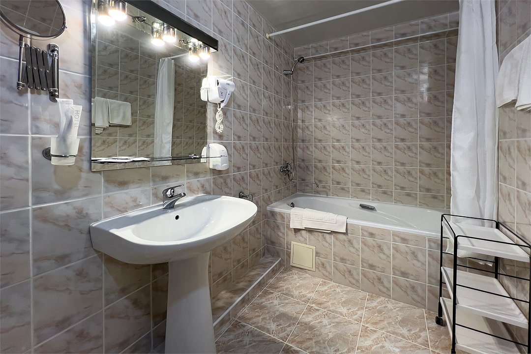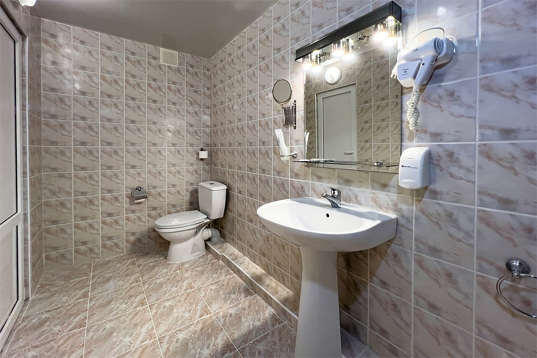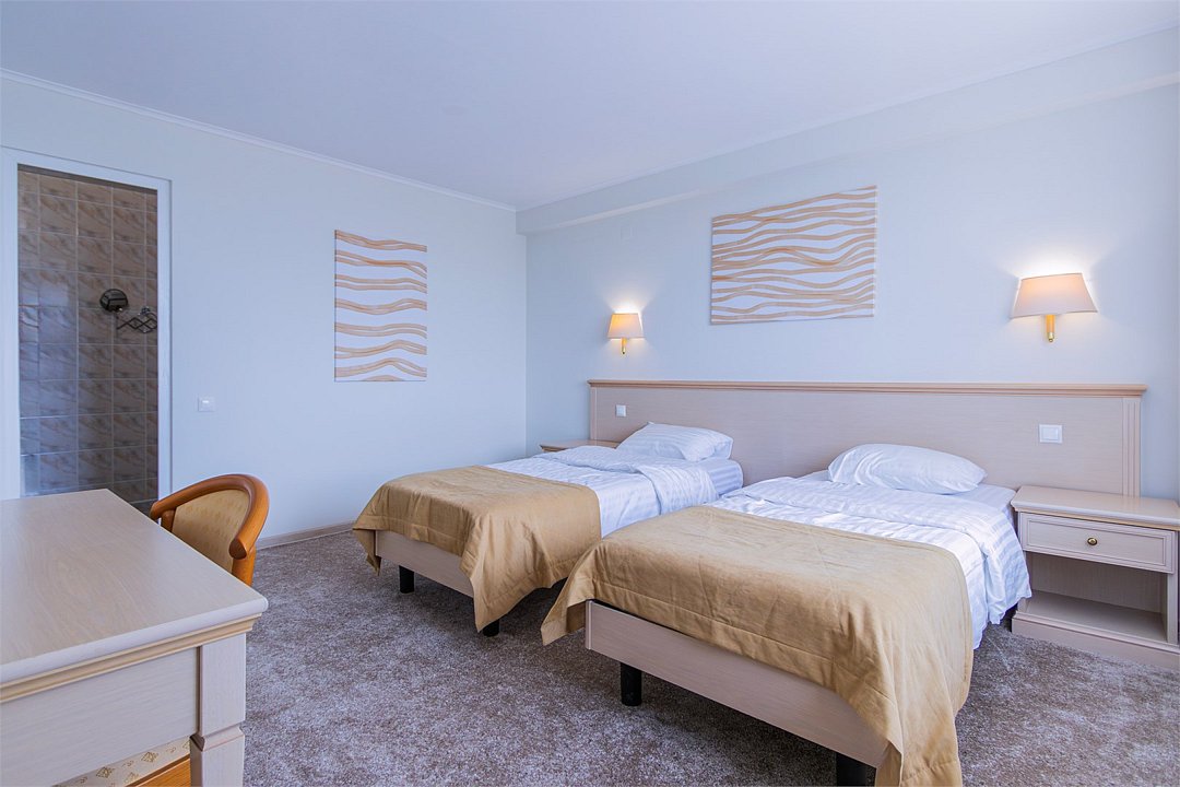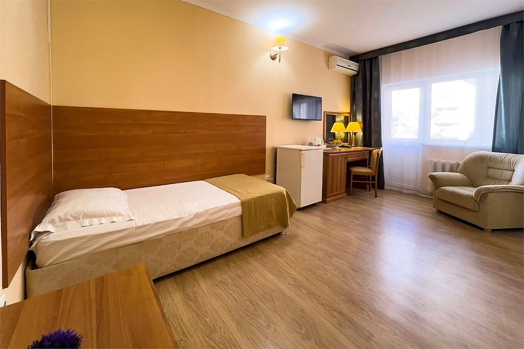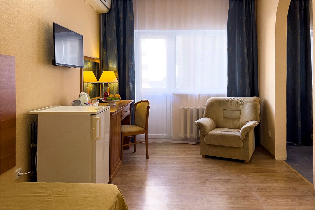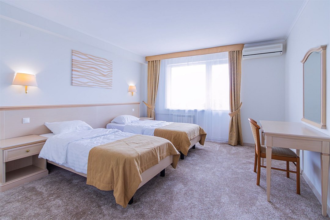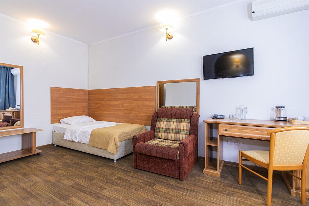 Однокомнатный номер площадью 25 м2 с двумя односпальными кроватями. Санузел номера оснащен душем. В номере: кондиционер, LED телевизор, мини-холодильник, письменный стол и стулья, шкаф для одежды, тумба, багажная тумба, зеркало, телефон, фен. Идеально подходит бизнес-туристам и друзьям.Услуги и удобства