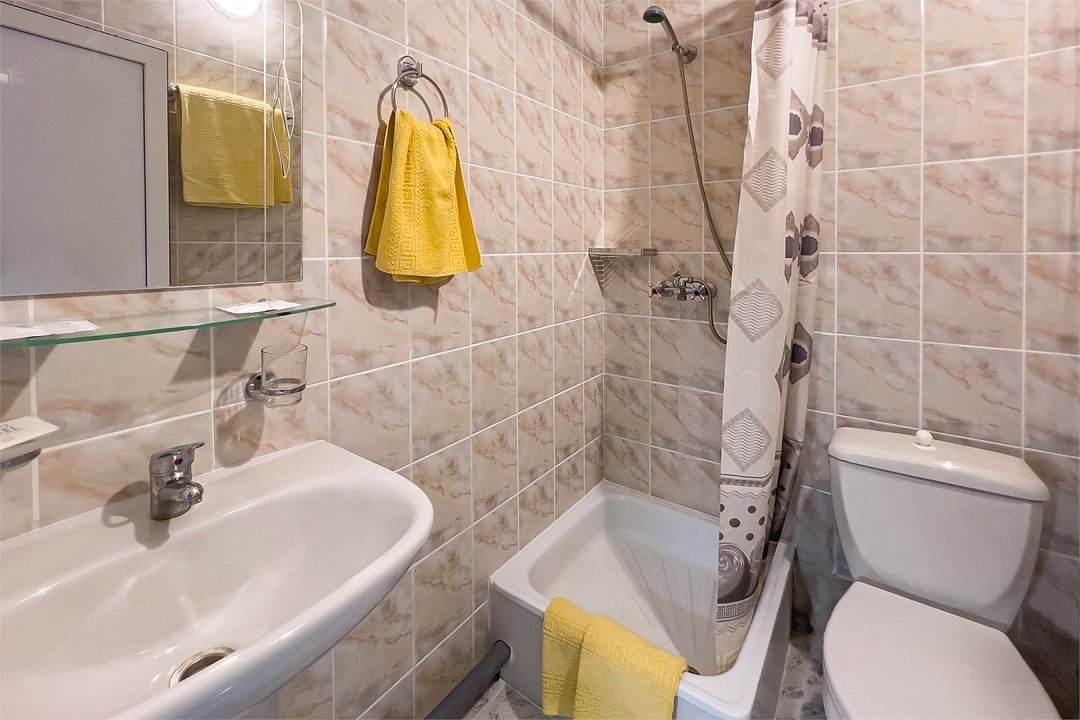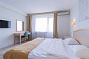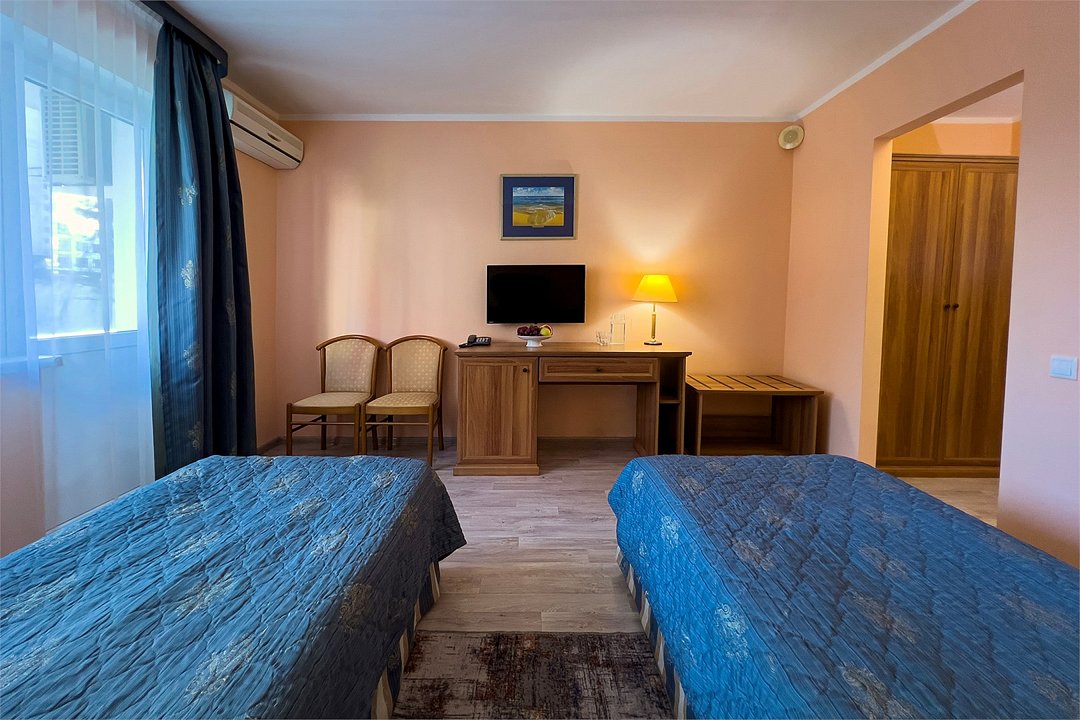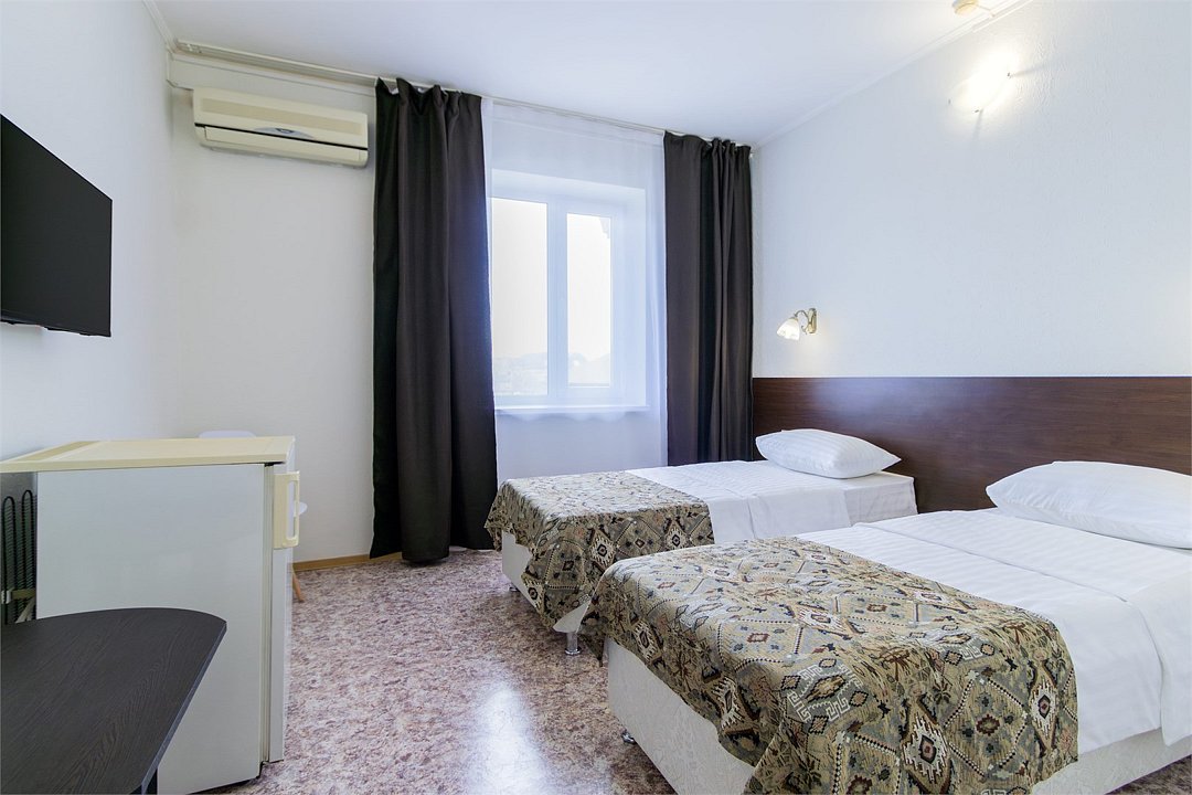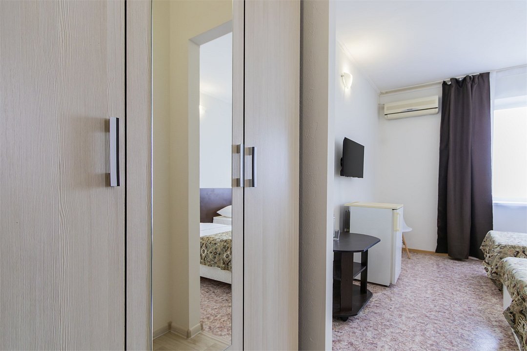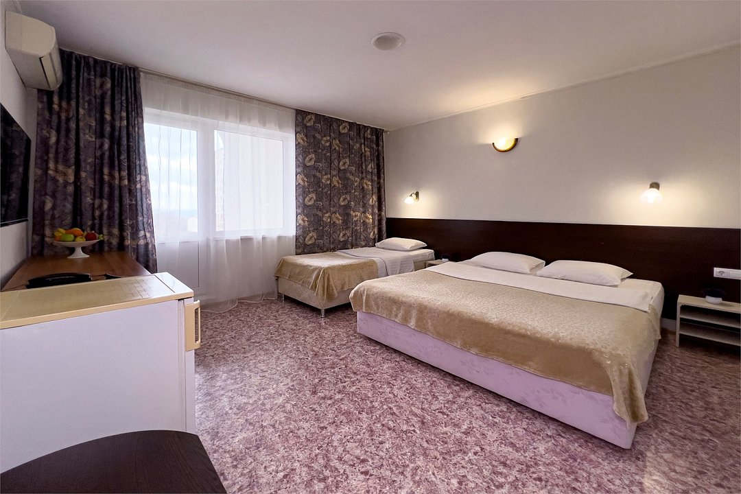 Однокомнатный номер с видом на море площадью 18.5 м2, с одной двуспальной и одной односпальной кроватью. Санузел номера оснащен душем. В номере: кондиционер, LED телевизор, мини-холодильник, шкаф для одежды, тумба, стул, зеркало, телефон журнальный столик. Идеально подходит семьям и компаниям друзей.Услуги и удобства