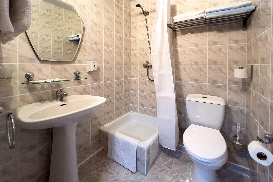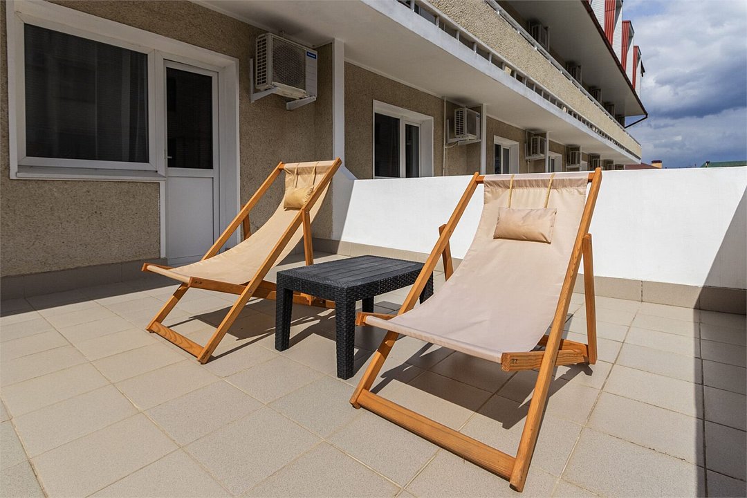 Однокомнатный номер с террасой площадью 20 м2 с тремя односпальными кроватями. Санузел номера оснащен душем. В номере: кондиционер, телевизор, мини-холодильник, шкаф для одежды, тумба, стул, зеркало, телефон. На террасе расположена мебель для комфортного отдыха. Идеально подходит бизнес-туристам и друзьям.Услуги и удобства