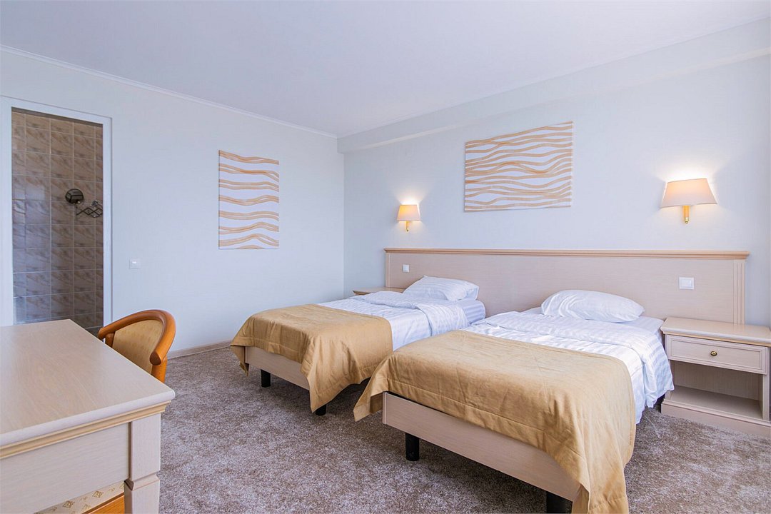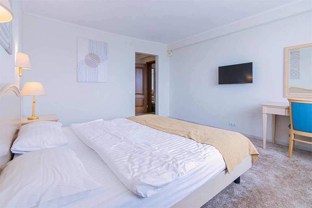 Двухкомнатный номер с видом на море площадью 38 м2. В одной комнате – двуспальная кровать, в другой – односпальная кровать и диван. Санузел номера оснащен ванной. В номере: кондиционер, LED телевизор, мини-холодильник, письменный стол и стулья, шкаф для одежды, тумба, багажная тумба, пуф, зеркало, телефон, фен, чайная станция. Идеально подходит семьям с детьми и дружеским компаниям.Услуги и удобства