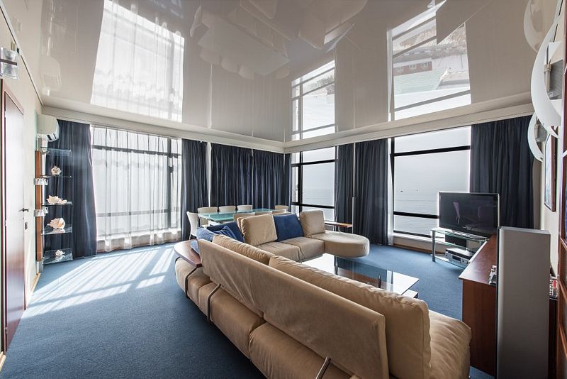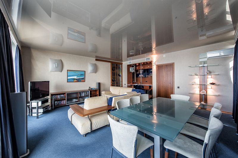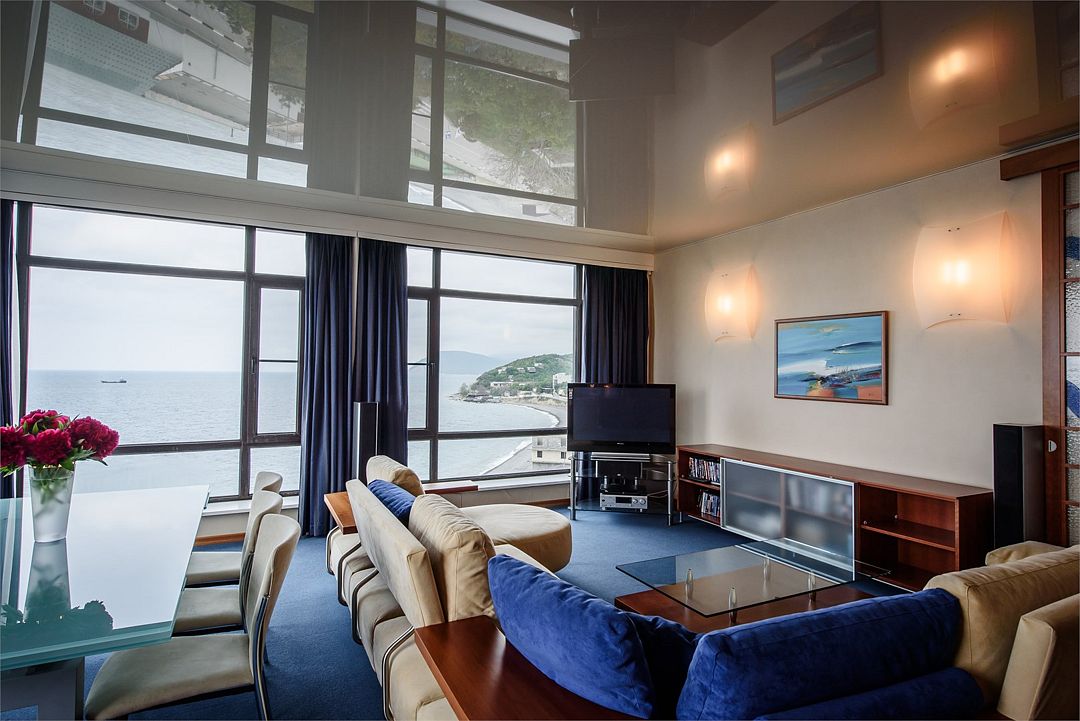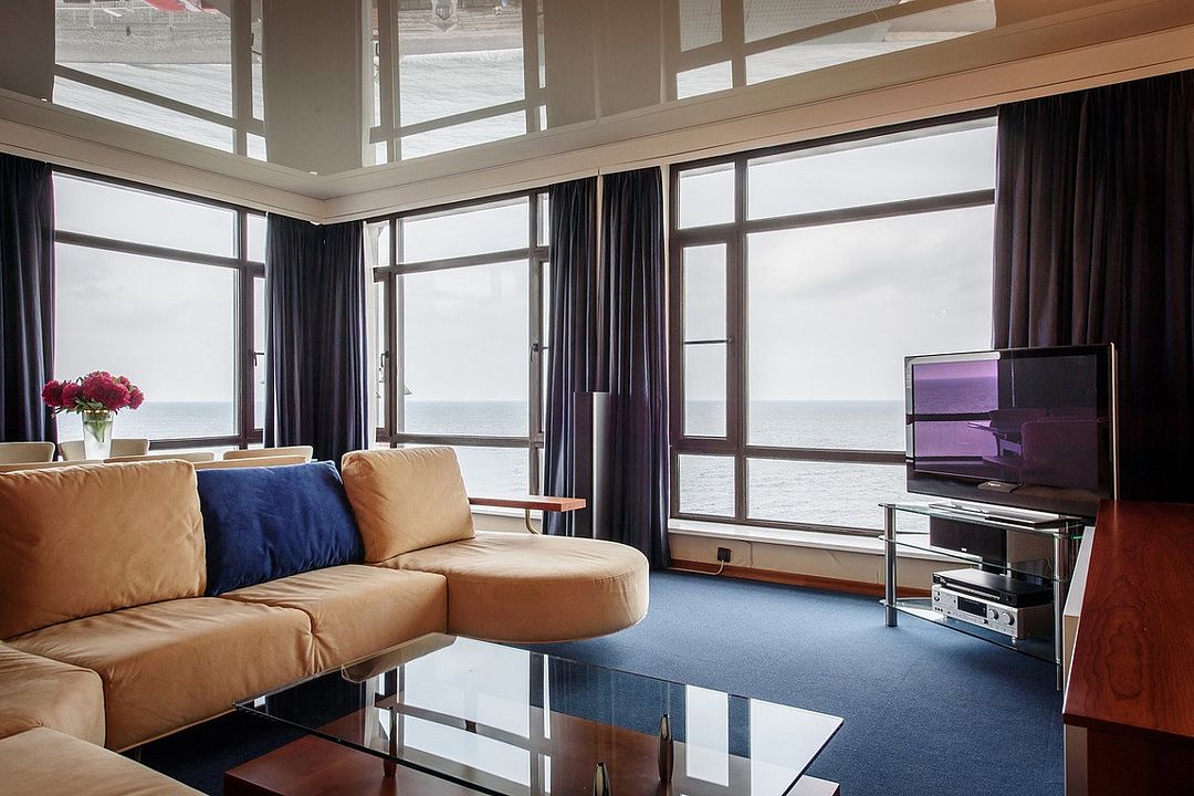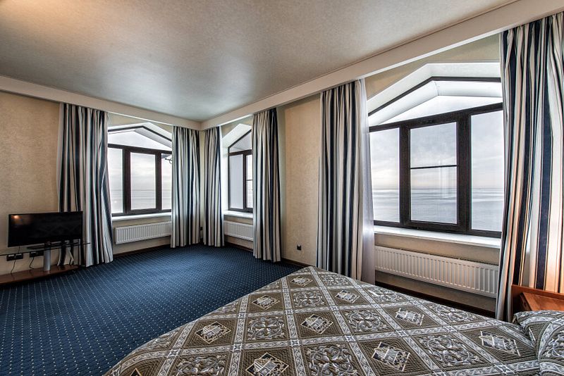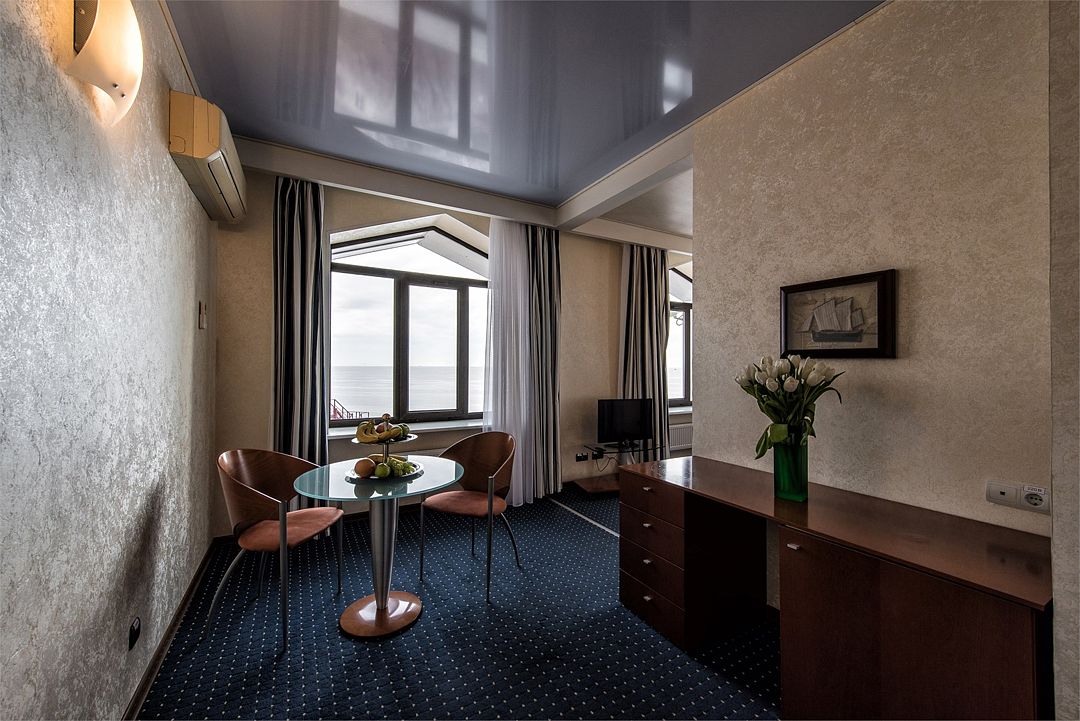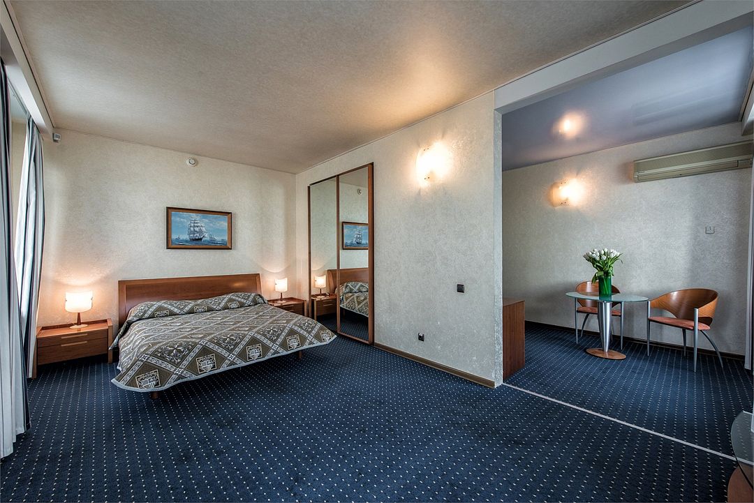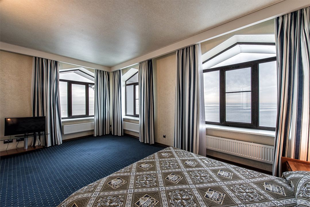 Люксовый номер гостиницы "Черномор".Располагается на 4 этаже главного корпуса, имеет панорамные окна с восхитительным видом на море. В номере представлены две спальных комнаты, в каждой комнате собственный сапнузел и душ, большая гостиная с прекрасным видом на море, а также собственная кухня.Услуги и удобства