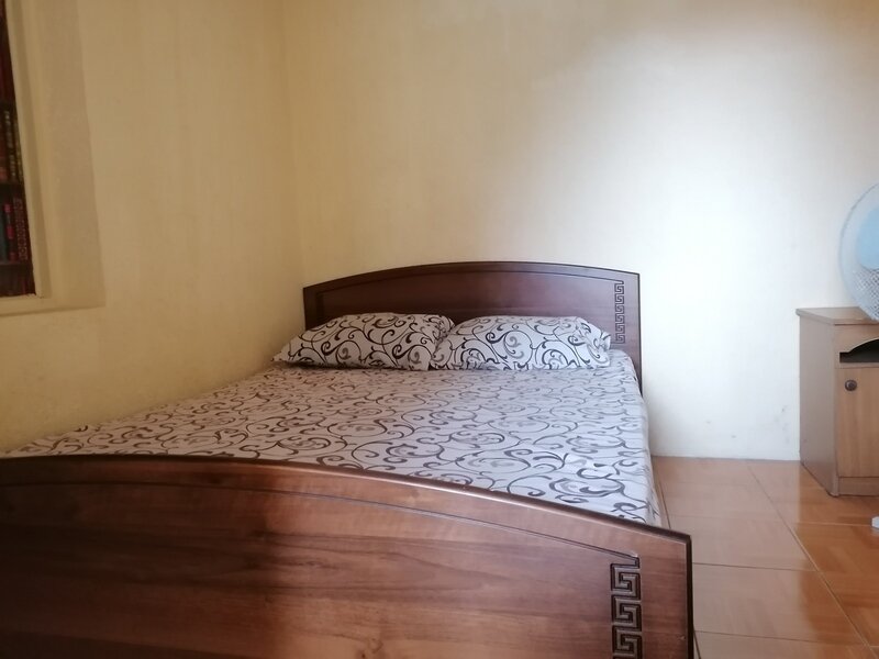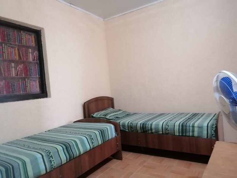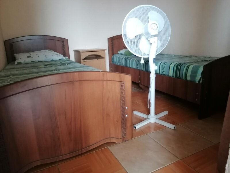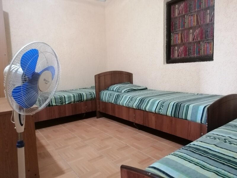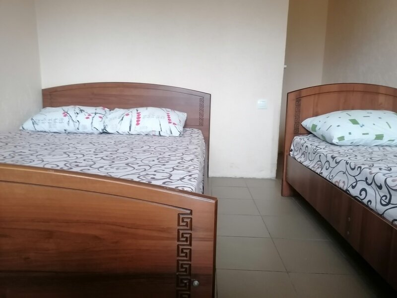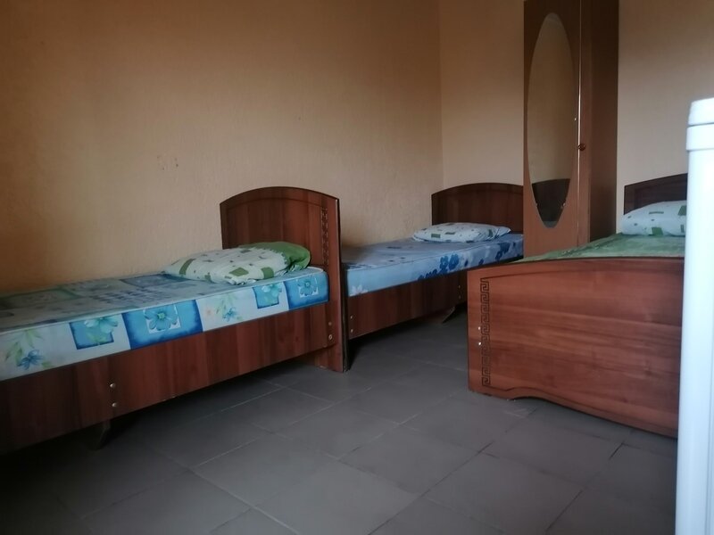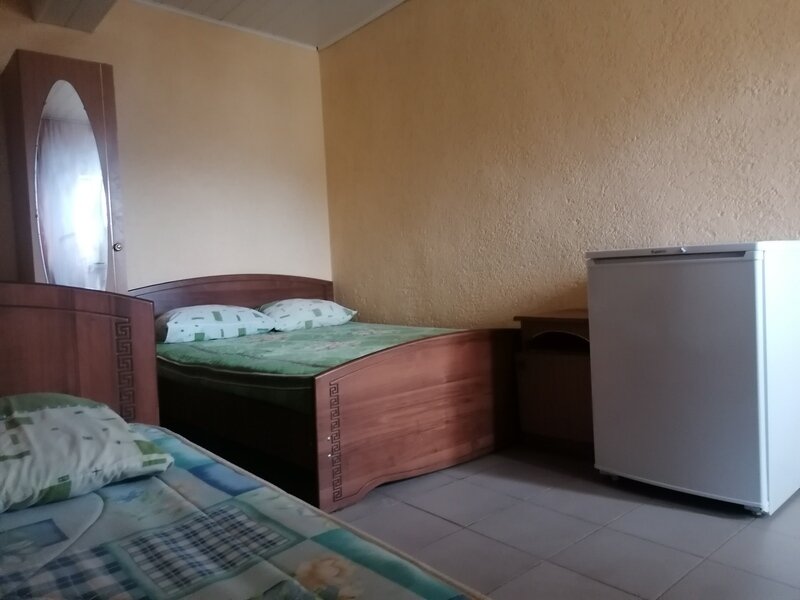 Кровать двуспальная и односпальная, тумбочки прикроватные, кондиционер санузел (душ+туалет) на территории.