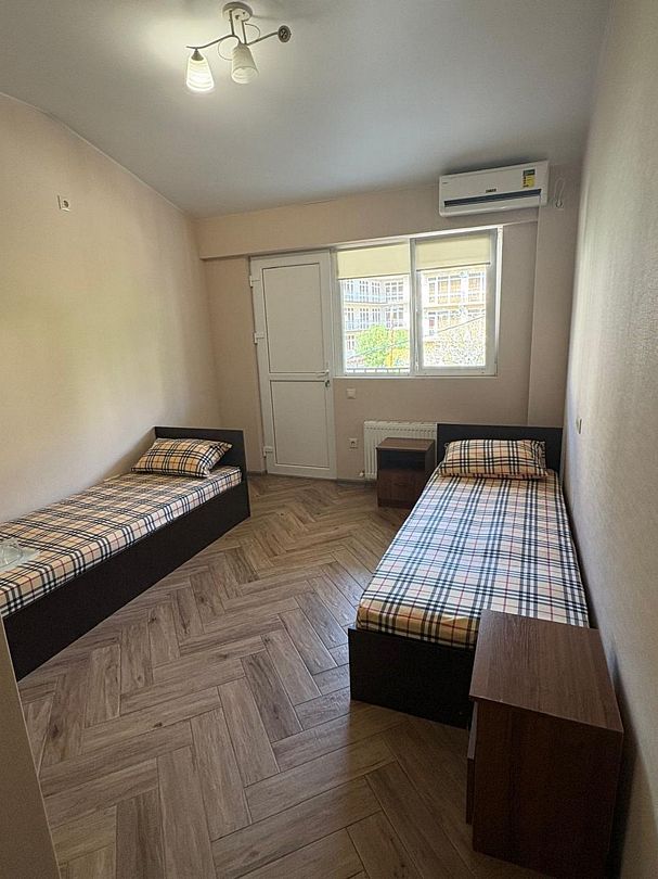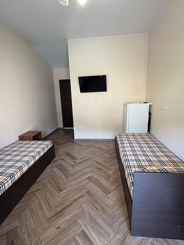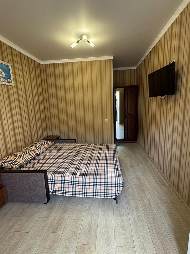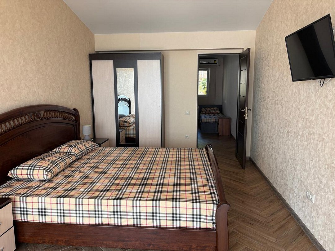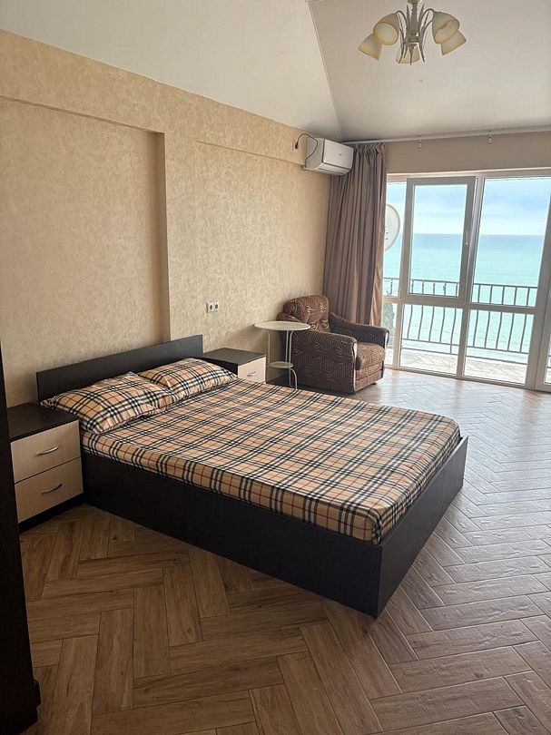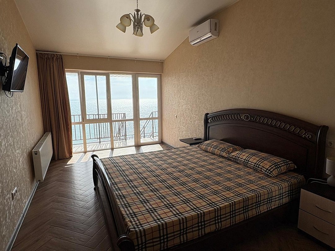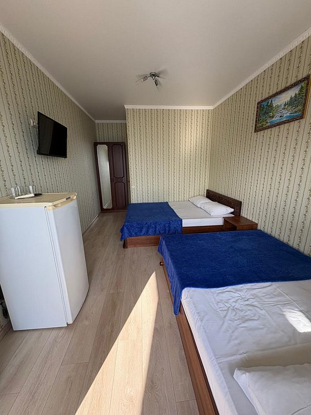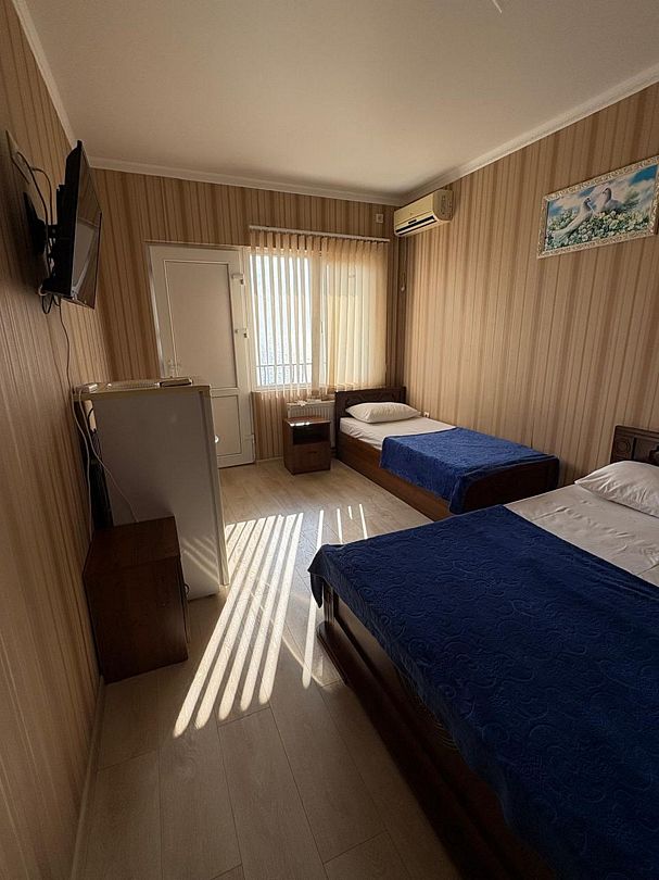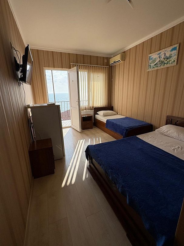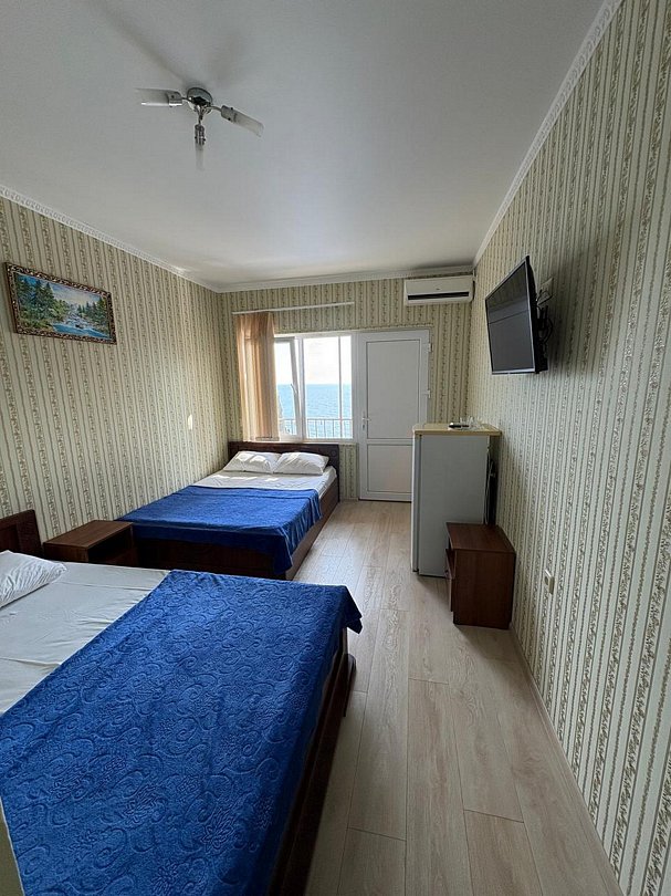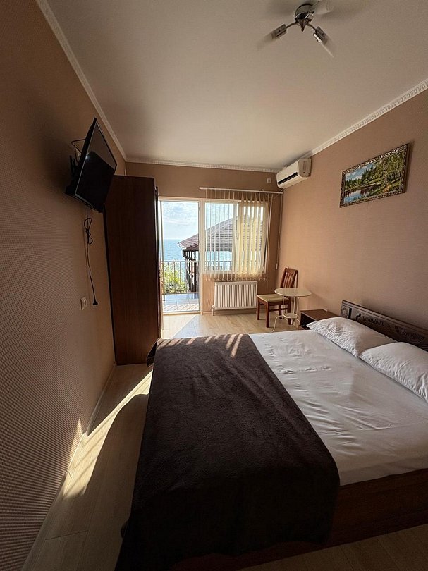 В номере имеется 2 отдельные комнаты, Одна комната с видом на море с панорамными окнами оснащена удобной двуспальной кроватью, прикроватными тумбочками ,журнальным столиком, сплит системой, холодильником, жк телевизором, бельевым шкафом, кресло раскладное (доп. место). Вторая комната с окнами во двор оснащена 2 отдельными кроватями, прикроватными тумбочками, ЖК телевизором. Wi -Fi бесплатно на всей территории.
