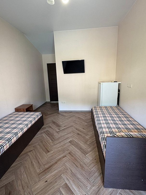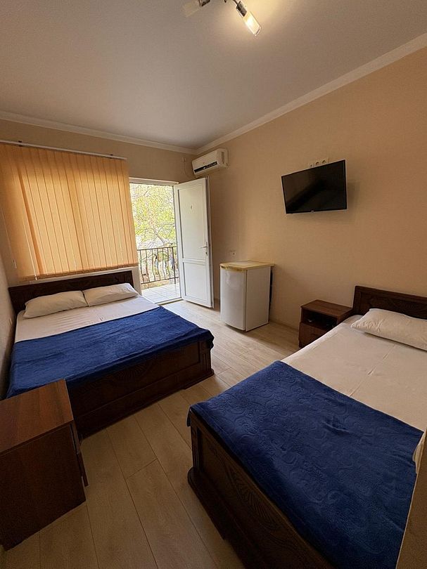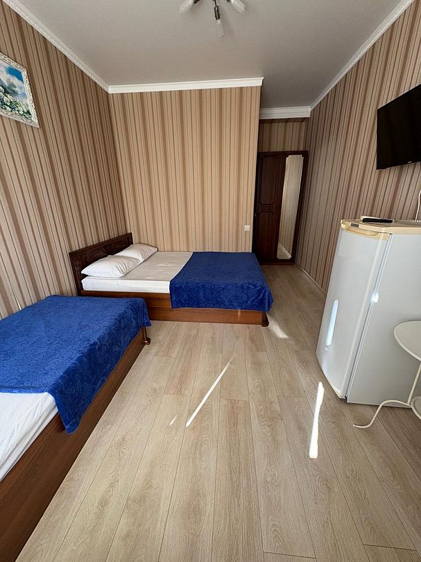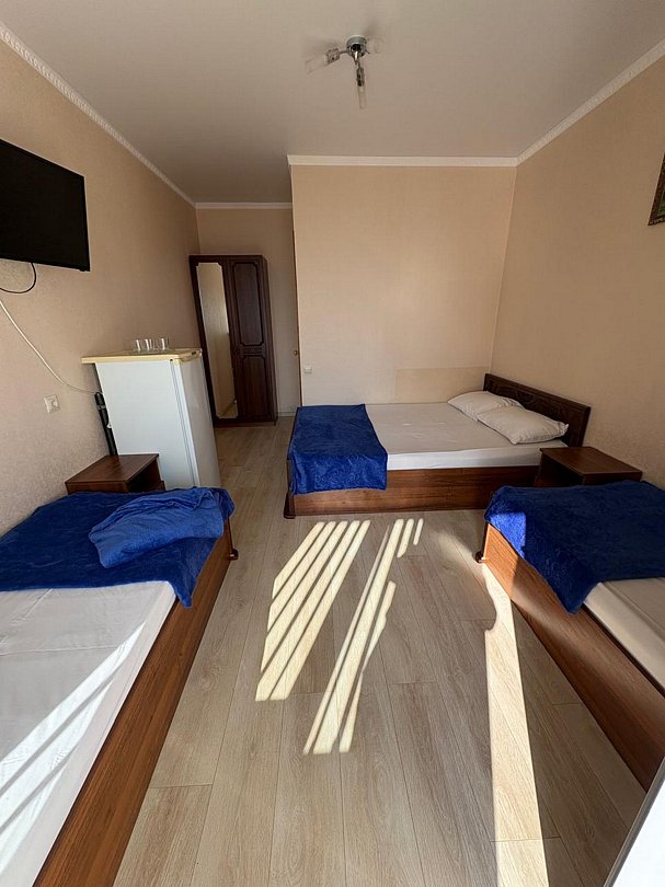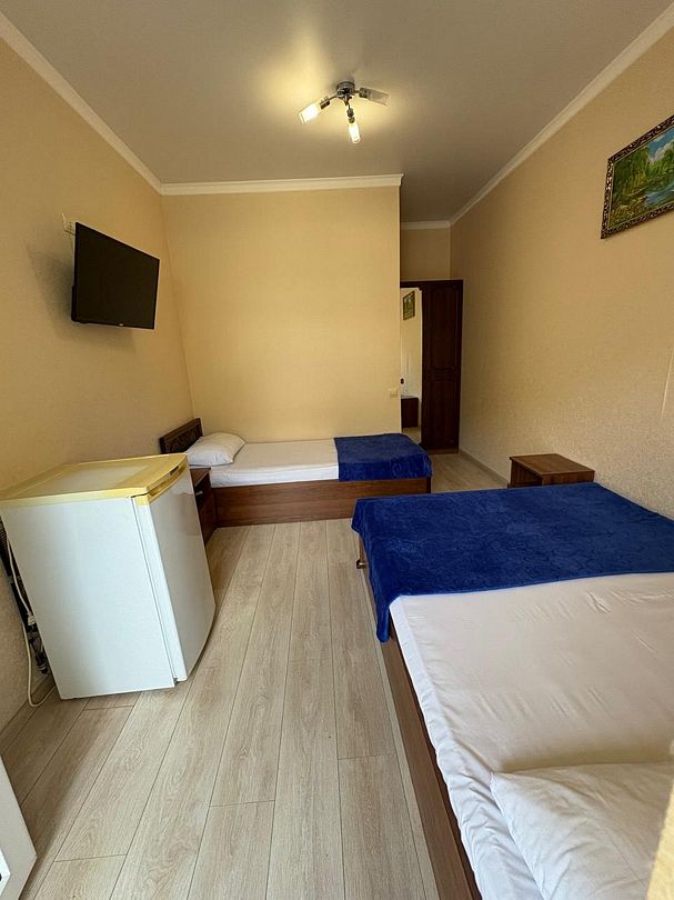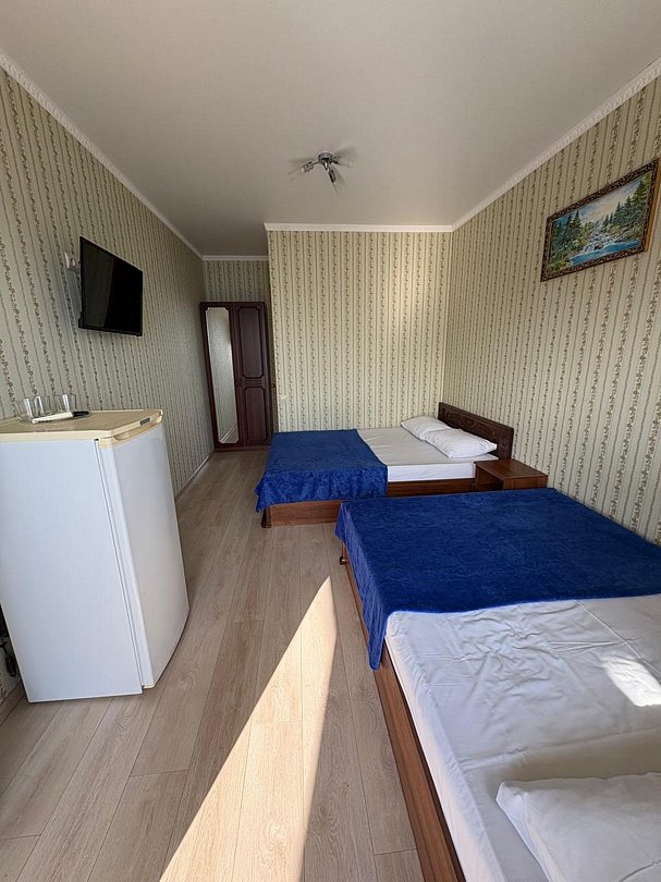 Номер оснащен удобной двуспальной кроватью и 2 односпальными кроватями прикроватными тумбочками, журнальным столиком, сплит системой, холодильником, жк телевизором, бельевым шкафом. Wi-Fi бесплатно на всей территории.