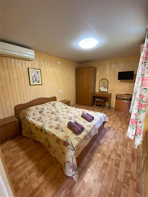 телевизор, Wi-Fi, холодильник, санузел, две односпальные или большая двуспальная кровать, тумбы, стулья, шкаф для одежды, вешалки, зеркало, набор посуды, унитаз, раковина, душ, вид во двор, столовые приборы, стол, сплит-система, цифровое тв, мини-холодильникВ коттедже