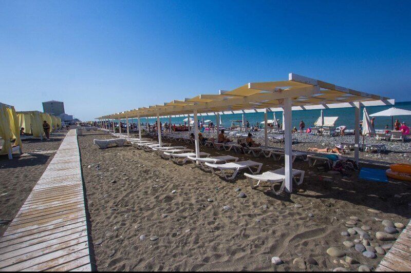 Пляж оборудован всеми необходимыми удобствами и развлечениями как для взрослых так и для детей. На территории пляжа есть Дельфинарий.