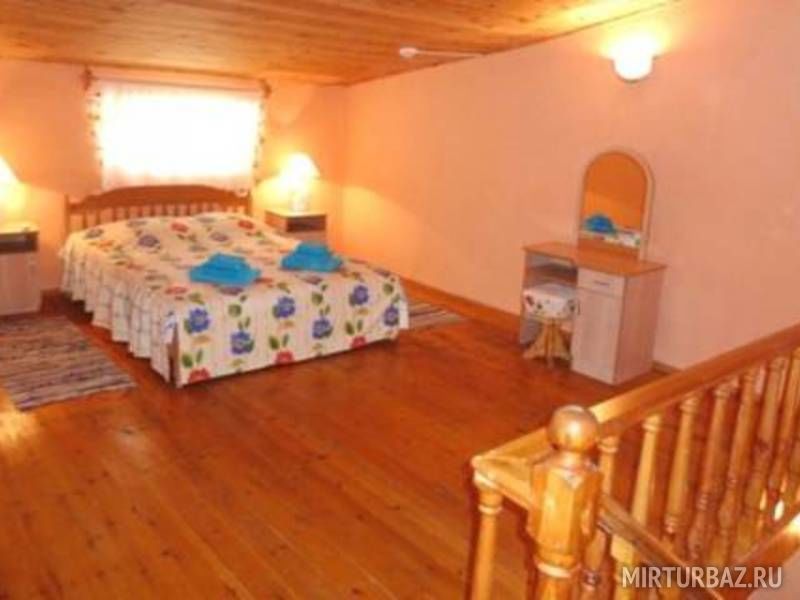 В домике кровати, прикроватные тумбочки, шкаф для одежды, туалетный столик с зеркалом и столиком, журнальный столик, большой диван. Из удобств: телевизор, холодильник, кондиционер, балкон, санузел совмещенный в доме.