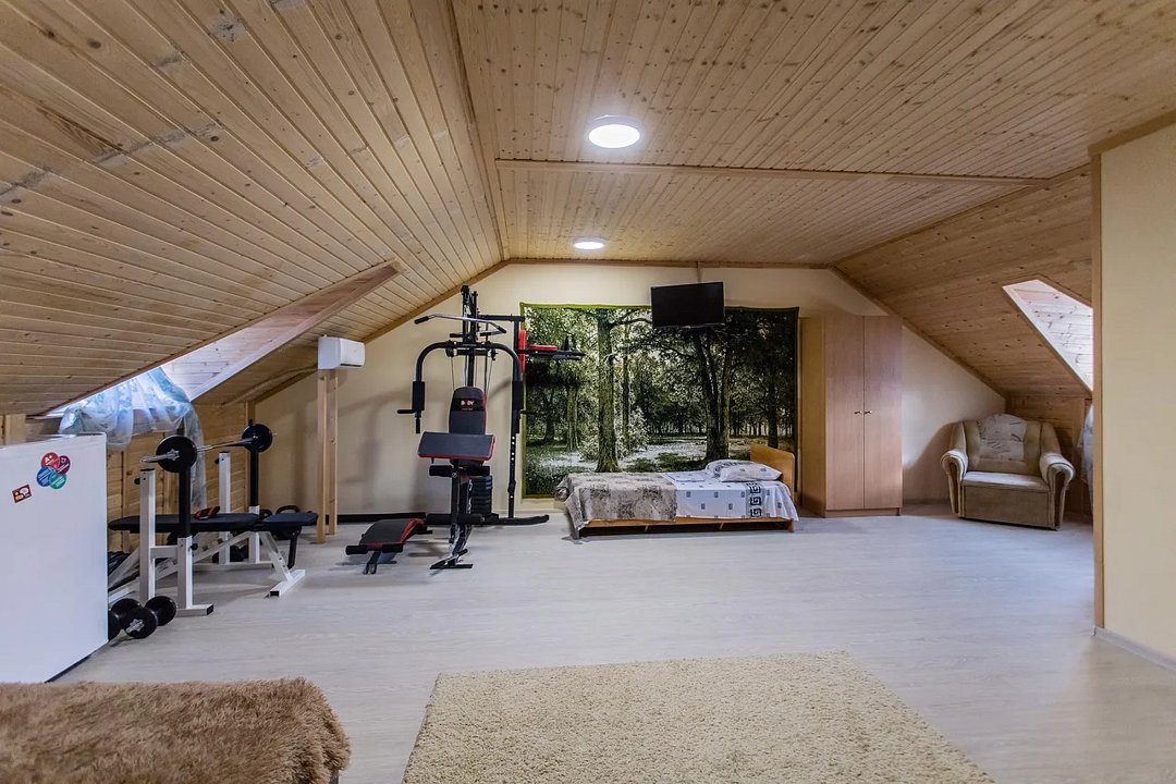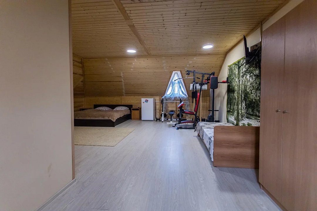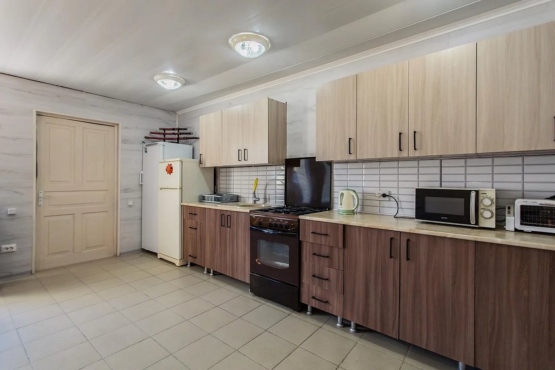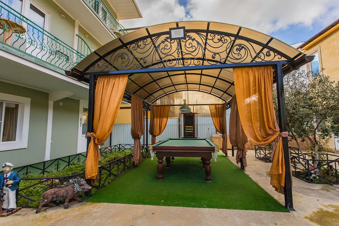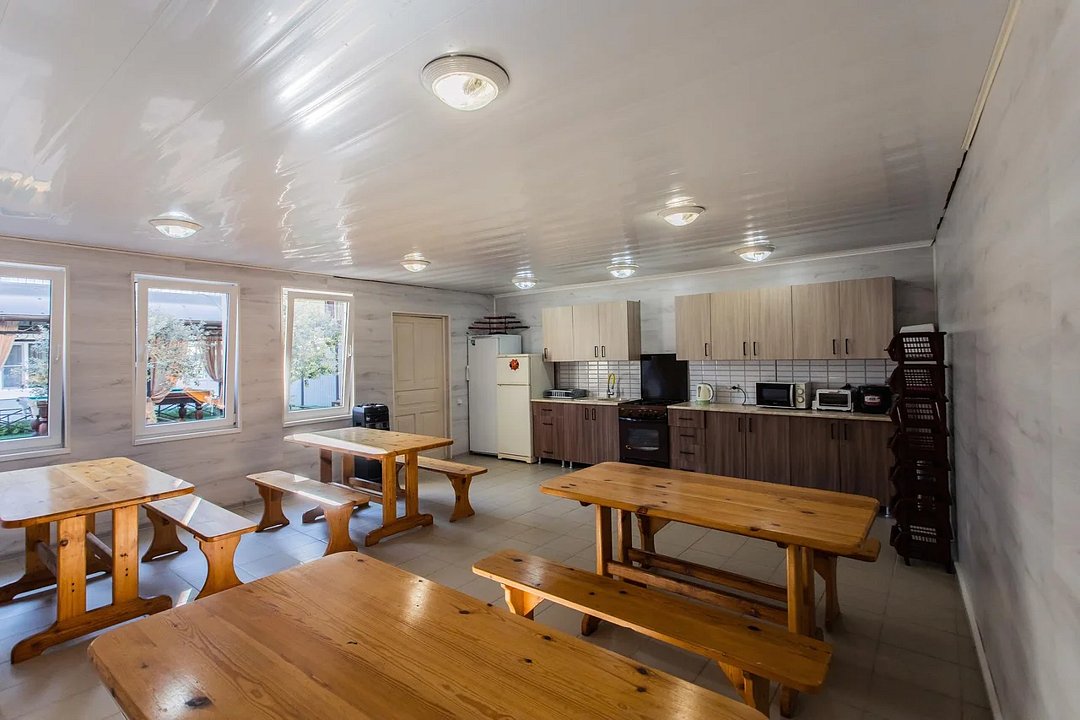 В распоряжении гостей предоставляется общая кухня с бытовыми приборами и обеденной зоной. Для маленьких гостей на территории есть открытый бассейн. Для комфортного времяпрепровождения есть беседка, зона барбекю, где можно приготовить мясо или овощи на мангале, баня, бильярд. Для удобства гостей предусмотрена парковка для автовладельцев с круглосуточным видео наблюдением. На территории гостевого дома есть своя детская игровая зона.