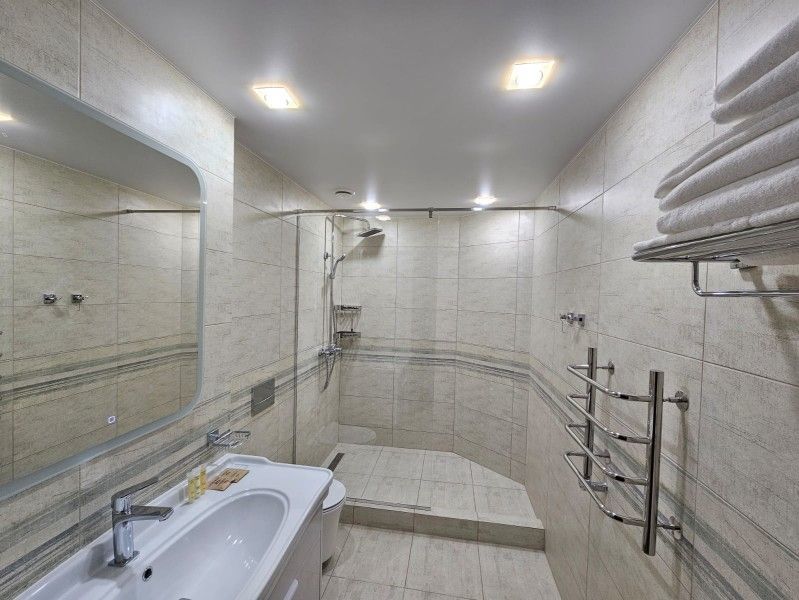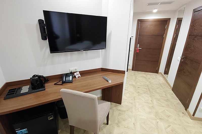Номер оснащен TV 32-45', кондиционером, телефоном, чайной станцией и холодильником. В ванной комнате с подогреваемым полом и современной душевой кабиной есть фен и необходимые гигиенические принадлежности.